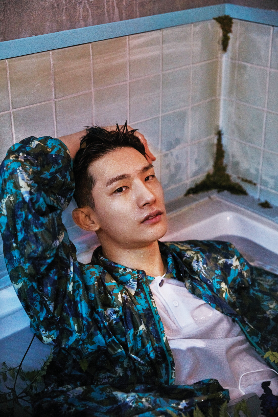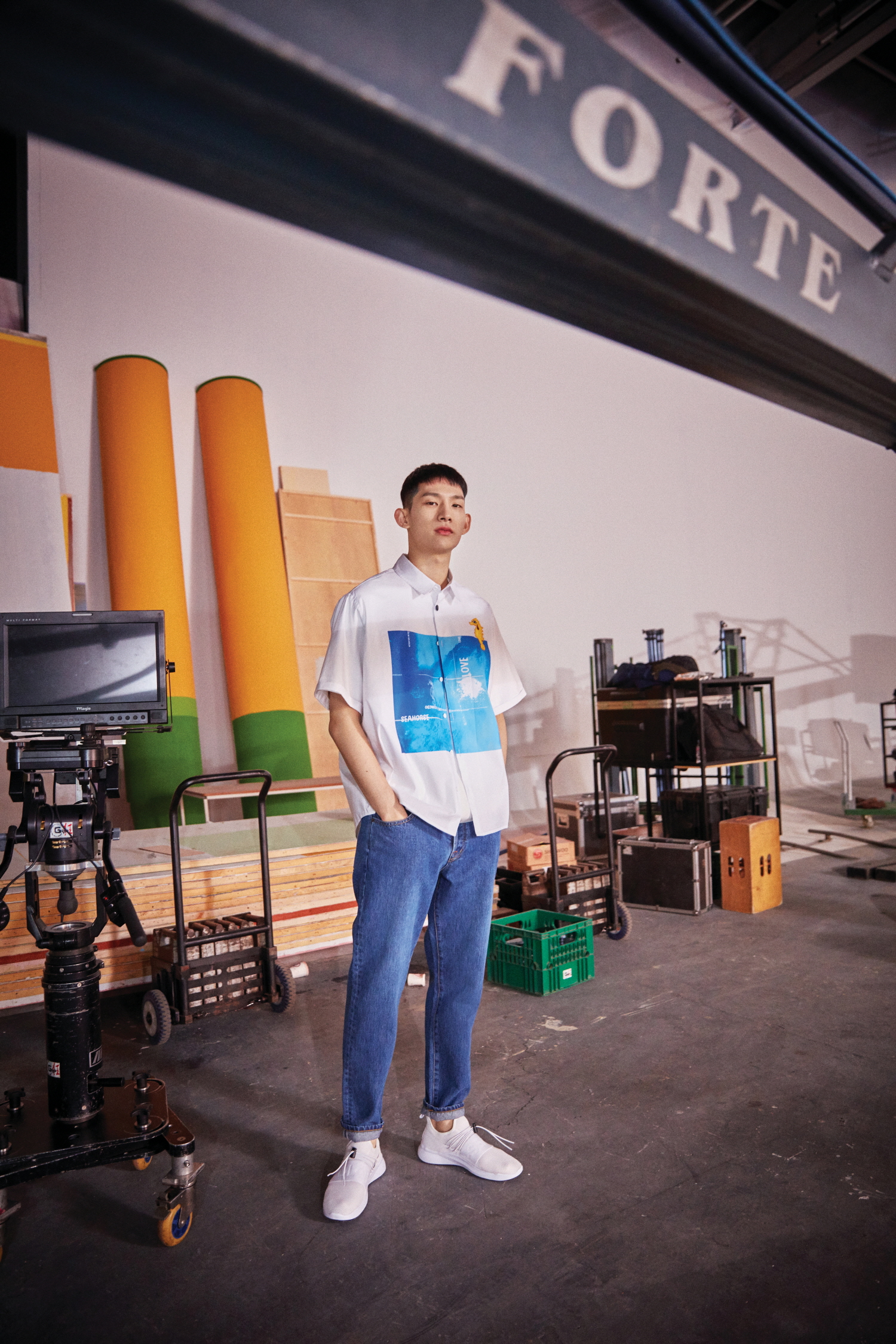 물결치는 파도 무늬의 셔츠는 노아 컬렉션 by 코오롱스포츠(Noah Collection by Kolon Sport), 밴드와 스트링 디자인이 감각적인 화이트 스니커즈는 세이신 by 코오롱스포츠(Kolon Sports + SEISHIN).