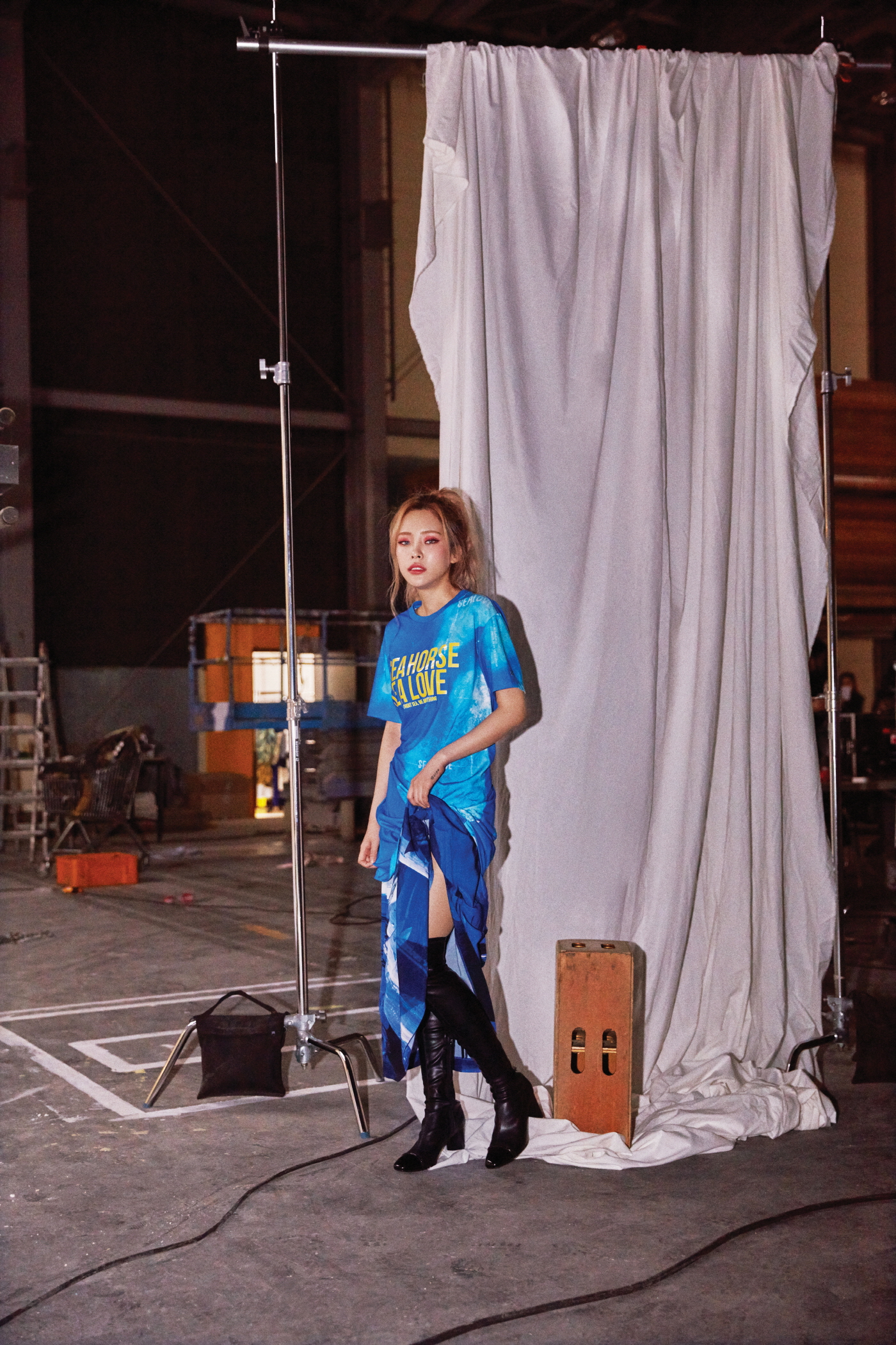 티셔츠 스타일 원피스는 노아 컬렉션 by 코오롱스포츠(Noah Collection by Kolon Sport), 신비로운 심해 모습을 구현한 프린트 스커트는 세이신 by 코오롱스포츠(Kolon Sports + SEISHIN)