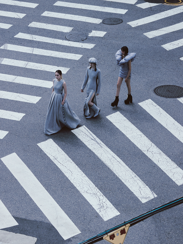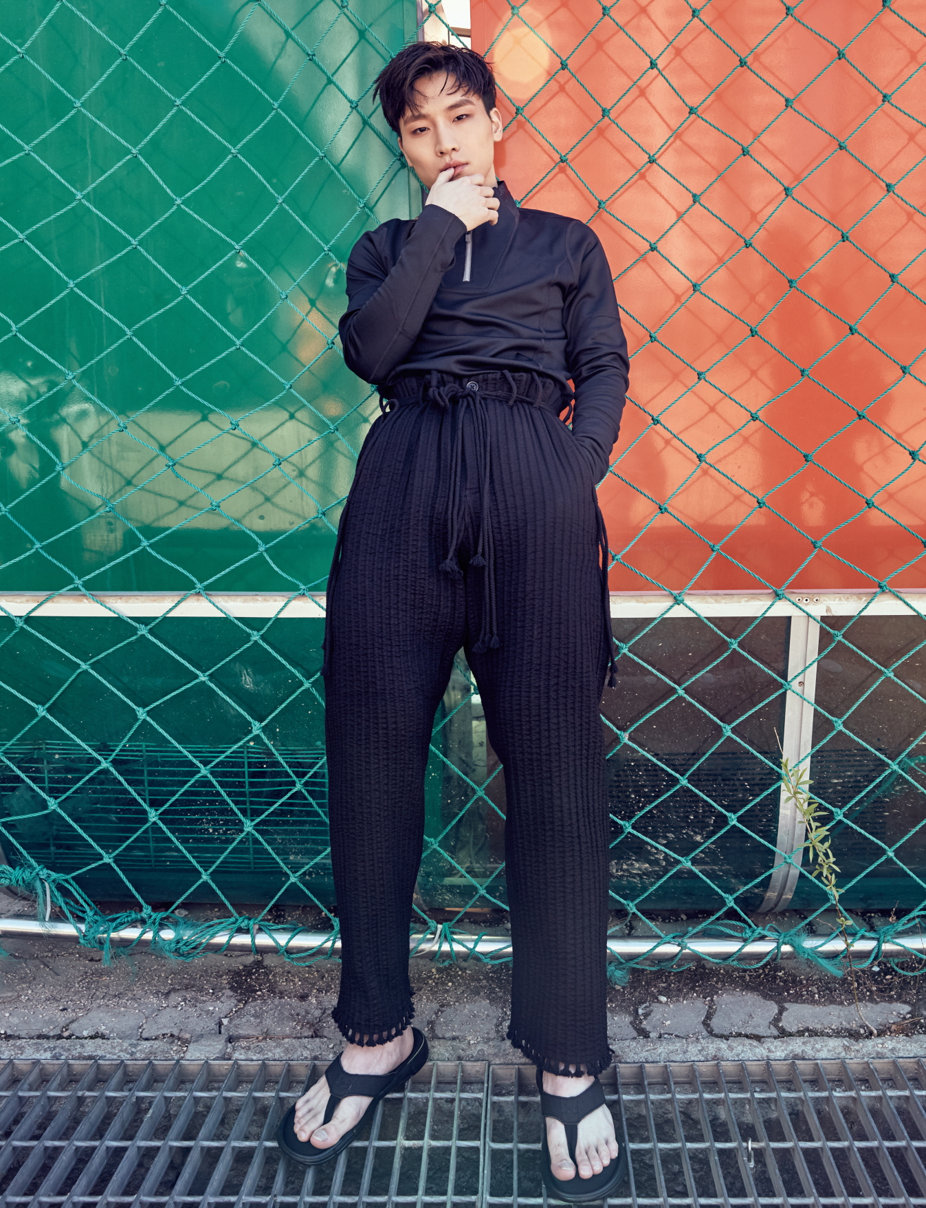 활동성이 좋은 톱과 슬리퍼는 모두 언더아머(Under Armour), 로프 모티브의 와이드 팬츠는 크레이그 그린 by 분더샵(Craig Green by BOONTHESHOP).