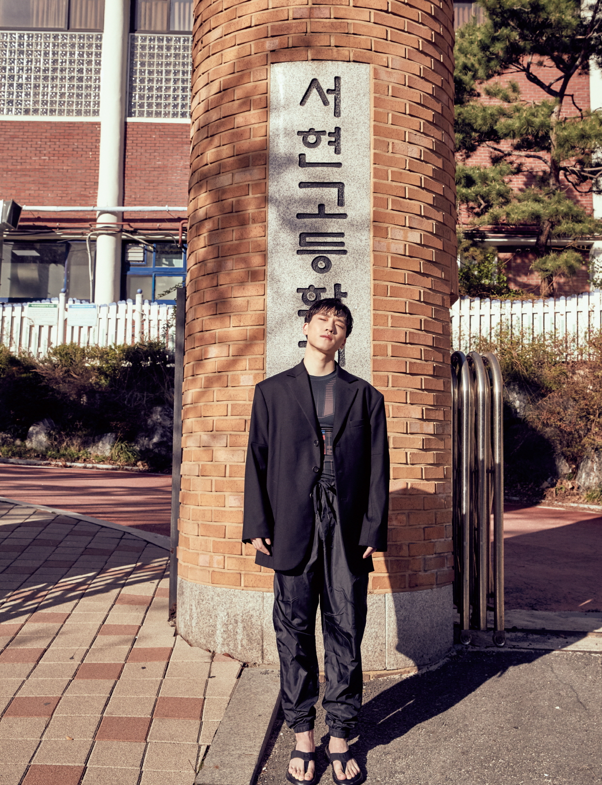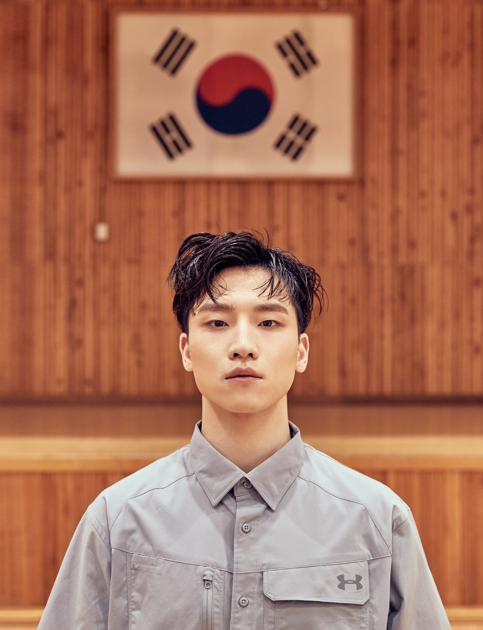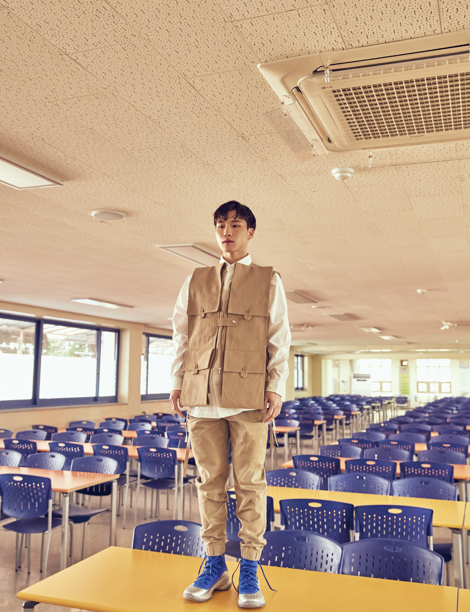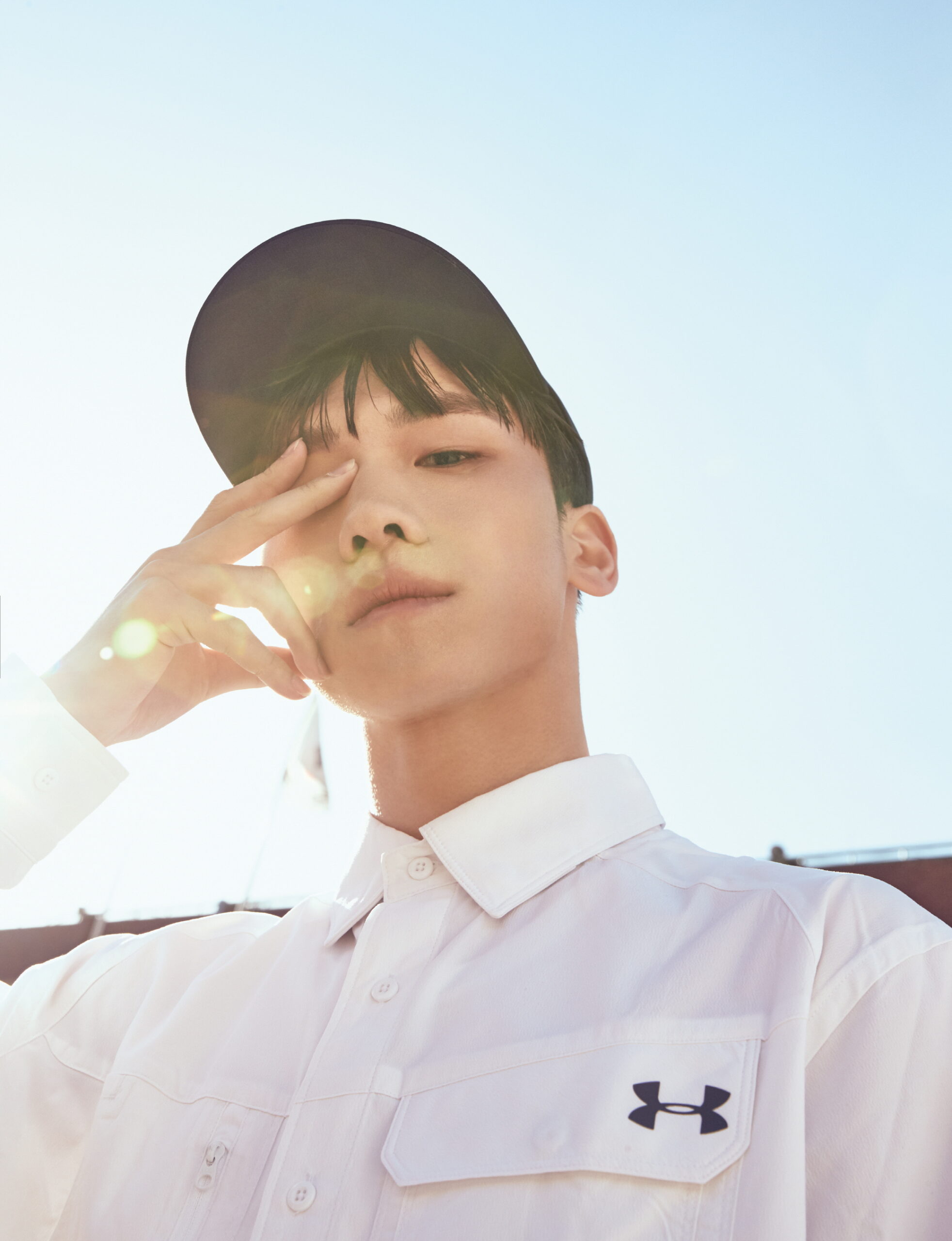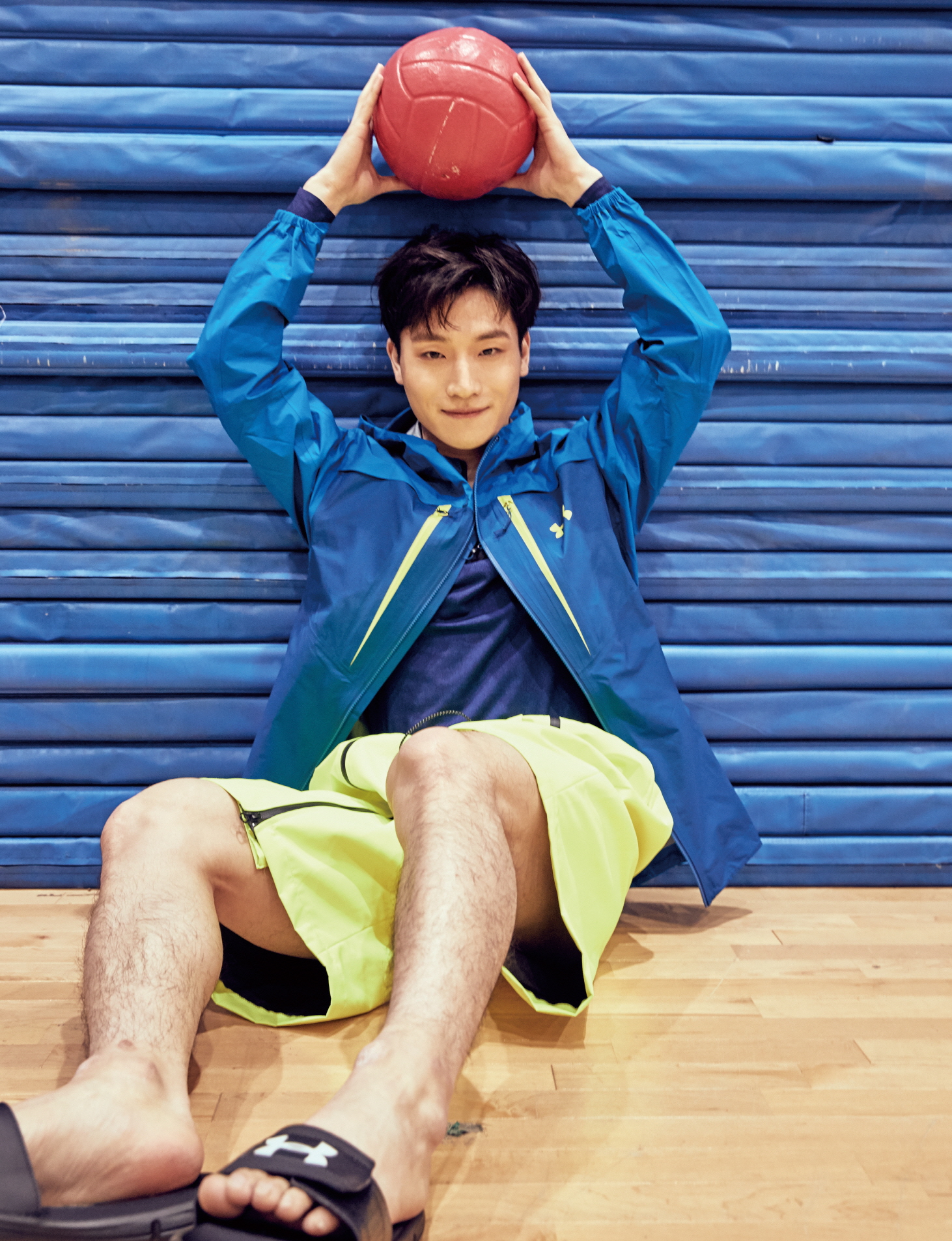 피시 헌터 셔츠와 조거 팬츠, 바스켓볼 슈즈는 모두 언더아머(Under Armour), 포켓이 여러 개 달린 베스트는 린더 by 분더샵(Linder by BOONTHESHOP).
