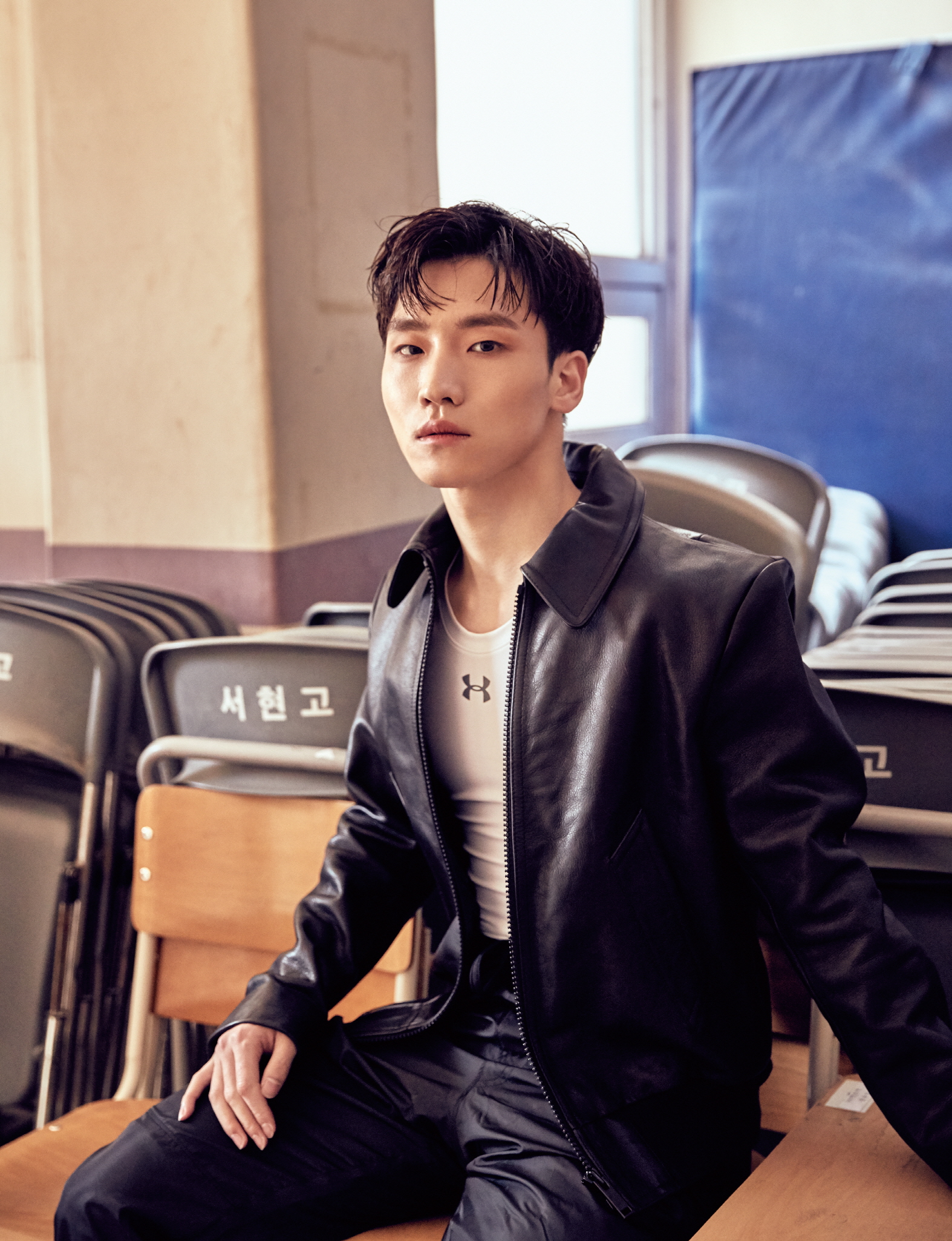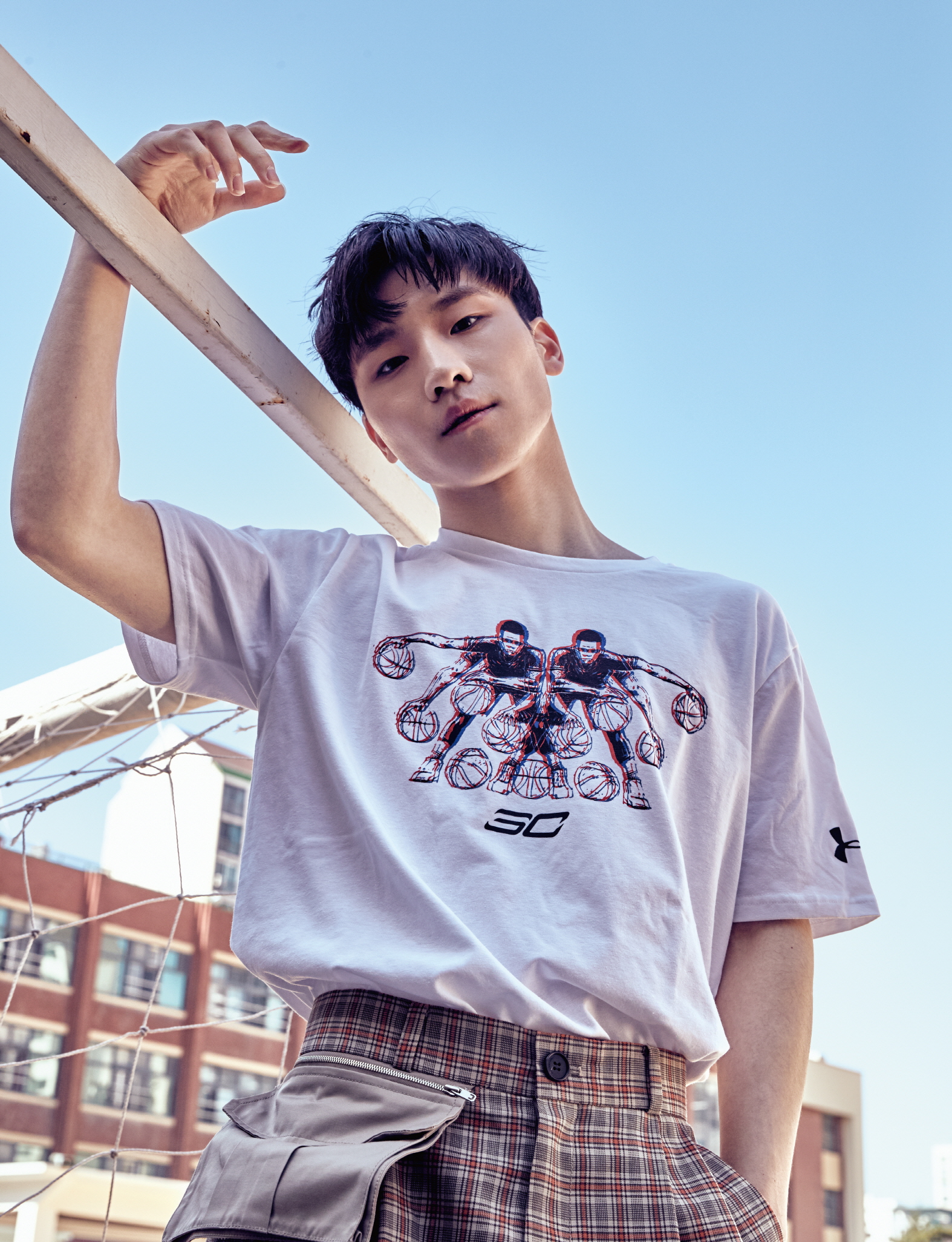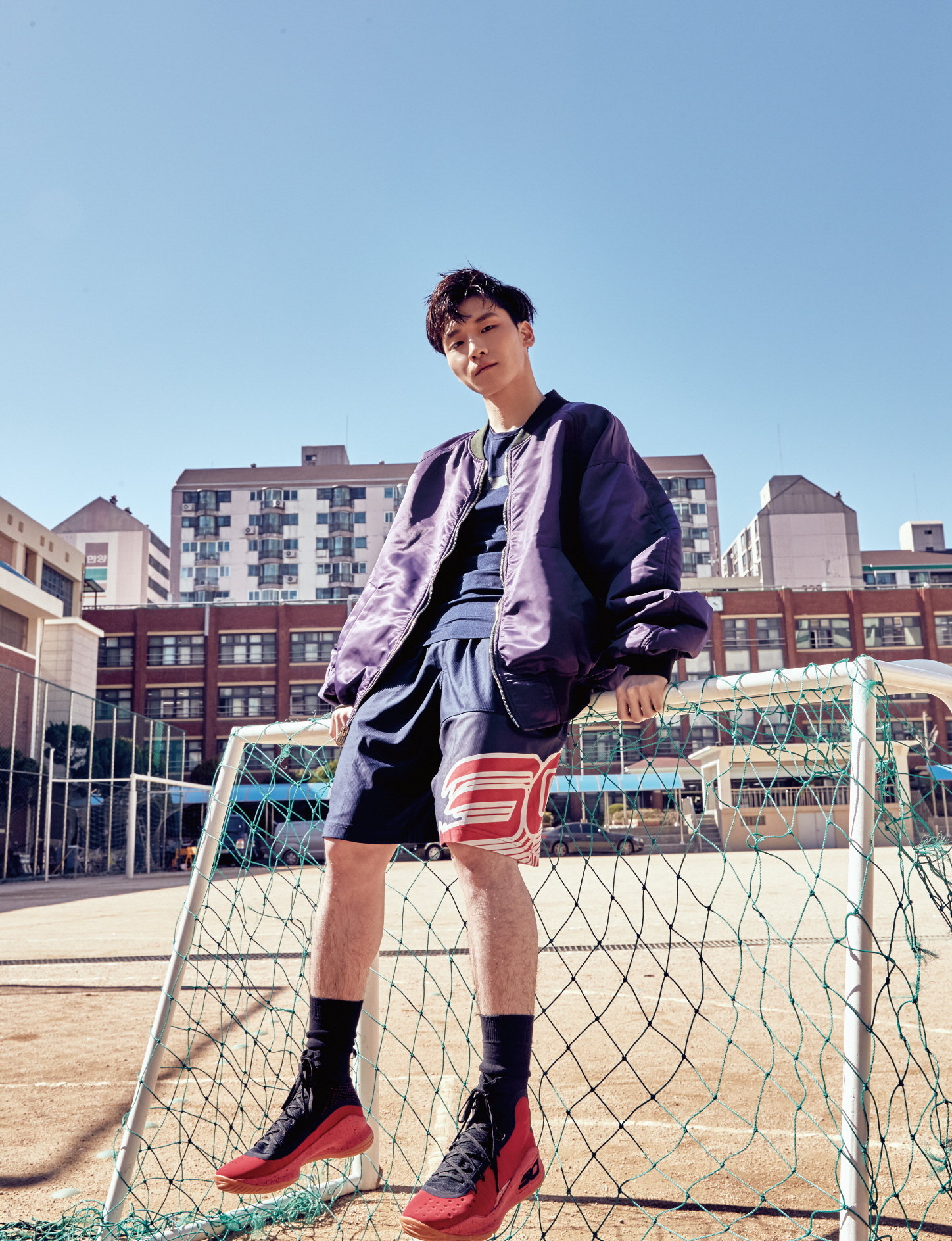 피트 티셔츠, 스테판 커리 컬래버레이션 바스켓볼 쇼츠와 스니커즈는 모두 언더아머(Under Armour), 오버사이즈 보머 재킷은 준지(Juun. J).
