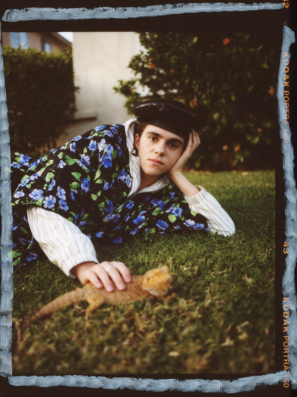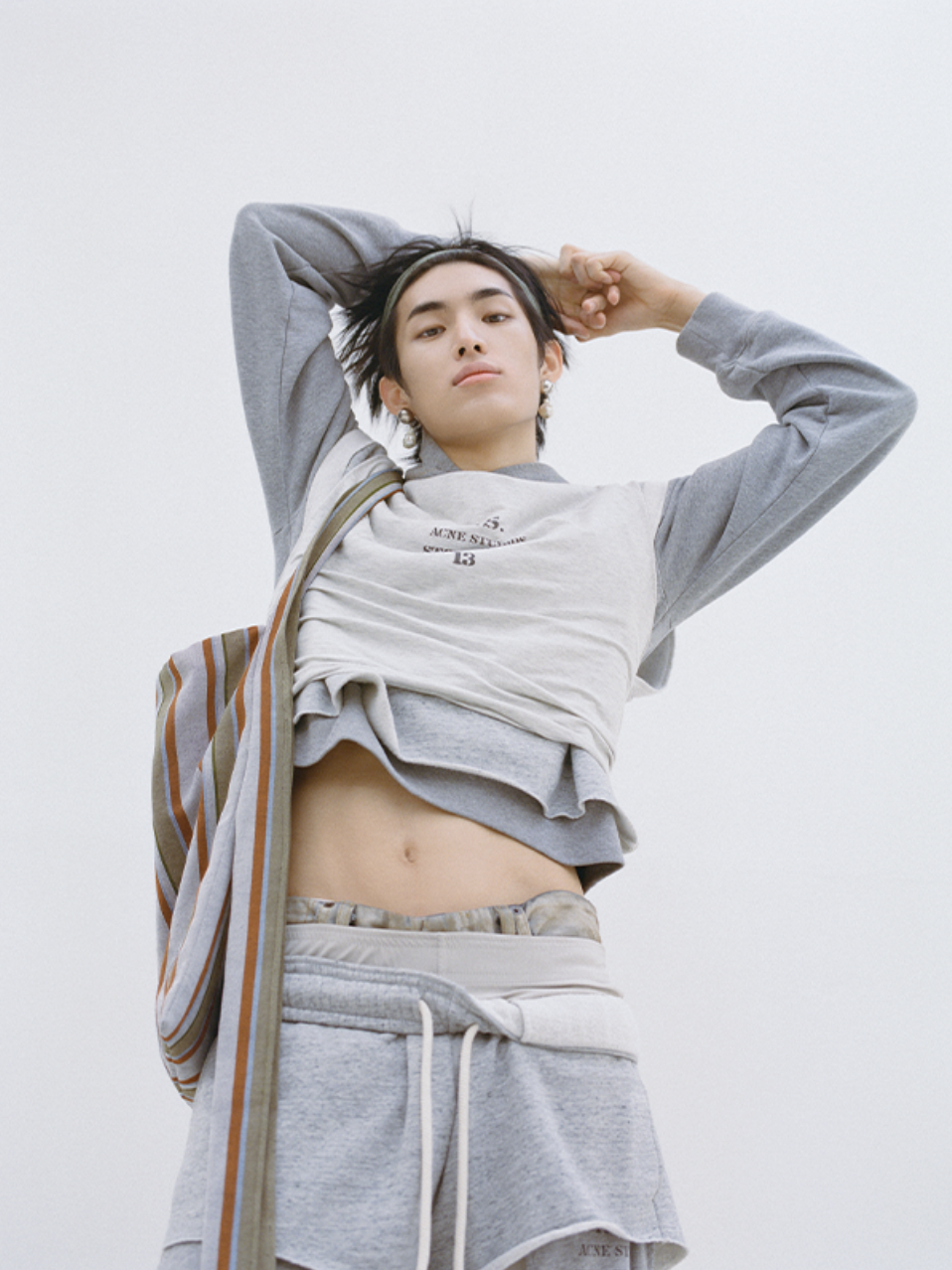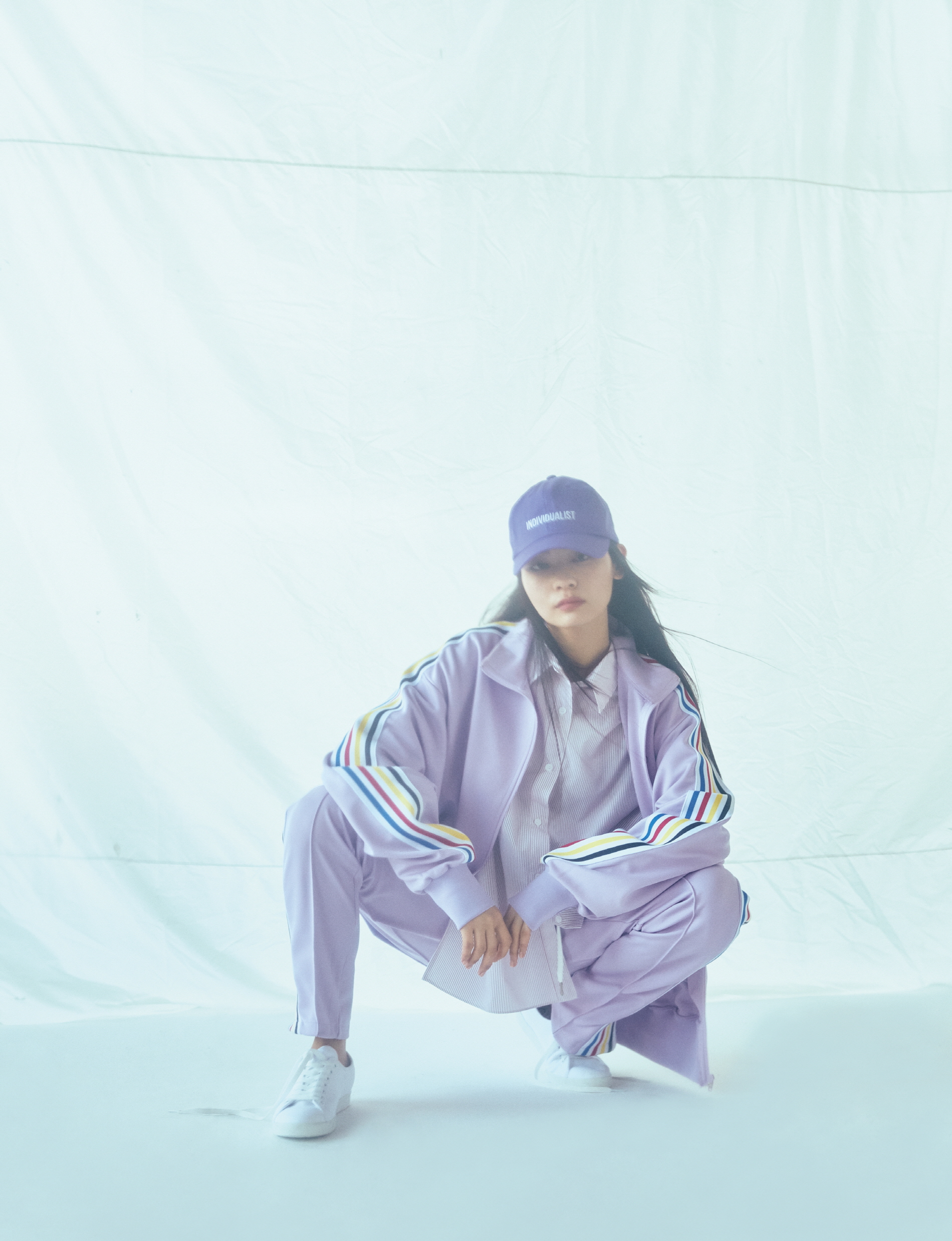 연보라색 저지 재킷과 트랙 팬츠, 보라색 볼 캡은 모두 MSKN2ND, 안에 입은 스트라이프 셔츠는 링 마이 벨(Ring My Bell).