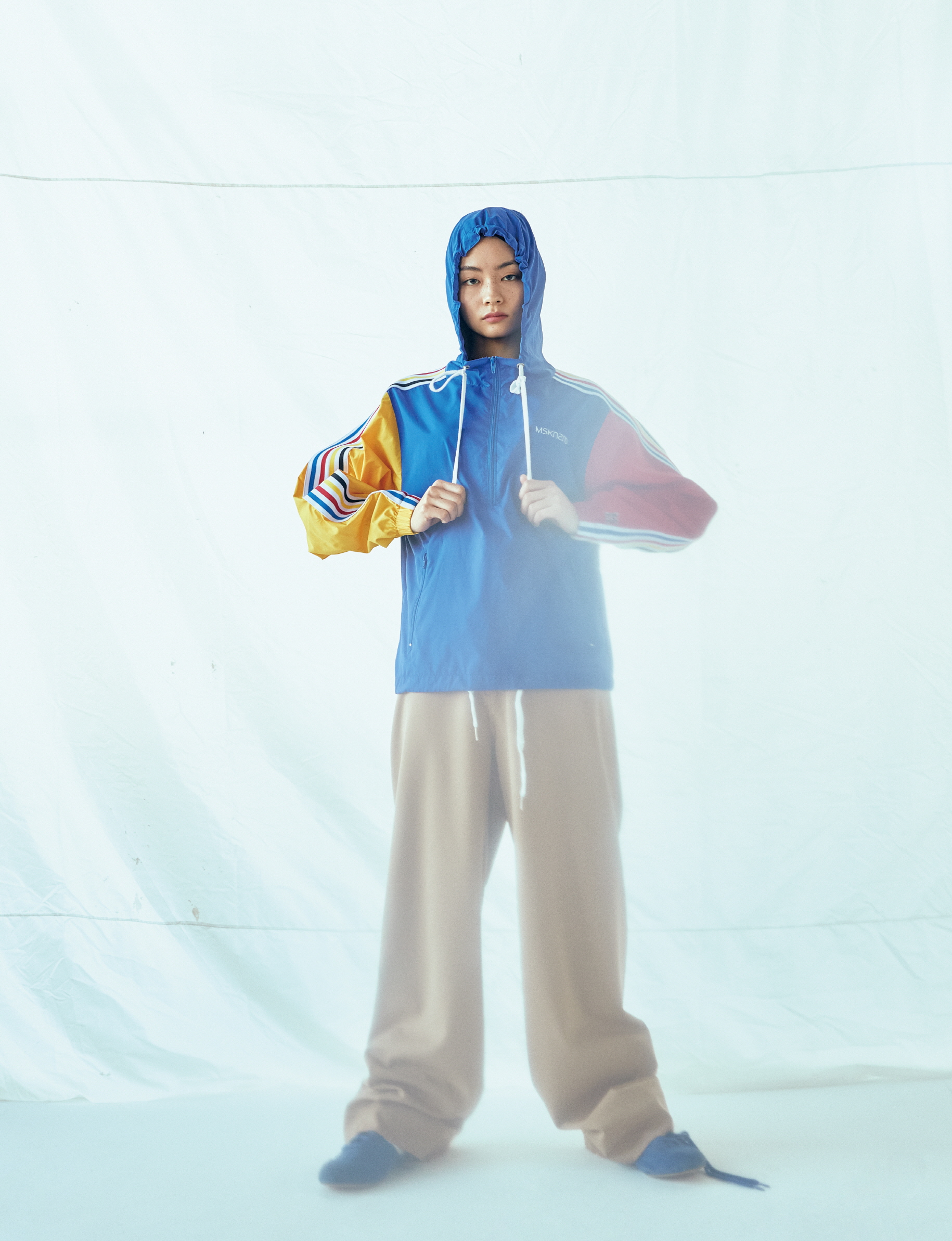 컬러 블록이 특징인 아노락 점퍼와 오버사이즈 와이드 팬츠는 MSKN2ND.