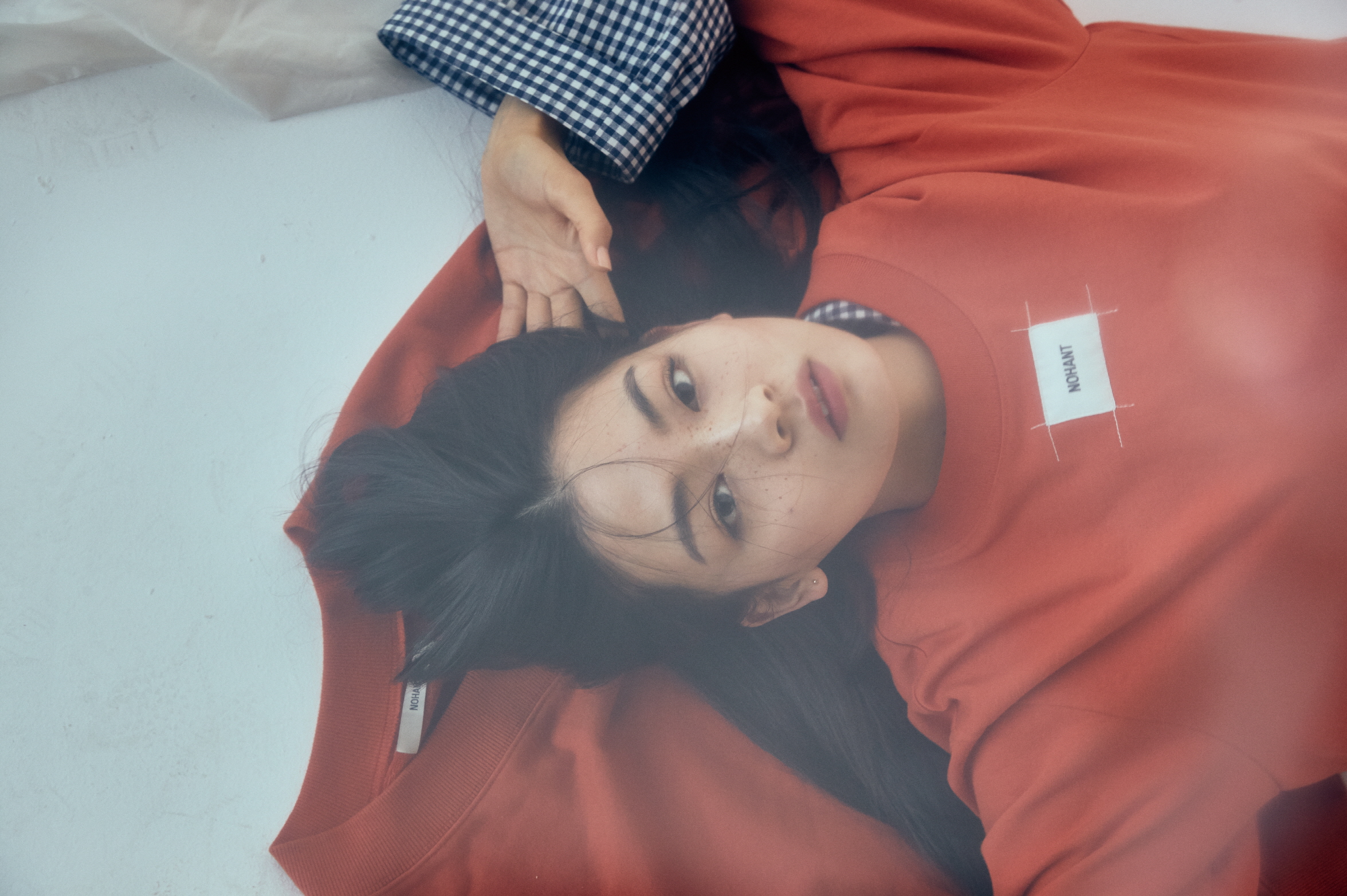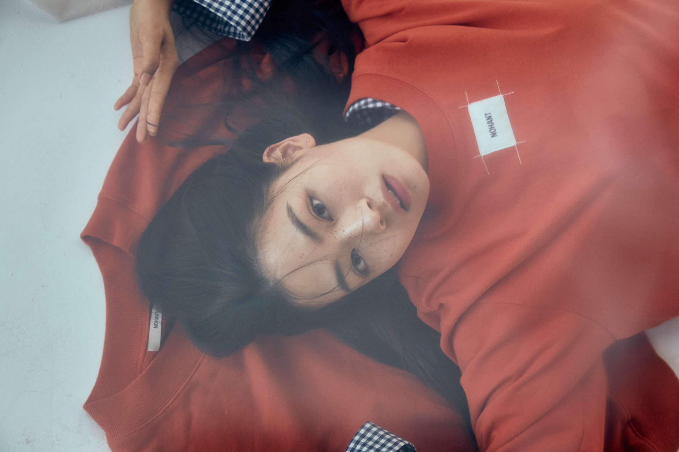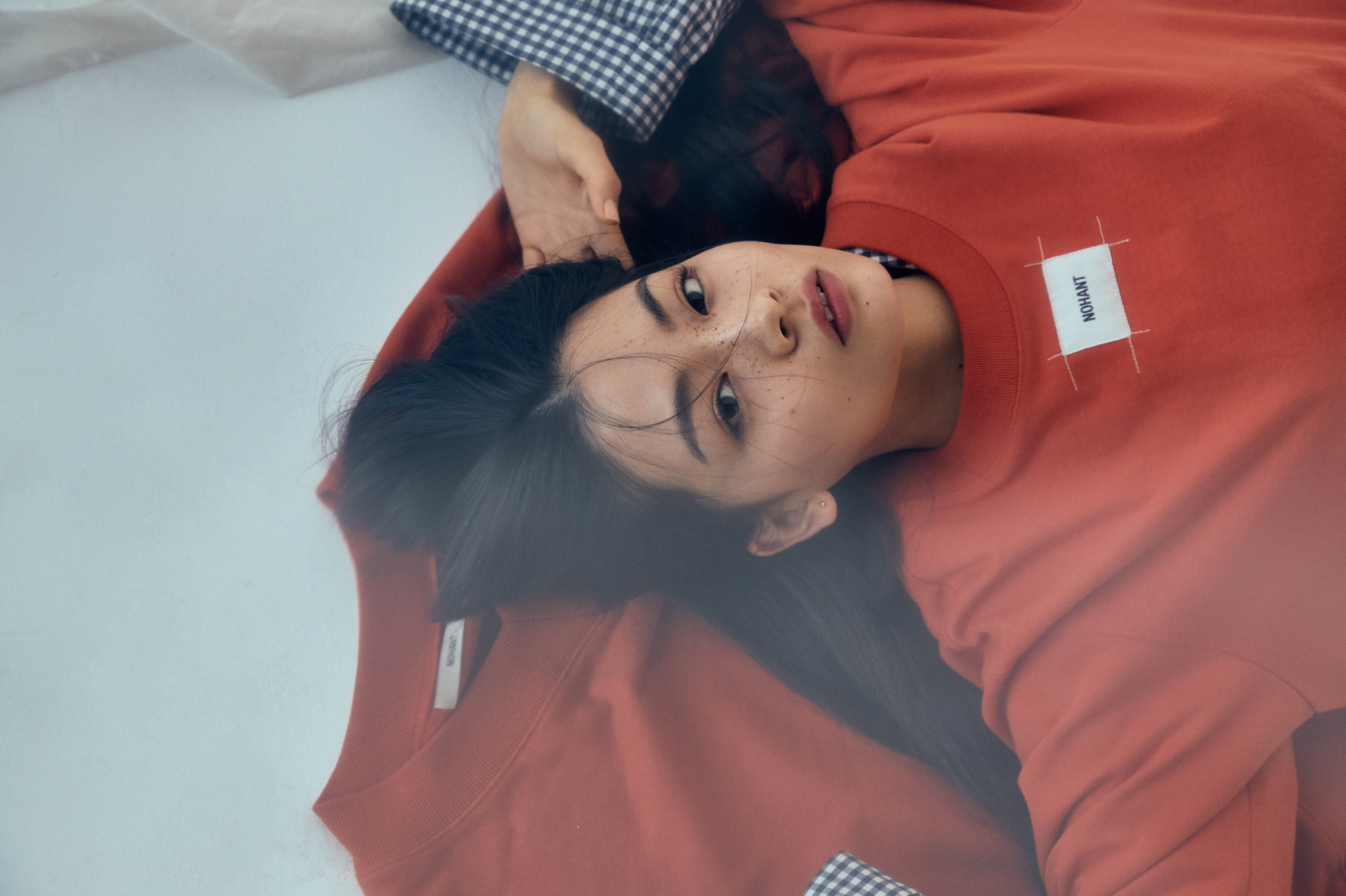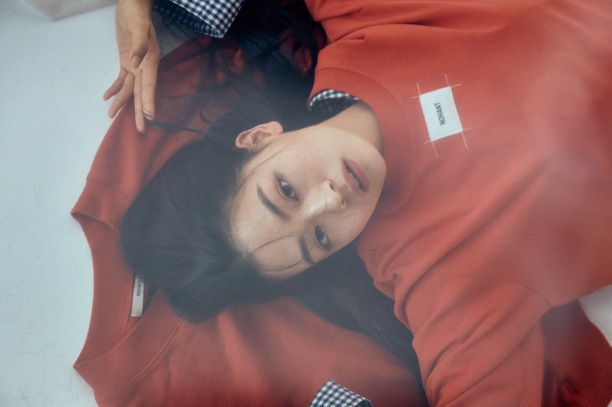 주황색 티셔츠와 바닥의 맨투맨, 레이어드한 체크 셔츠는 모두 노앙(Nohant).