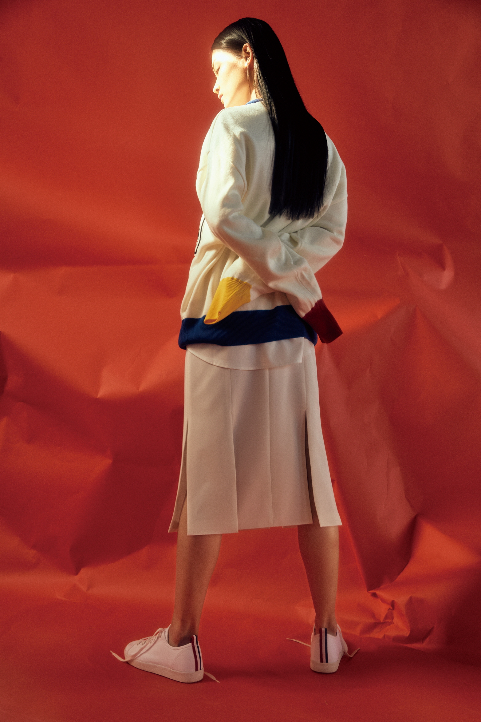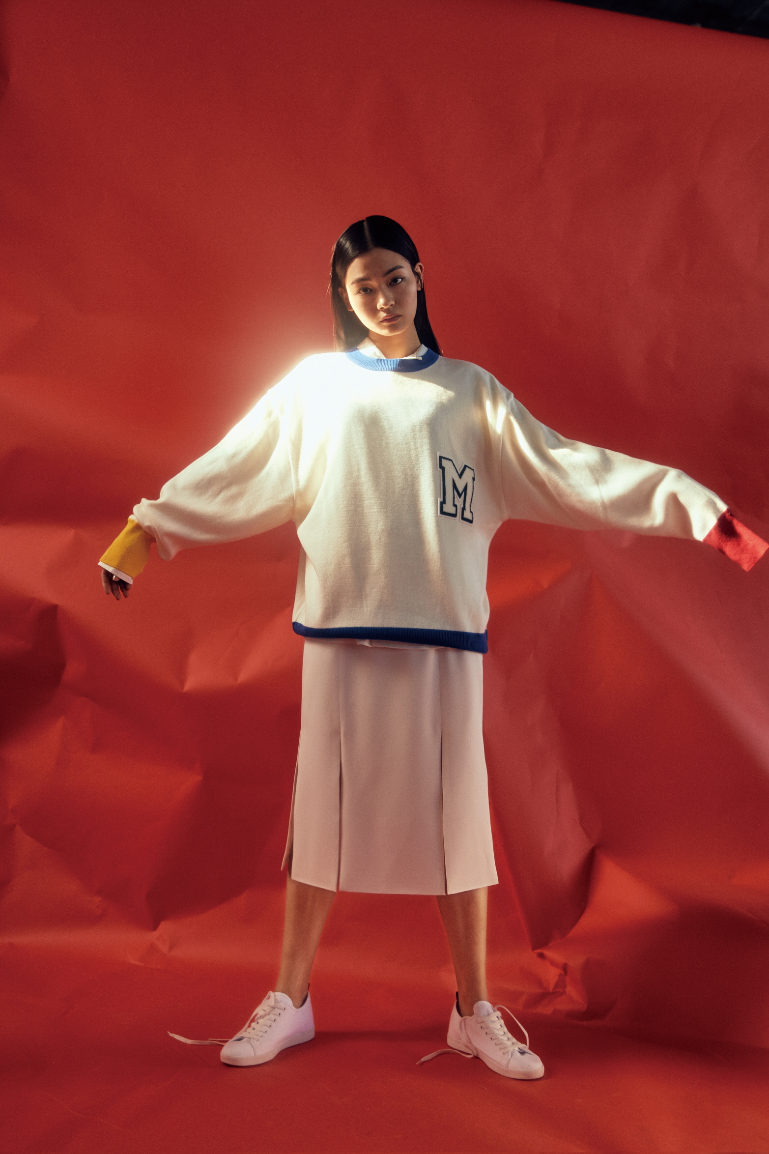 소매의 배색이 특징인 니트 톱과 안에 입은 셔츠는 MSKN2ND, 화이트 슬릿 스커트는 르윗(Lewitt).