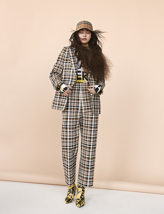 체크 재킷과 팬츠, 그라피티 패턴 톱과 슈즈, 볼 캡은 모두 버버리(Burberry) 2018 F/W 프리 컬렉션.