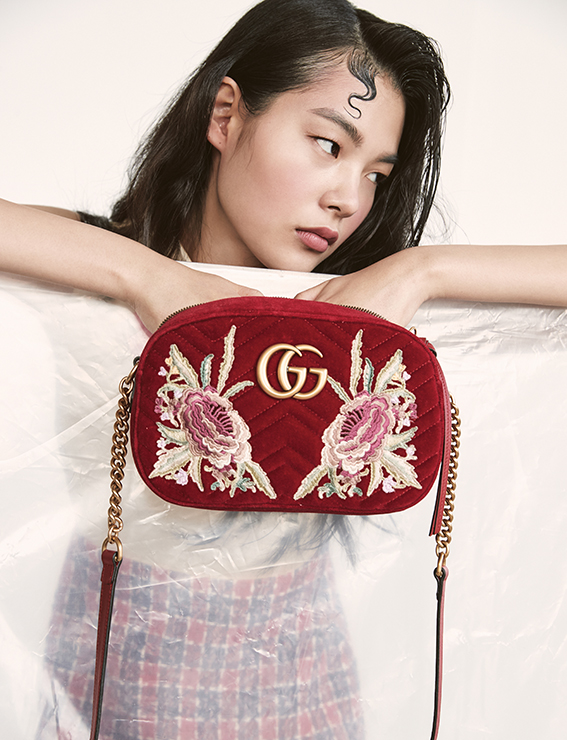 변화를 꾀한 것. 붉은 스웨이드 소재와 퀼팅 디테일, 르네상스 시대를 떠올리게 하는 화려한 자수 장식은 알레산드로 미켈레가 구축한 구찌 하우스를 함축해놓은 듯하다. 메탈 더블 ‘G’ 로고는 가방의 중앙에 장식해 은은하지만 유난스럽게 빛난다.