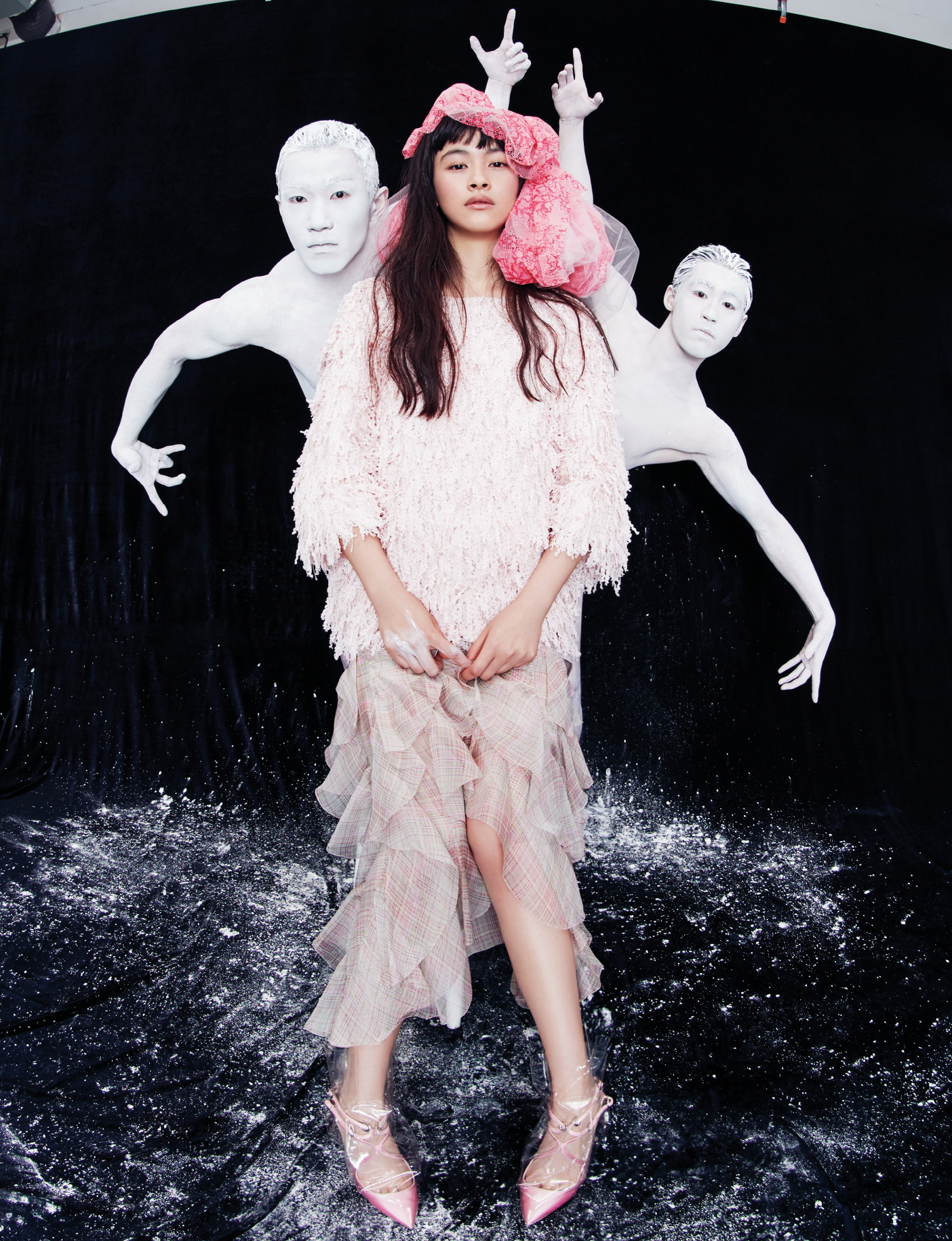투명 PVC로 덮은 핑크 새틴 샌들은 지미추 X 오프화이트(Jimmy Choo X Off-White), 헤드피스로 사용한 핑크 샤 스커트는 버버리(Burberry).