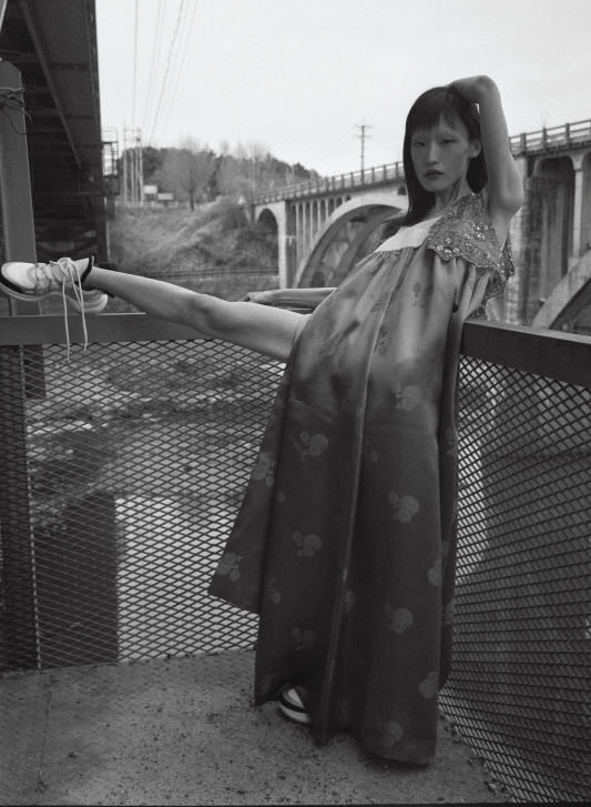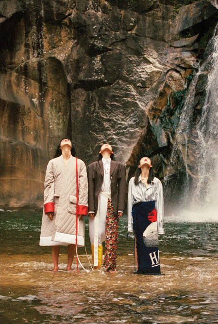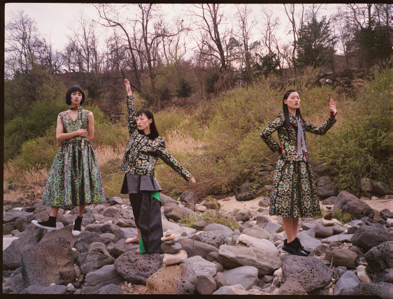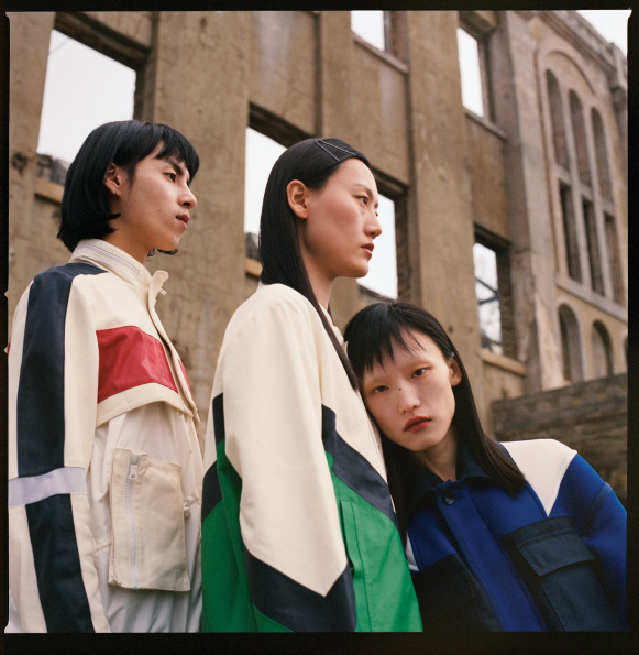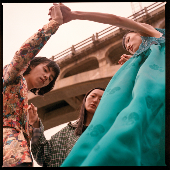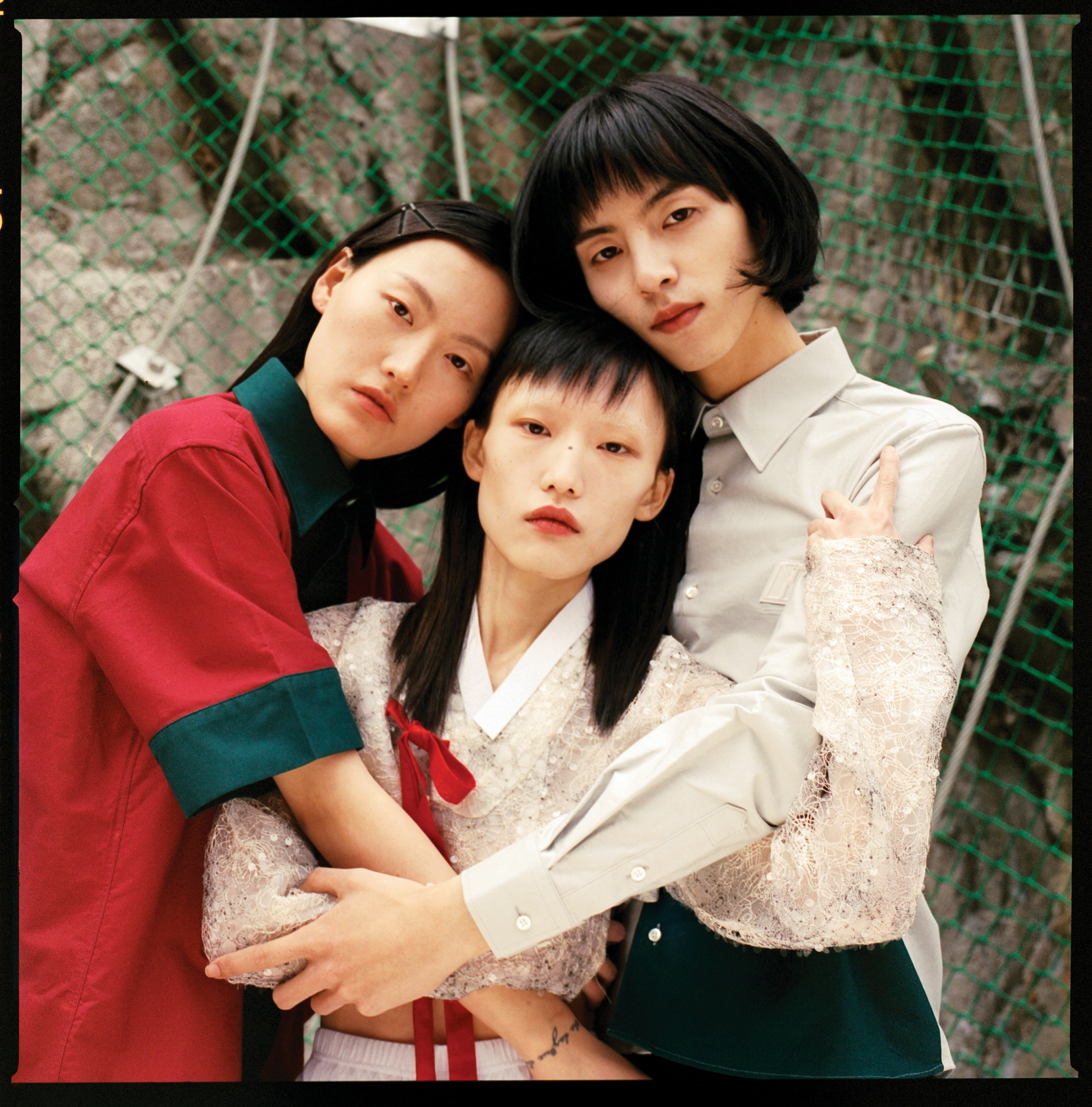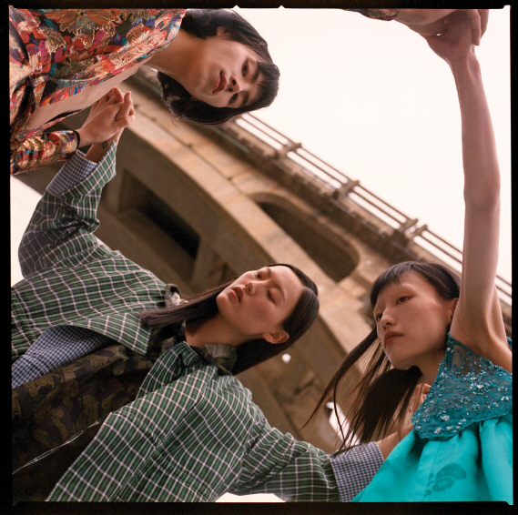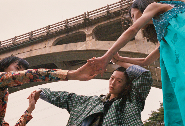 세 모델이 입은 한옥을 닮은 옷은 모두 민주킴(Minjukim), 검정 스니커즈는 모두 닐 바렛(Neil Barrett).
