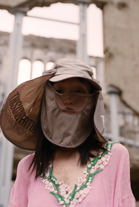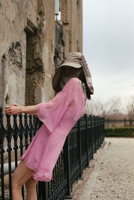 꽃분홍 원피스는 블루마린(Blumarine), 하이킹 모자는 디스이즈네버댓(Thisisneverthat).