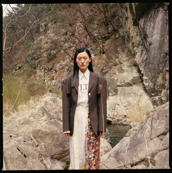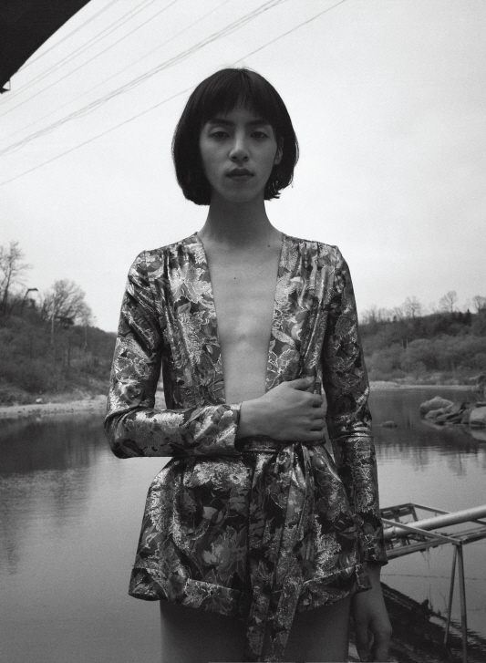 재킷과 보석으로 장식한 비대칭 팬츠는 키준(Kijun), 안에 입은 화이트 셔츠는 발렌티노(Valentino), 한복 안에 입는 속바지는 김혜순한복(kimhyesoon).