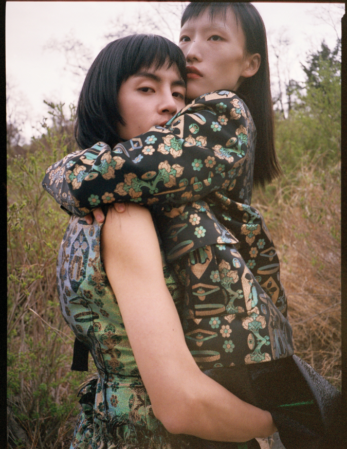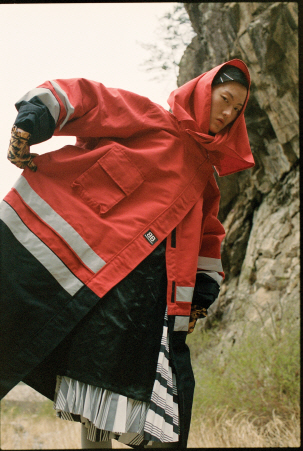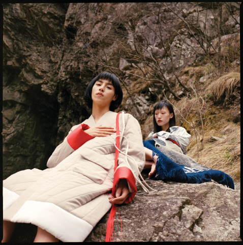 안에 입은 후드는 몽클레르(Moncler), 오른쪽 모델이 입은 한복 치마와 조끼는 김혜순한복(Kimhyesoon).