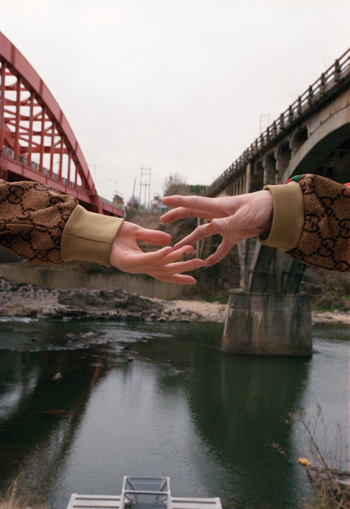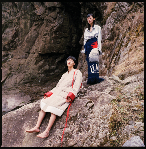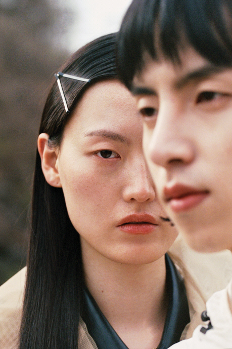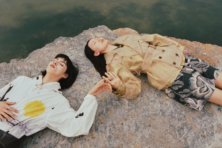 남자 모델이 입은 퀼팅 재킷은 키준(Kijun), 여자 모델이 입은 스트라이프 셔츠와 실로 짠 스커트는 키준(Kijun).