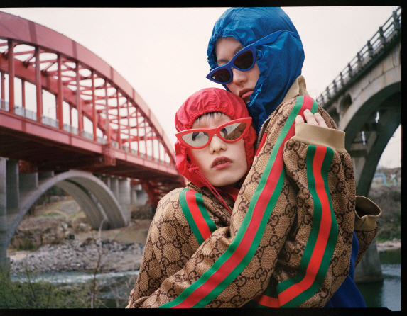 왼쪽 모델이 입은 로고 트랙 재킷은 구찌(Gucci), 안에 입은 빨간 아노락 후드는 푸시버튼(Pushbutton), 선글라스는 셀린(Celine), 오른쪽 모델이 입은 로고 트랙 재킷은 구찌(Gucci), 안에 입은 빨간 아노락 후드는 푸시버튼(Pushbutton), 선글라스는 셀린(Celine).