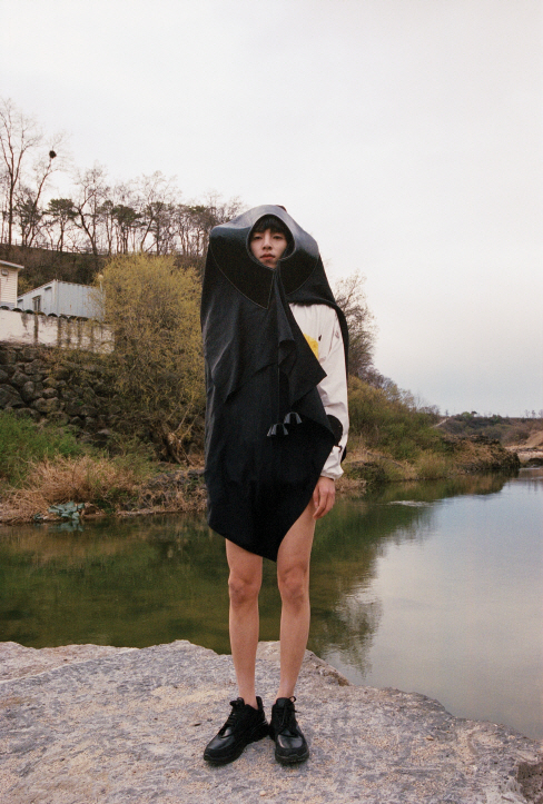 머리에 두른 구조적인 형태의 스커트는 셀린(Celine), 안에 입은 화이트 후드는 몽클레르(Moncler), 블랙 스니커즈는 닐 바렛(Neil Barrett).