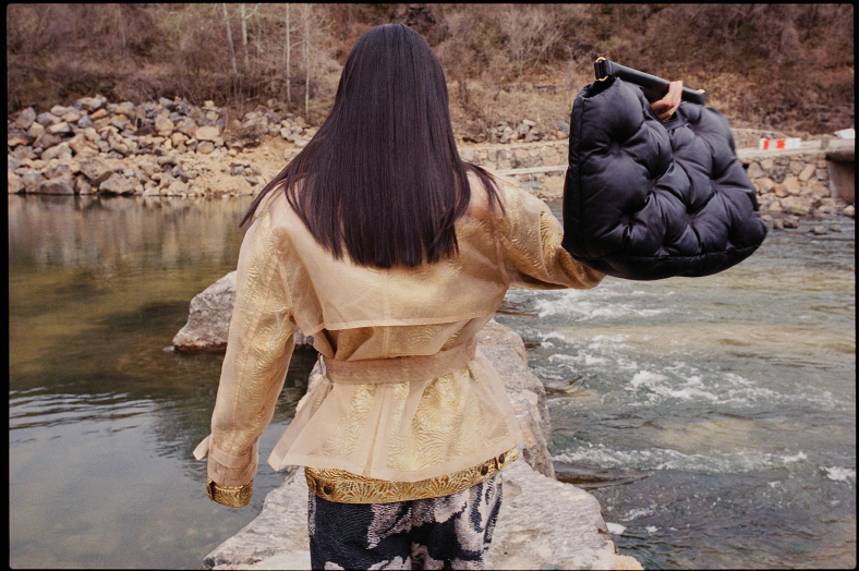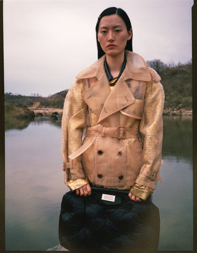 금박 셔츠와 시스루 재킷, 방석 모양 가방은 모두 메종 마르지엘라(Maison Margiela).
