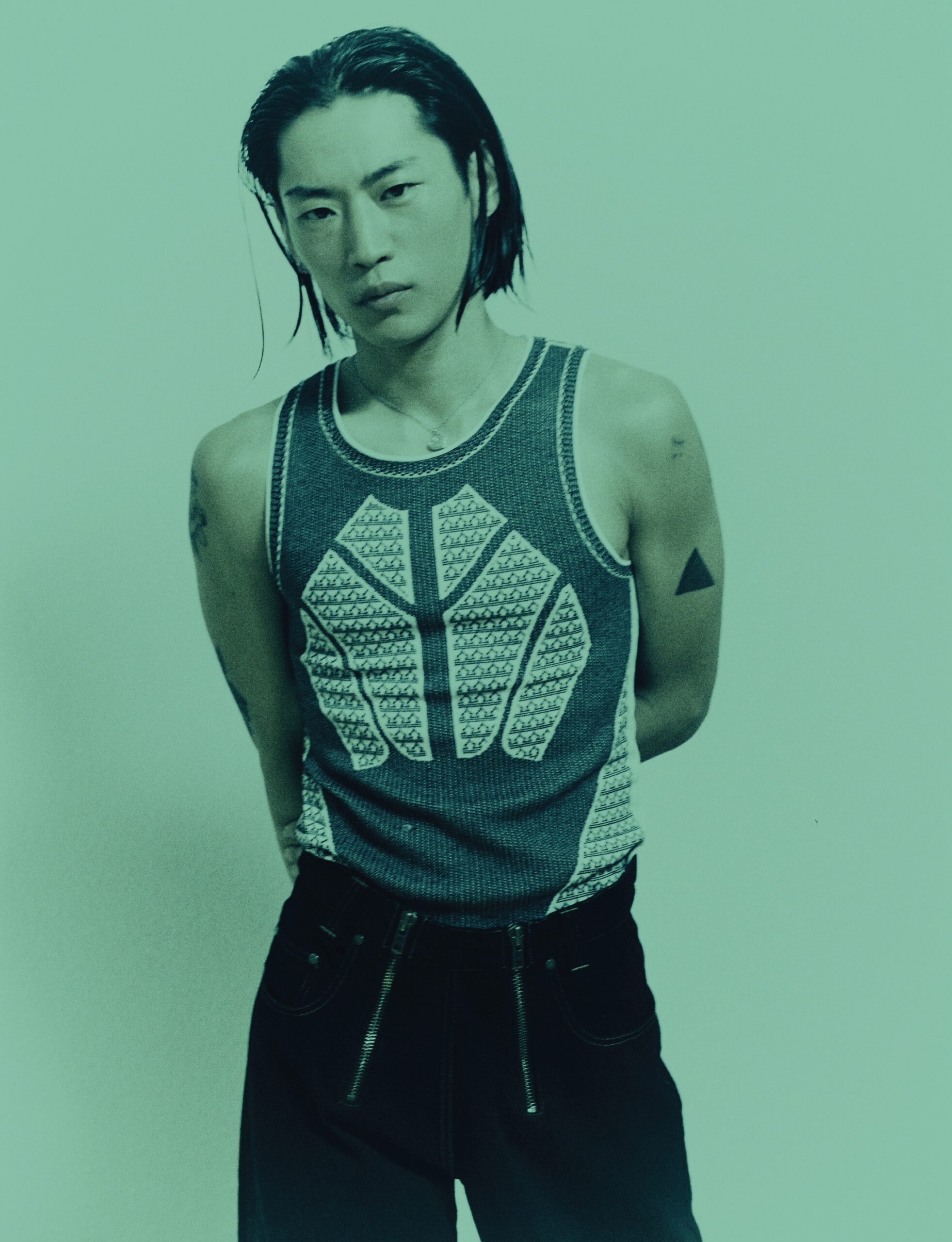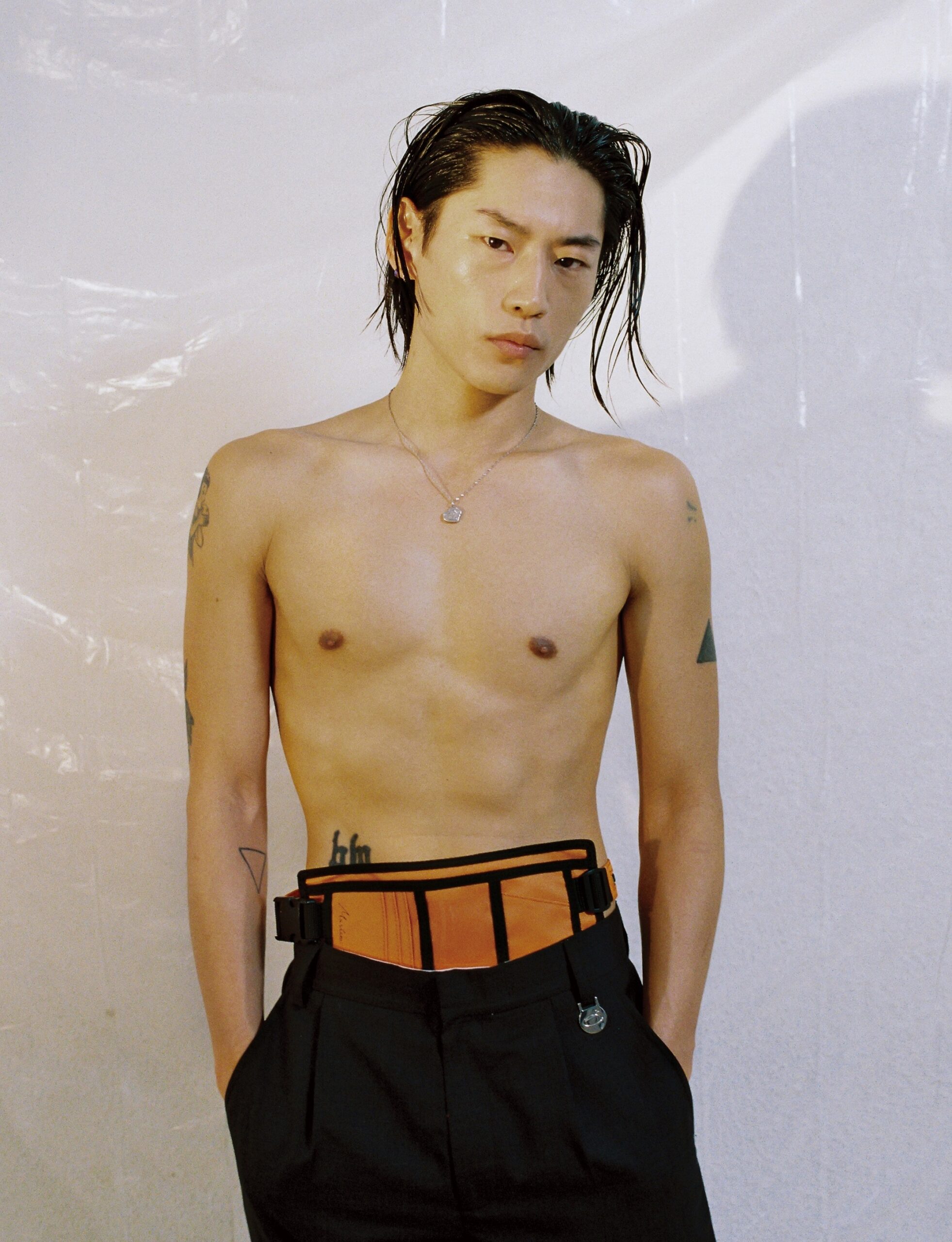 팬츠는 잰더 주(Xander Zhou), 포켓 벨트는 마틴 로즈(Martine Rose).