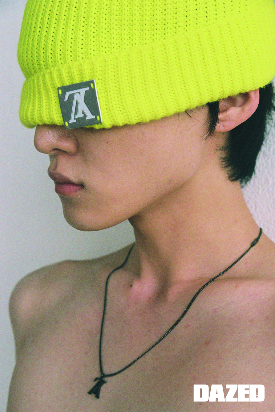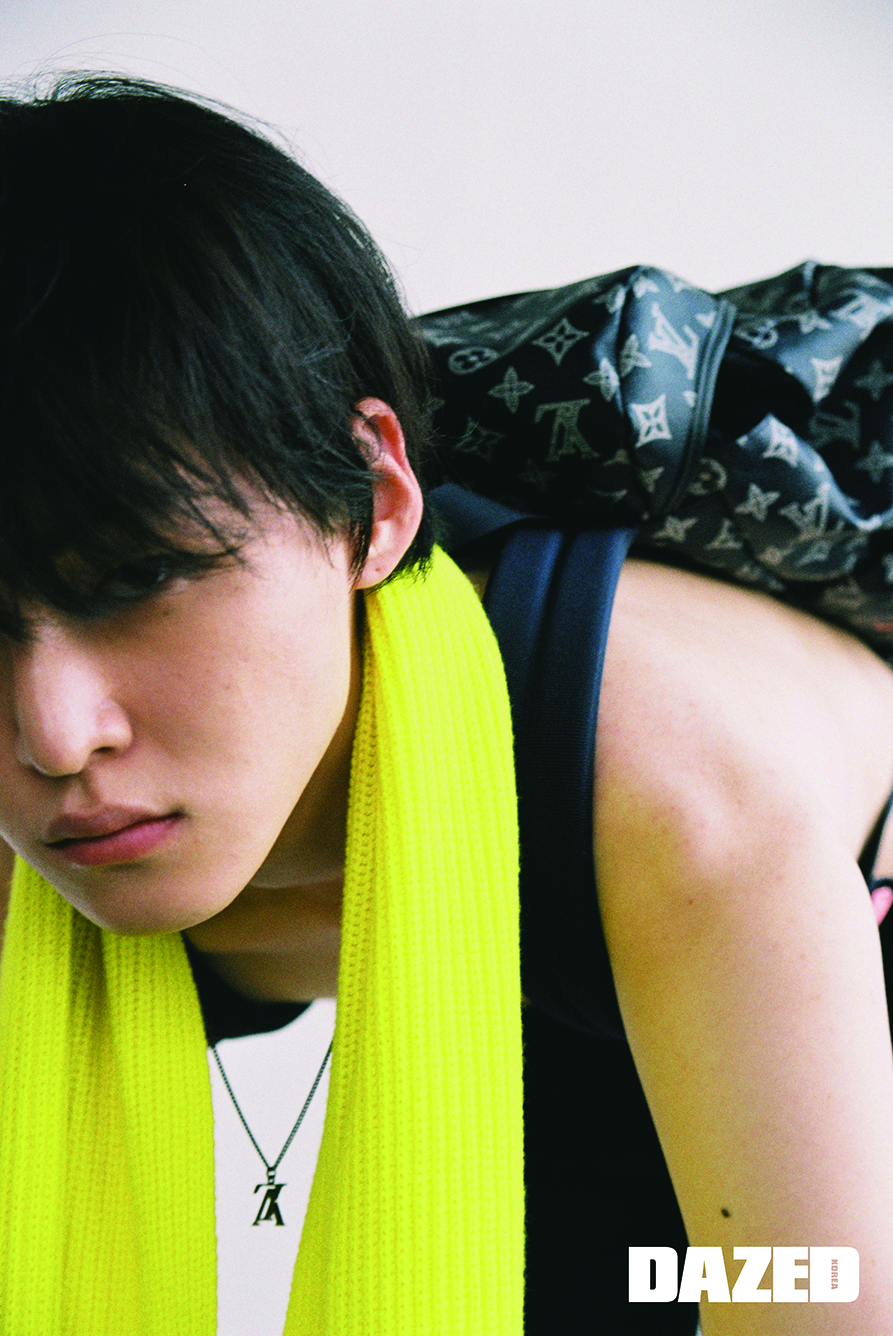 네온 컬러 비니와 머플러, 모노그램 백팩과 로고 네크리스는 모두 루이 비통(Louis Vuitton).