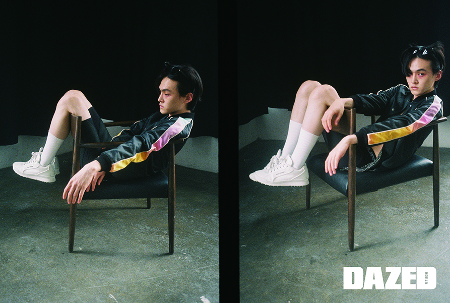 도트 무늬 셔츠와 멀티컬러 테디 재킷, 머리 위로 올려 쓴 선글라스, 화이트 스니커즈는 모두 생 로랑 by 안토니 바카렐로(Saint Laurent by Anthony Vaccarello).
