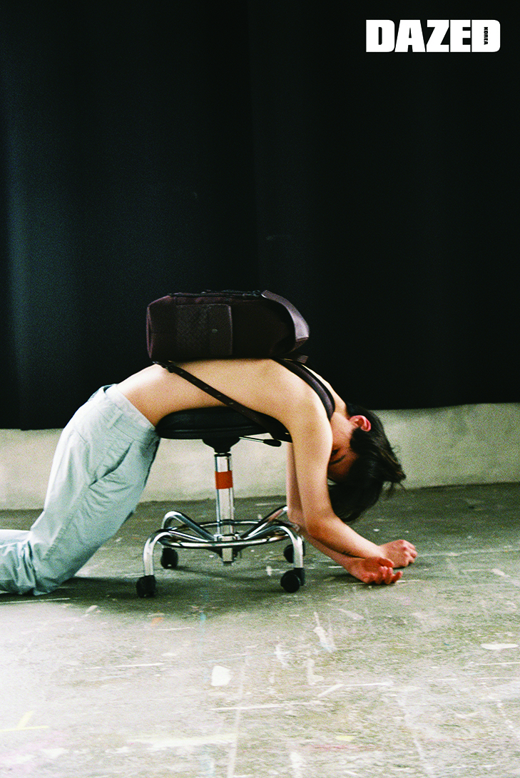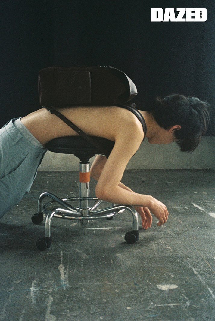 인트레치아토 기법의 레더 포켓이 특징인 컨버스 백팩, 연하늘색 팬츠는 보테가 베네타(Bottega Veneta).