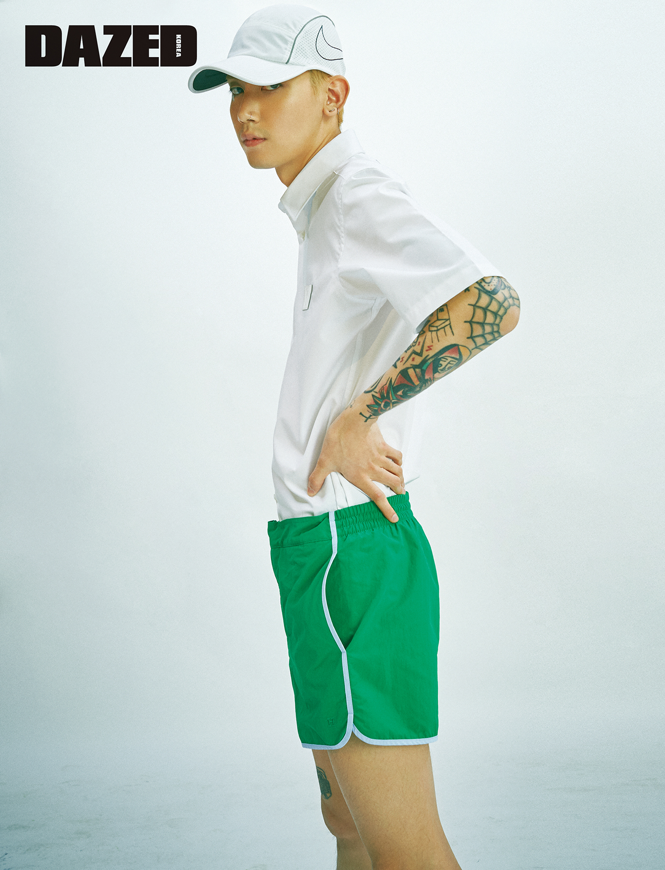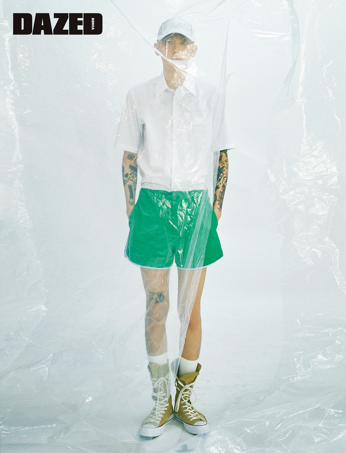 화이트 반팔 셔츠는 젠더 주(Xander Zhou), 스윔 쇼츠는 에르메스(Hermes), 스웨이드 스니커즈는 JW 앤더슨X컨버스(JW AndersonXConverse), 화이트 볼 캡은 나이키(Nike).