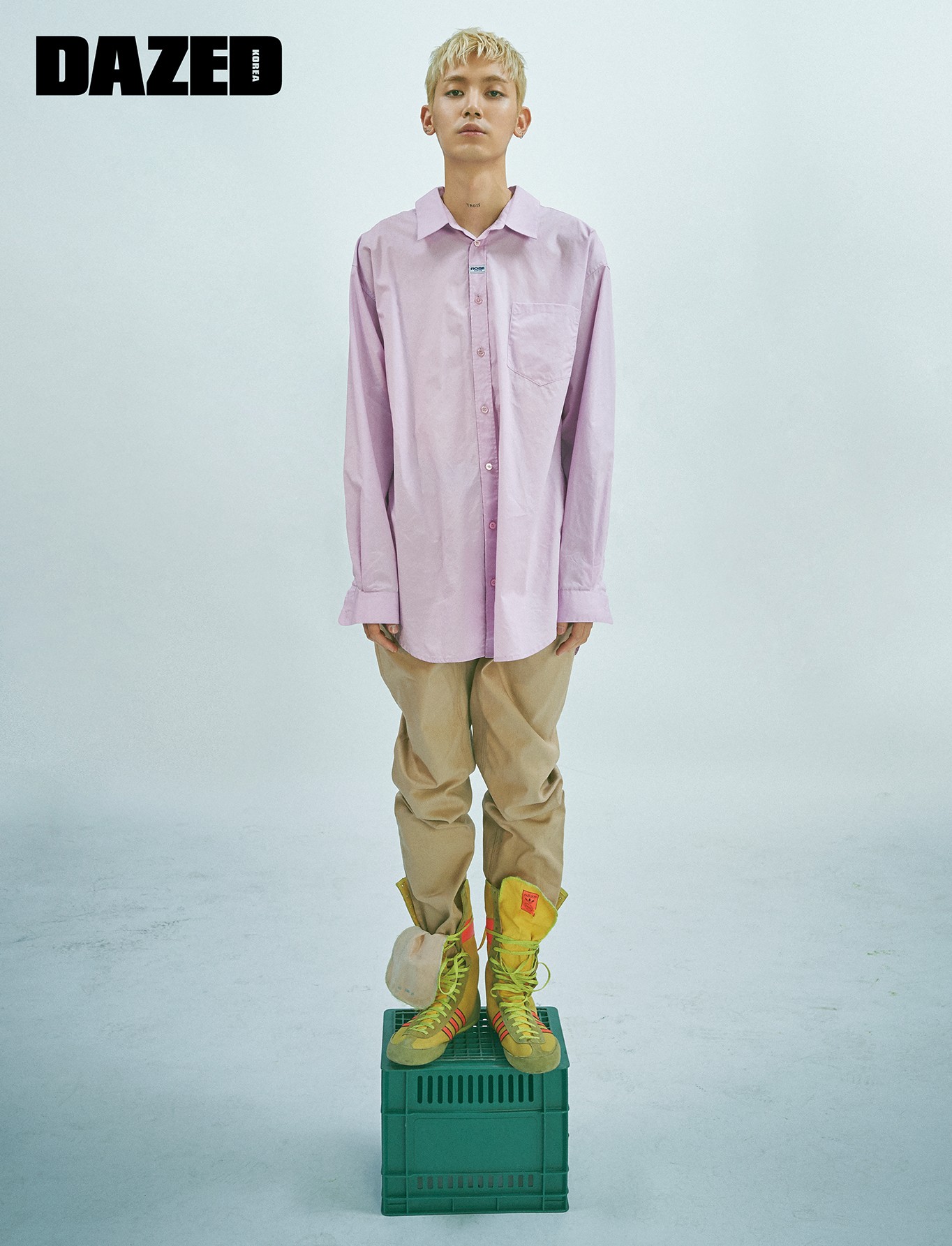 핑크 컬러 셔츠는 마틴 로즈(Martine Rose), 팬츠는 펜디(Fendi), 네온 컬러 복싱화는 광장시장에서 구입한 것.
