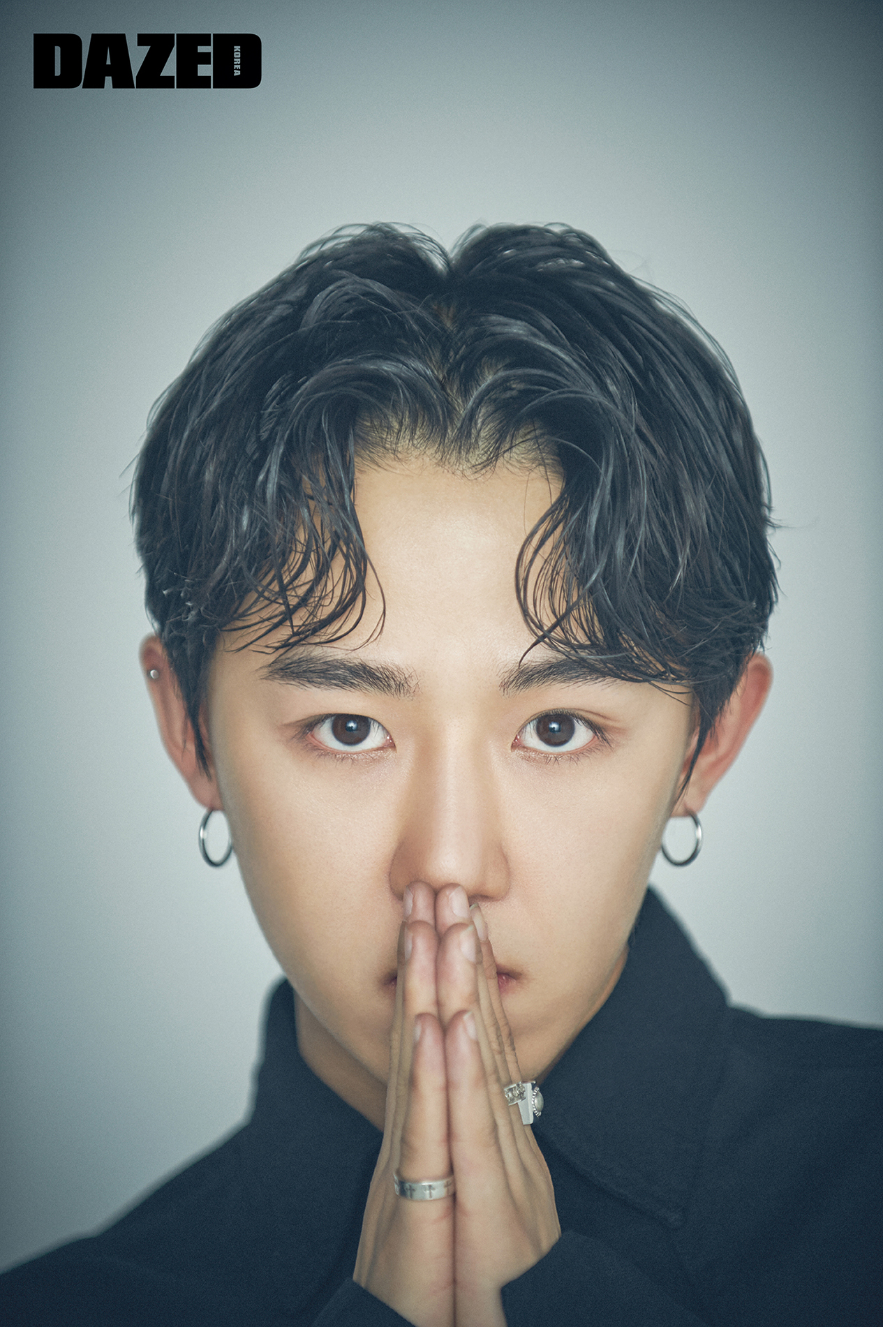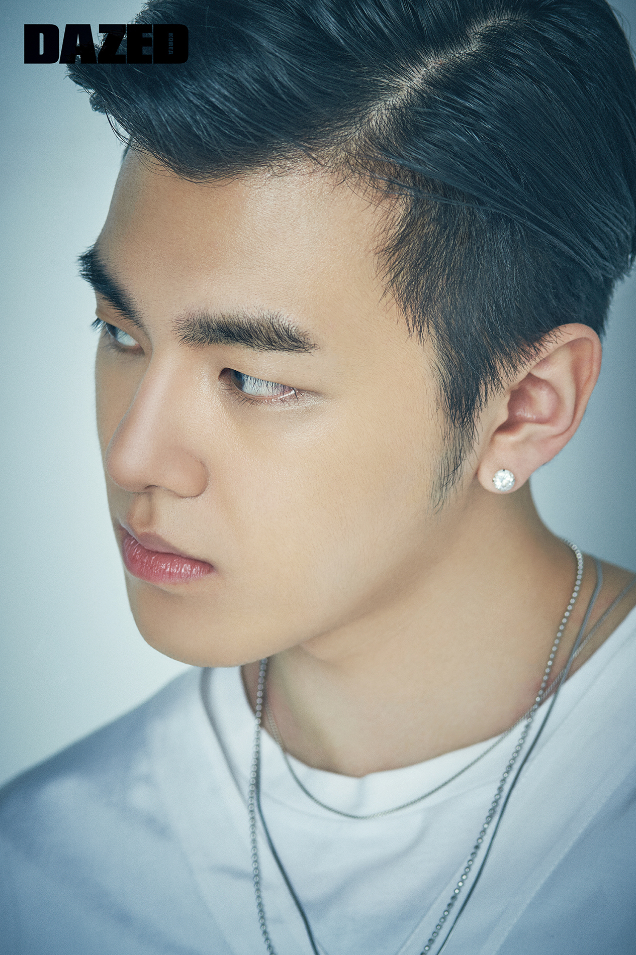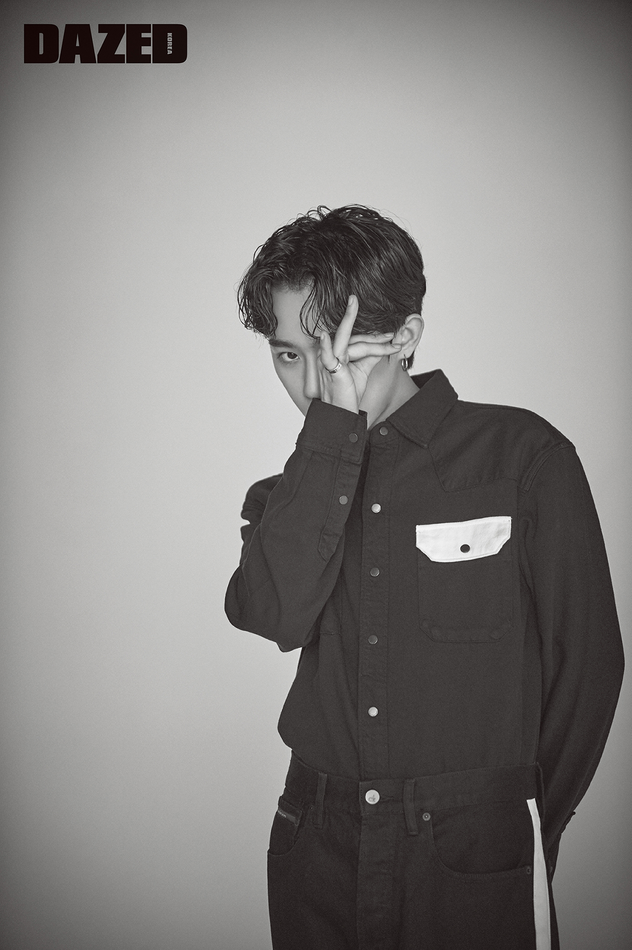 화이트 셔츠는 김서룡(Kimseoryong), 데님 셔츠는 캘빈 클라인 진(Calvin Klein Jean).