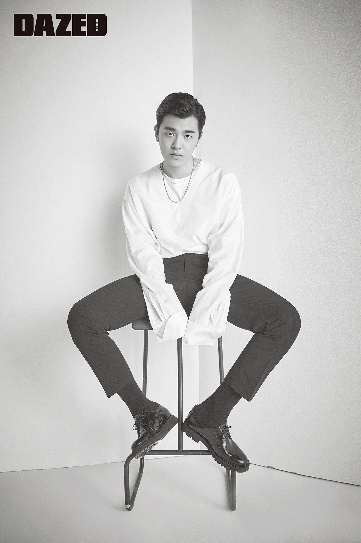 화이트 셔츠는 김서룡(Kimseoryong), 팬츠는 스타일리스트의 것, 신발은 로스트가든(Lostgarden).