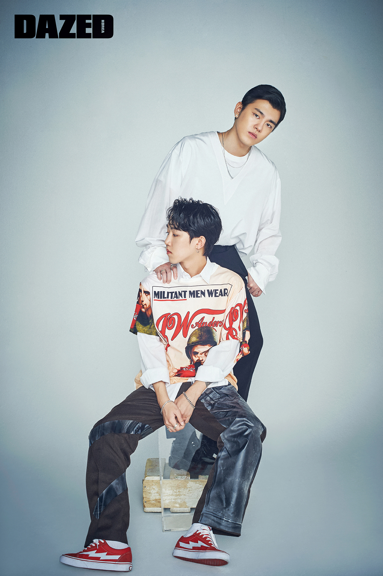 휘민이 입은 프린트 티셔츠는 JW 앤더슨 by 톰그레이하운드(JW Anderson by Tom Greyhound), 팬츠는 포저(Poszer), 스니커즈는 리벤지 스톰(Revenge x Storm), 규정이 입은 화이트 셔츠는 김서룡(Kimseoryong), 팬츠는 스타일리스트의 것, 신발은 로스트가든(Lostgarden).