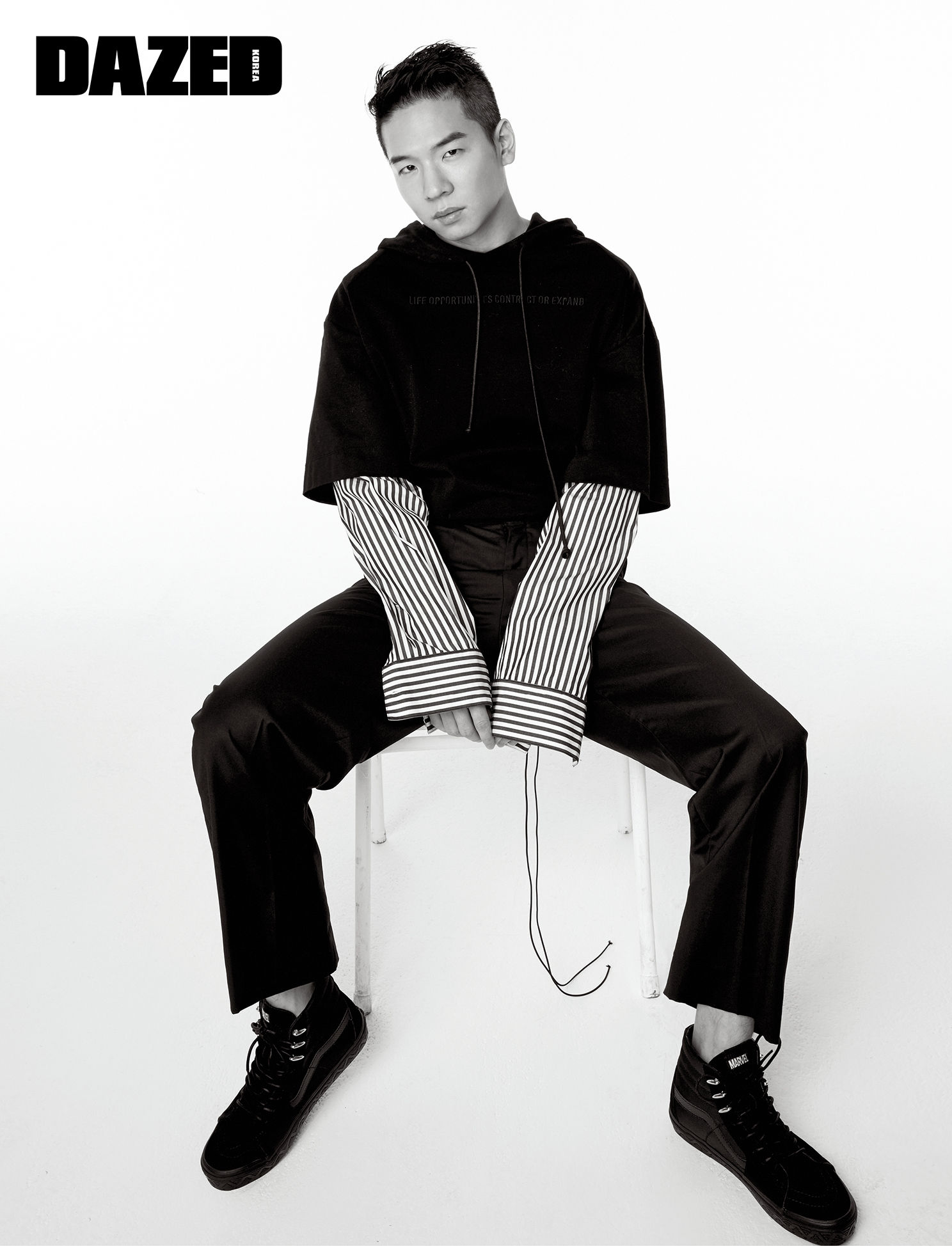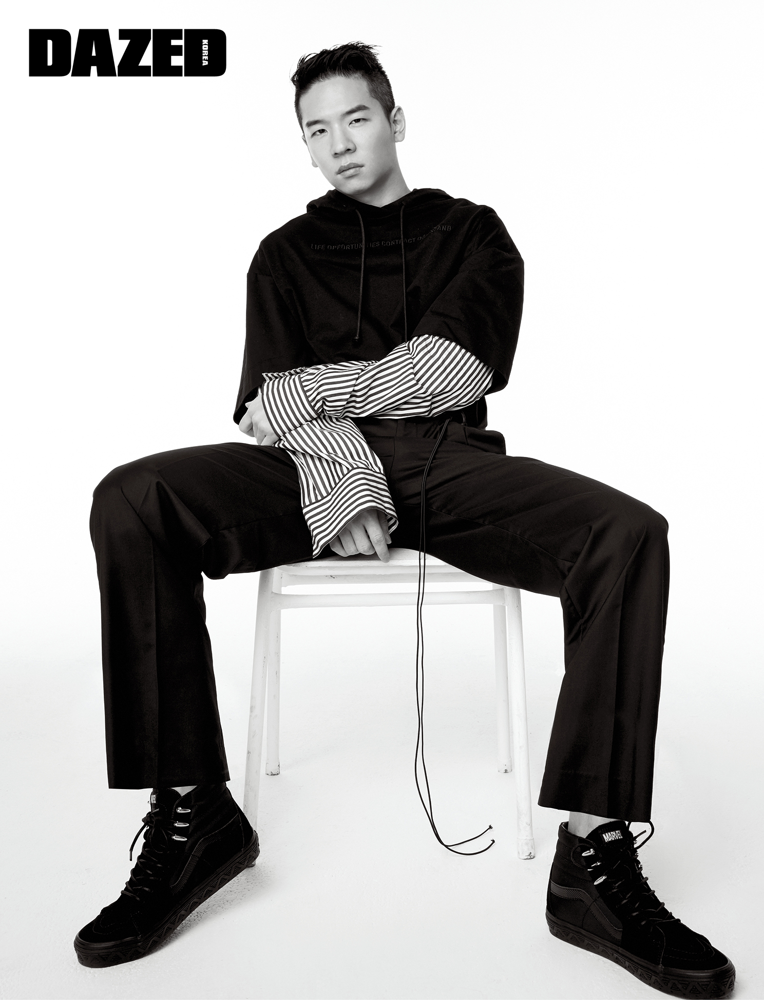 스트라이프 셔츠를 레이어드한 후드 톱은 준지(Juun.J), 팬츠는 무율(Mooyul), 스니커즈는 반스(Vans).
