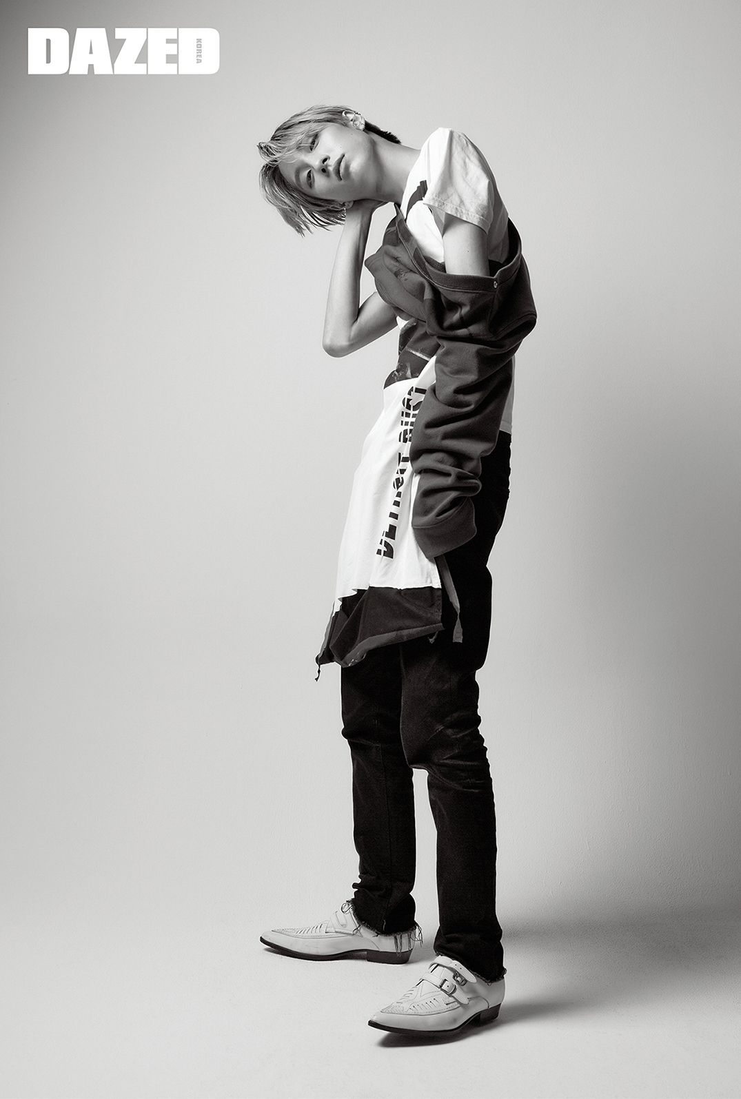 에이프런처럼 연출 가능한 티셔츠와 소매에 걸친 후드 톱은 라프 시몬스 by 분더샵(Raf Simons by BOONTHESHOP), 팬츠는 홀랜드의 것, 앞코가 뾰족한 로퍼는 생 로랑 by 에디 슬리만(Saint Laurent by Hedi Slimane).