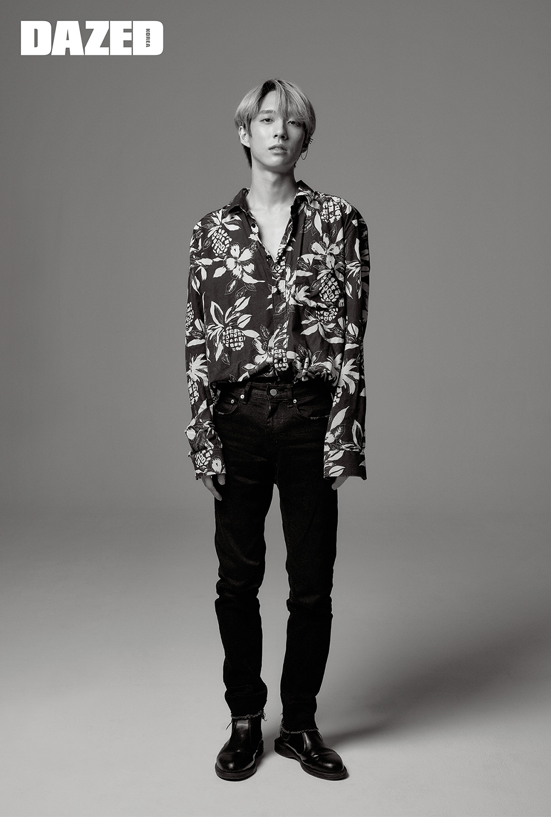하와이안 무늬 실크 셔츠는 생 로랑 by 안토니 바카렐로(Saint Laurent by Anthony Vaccarello), 팬츠와 첼시 부츠는 모두 홀랜드의 것.