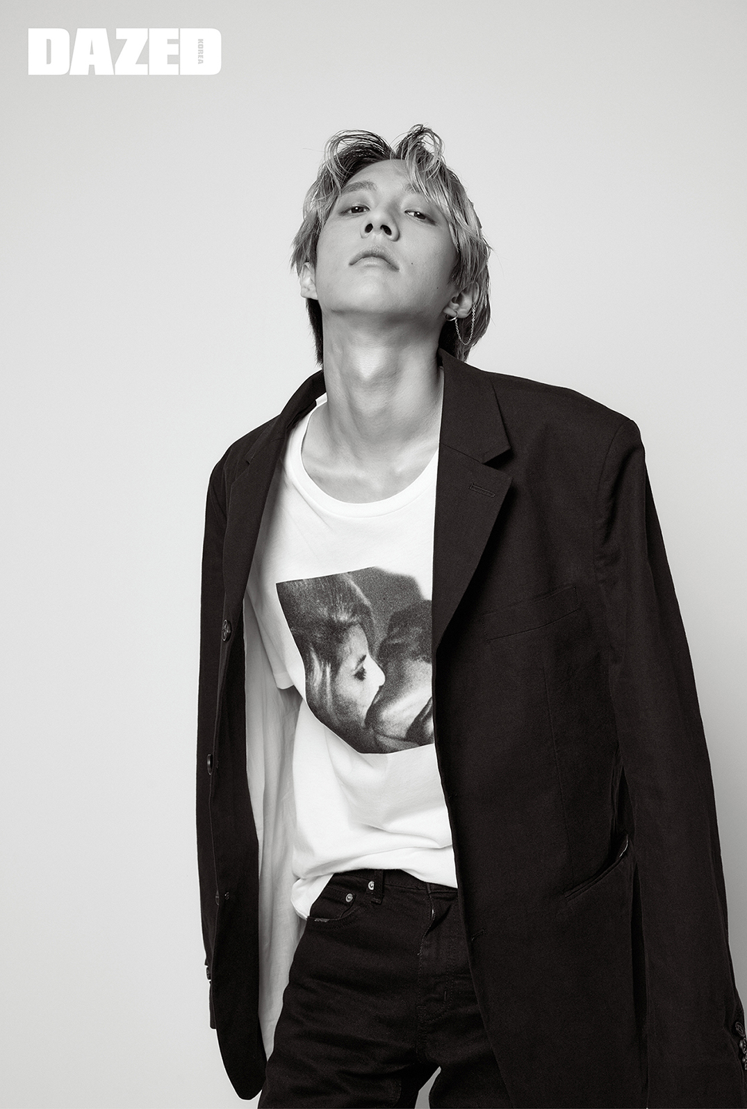 재킷과 팬츠는 홀랜드의 것, 앤디 워홀의 작품 ‘Kiss’를 프린트한 티셔츠는 캘빈 클라인 언더웨어(Calvin Klein Underwear).