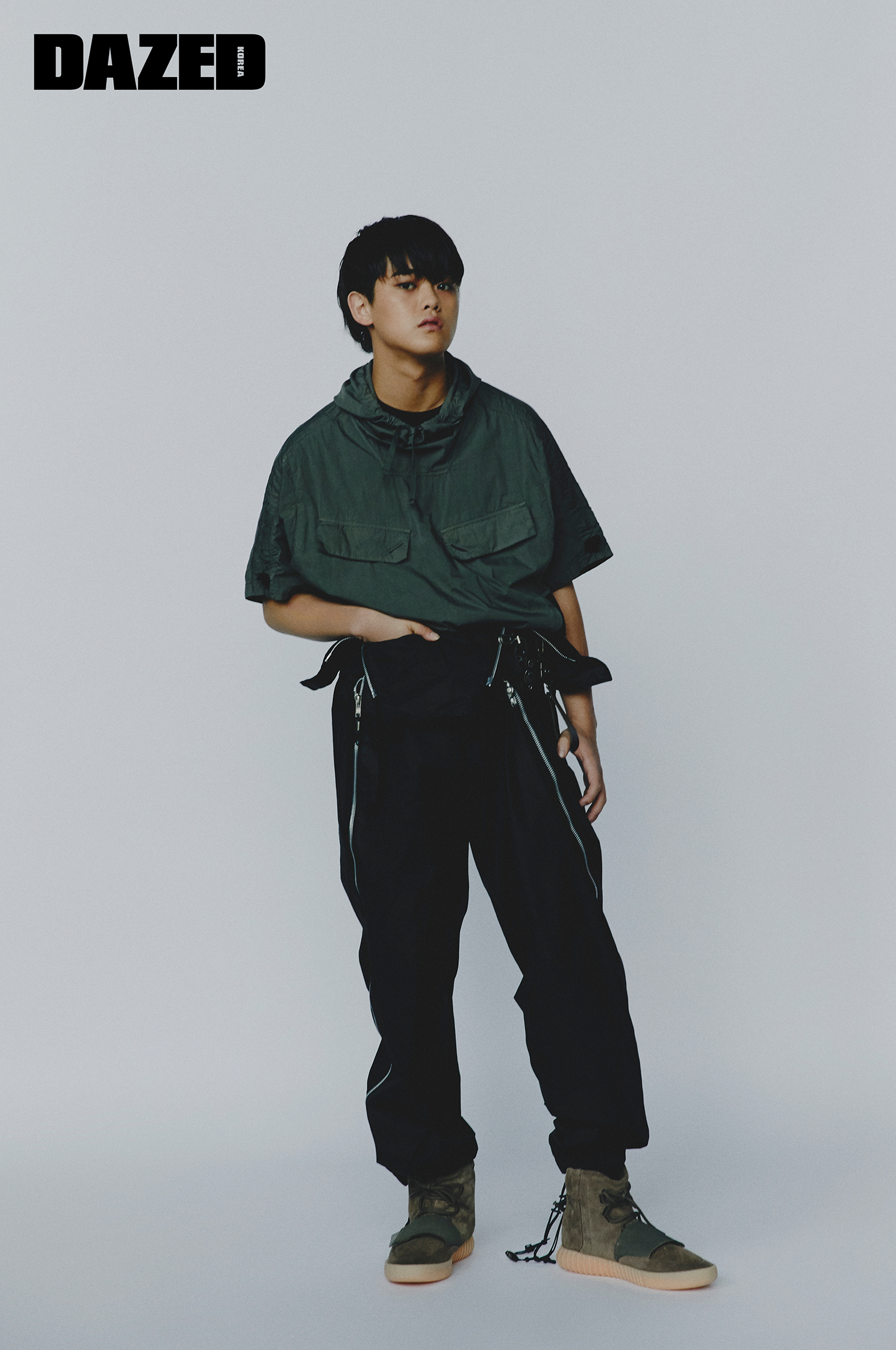 하프 슬리브 후디는 스톤 아일랜드(Stone Island), 지퍼 장식 조거 팬츠와 레더 벨트는 블랙멀(Blackmerle), 이지 부스트는 이시형 에디터의 것.