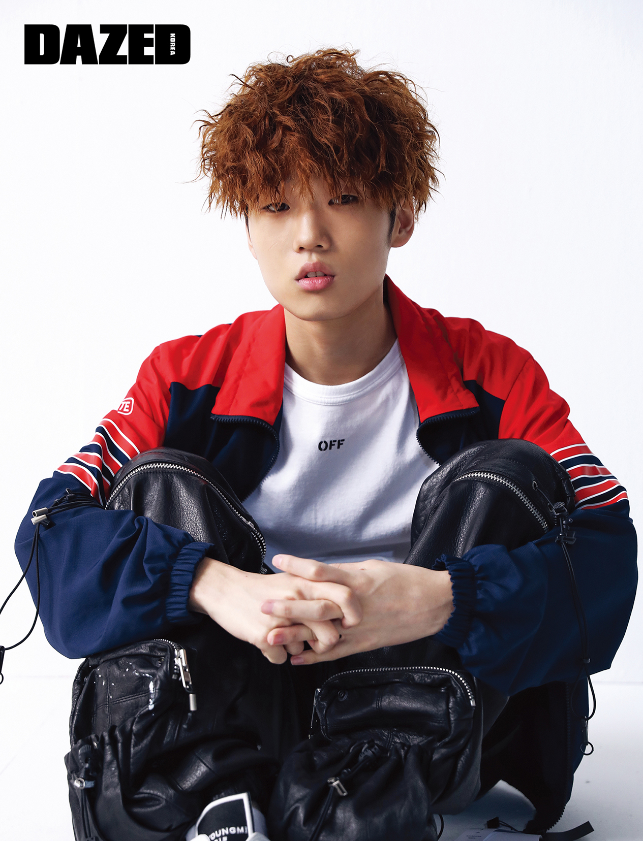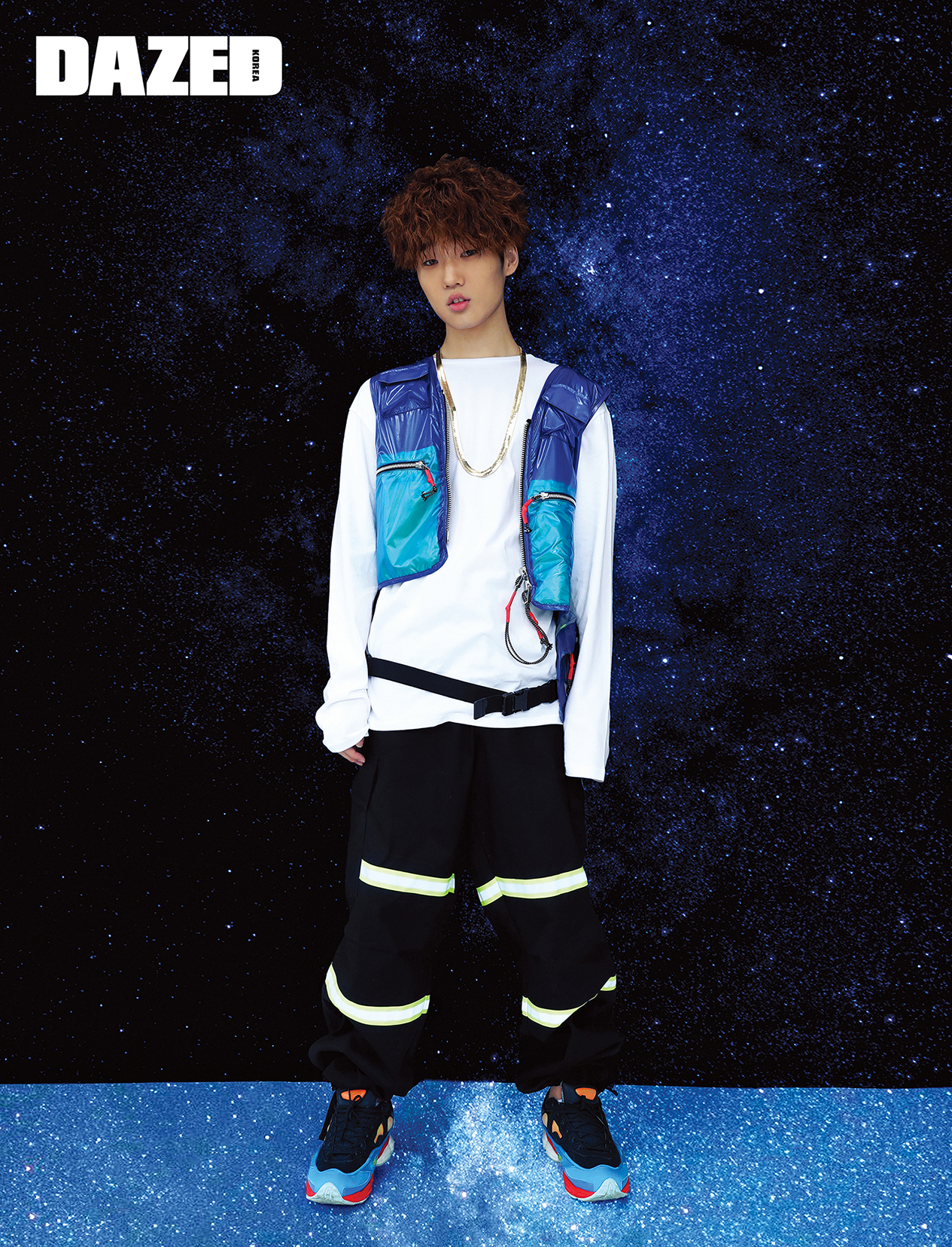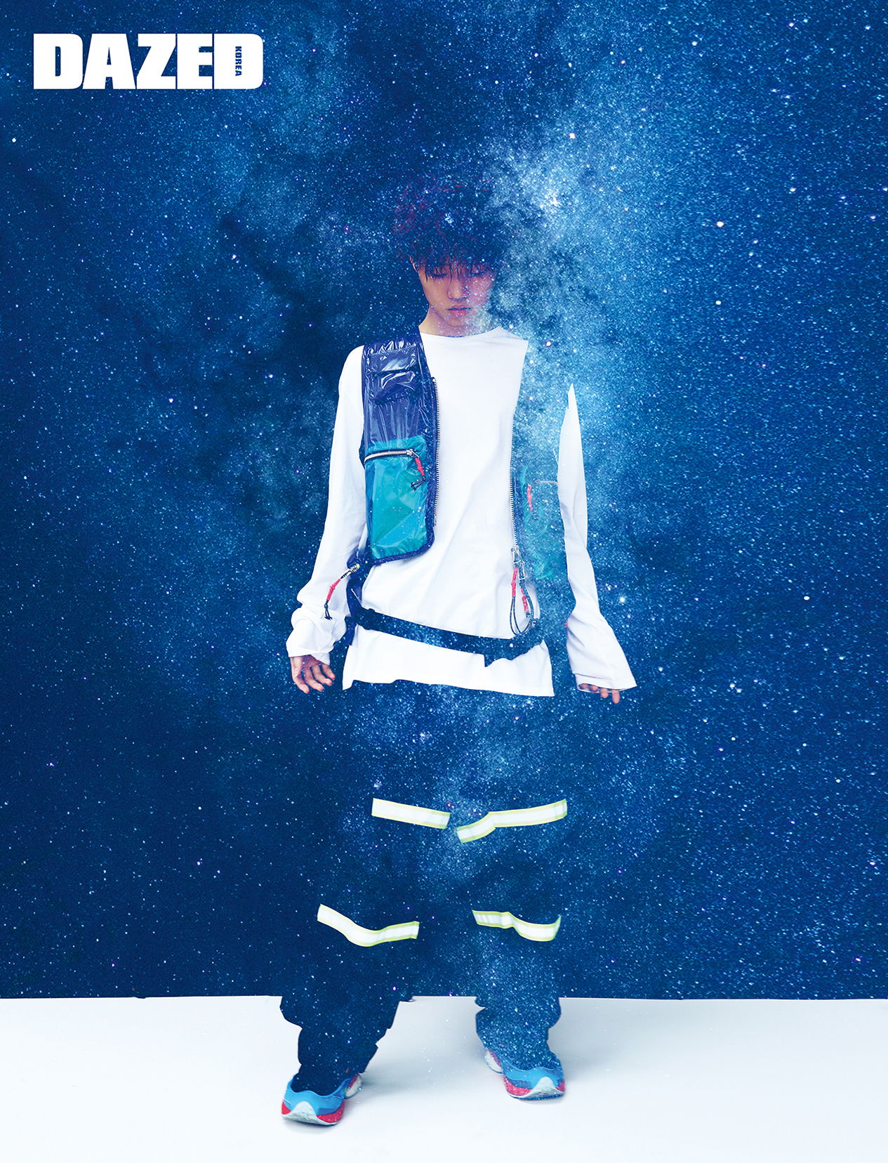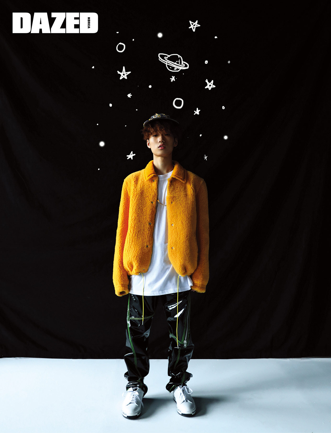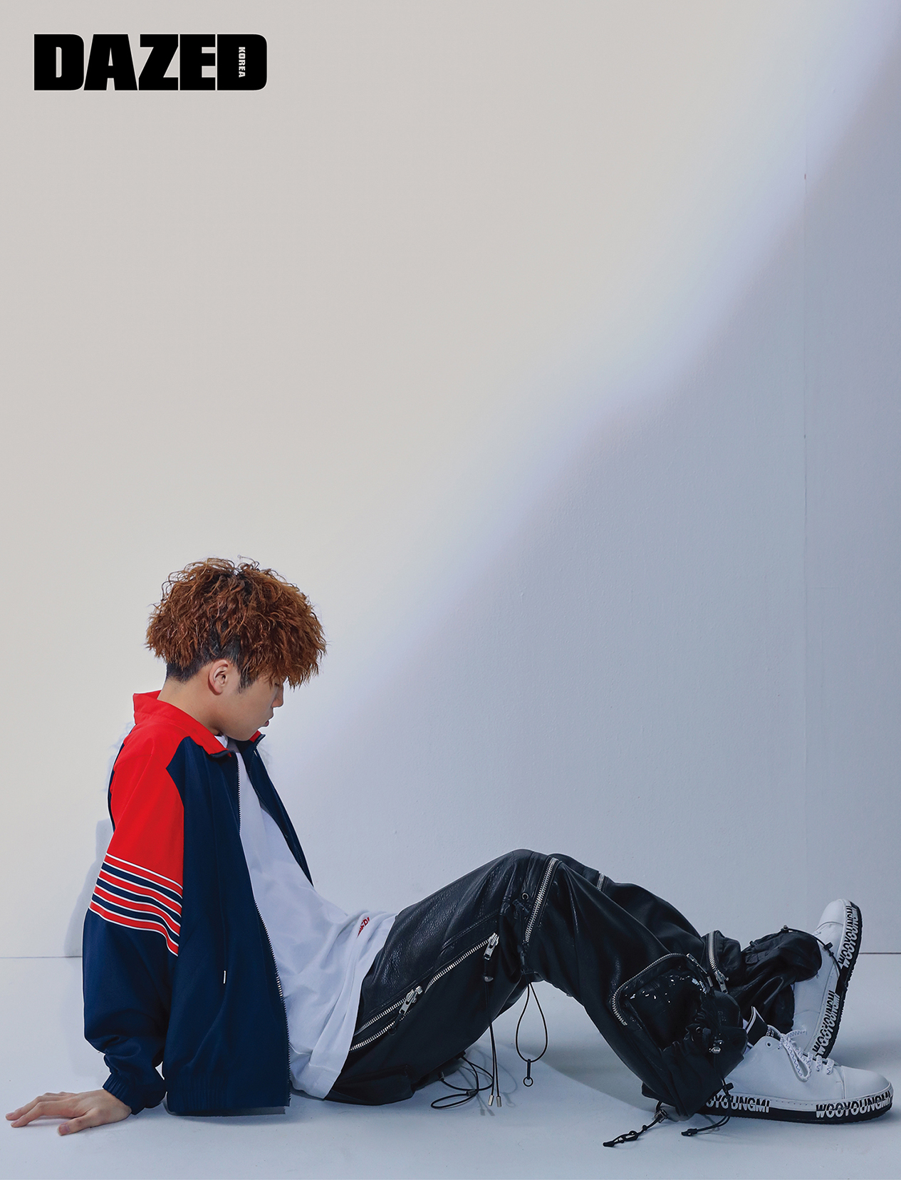 버튼업 재킷은 발리(Bally), 오버 핏 티셔츠는 노앙(Nohant), 레이스업 스니커즈는 우영미(Wooyoungmi), 네온 컬러 스티치가 포인트인 PVC 소재 팬츠와 커스텀 메이드 캡은 시토키닌(Cytokinin).