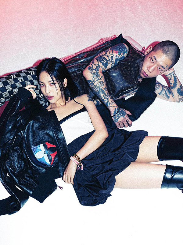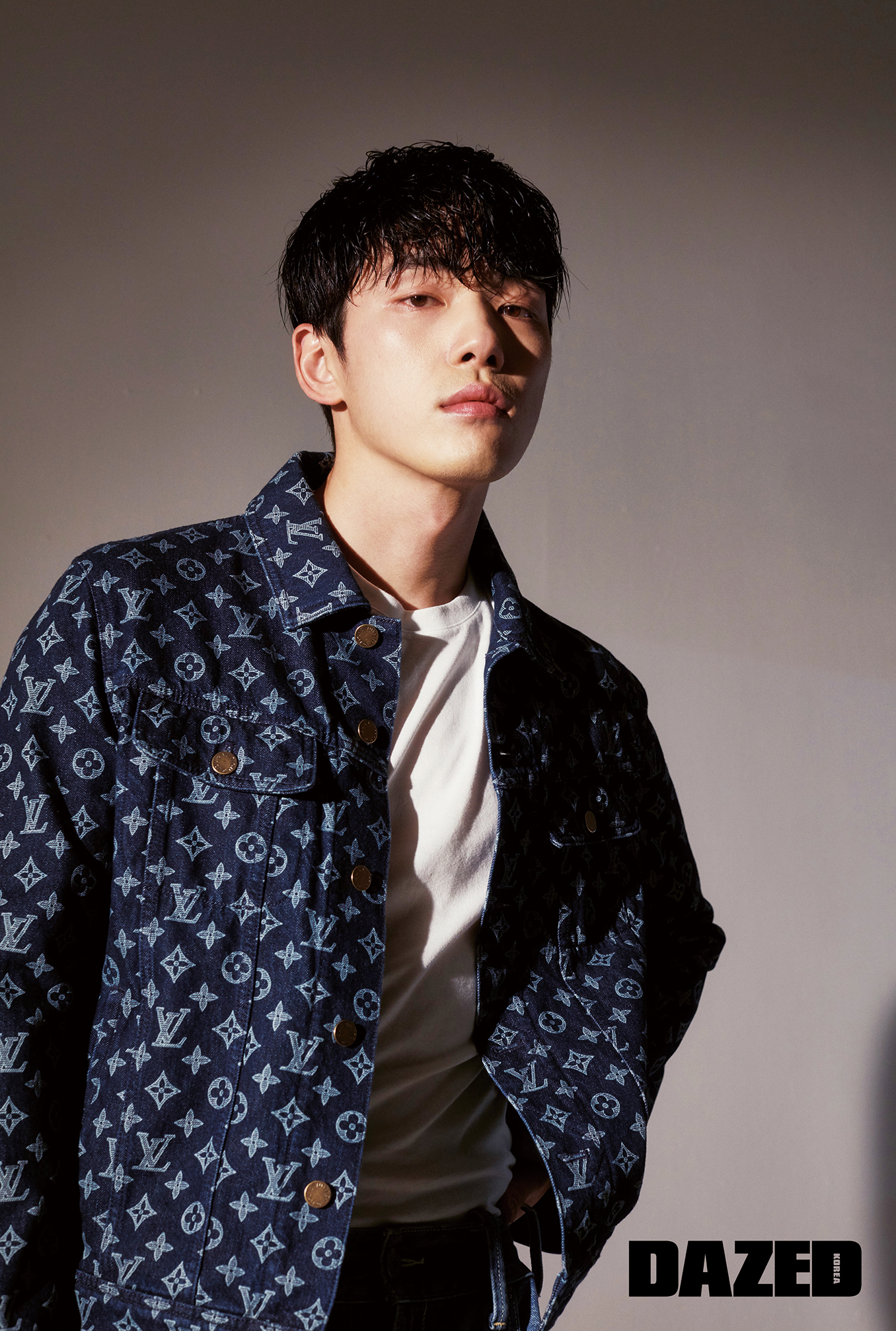화이트 티셔츠는 유니클로(Uniqlo), 데님 팬츠는 김서룡(Kimseoryong), 로고 플레이 데님 재킷은 루이 비통(Louis Vuitton).