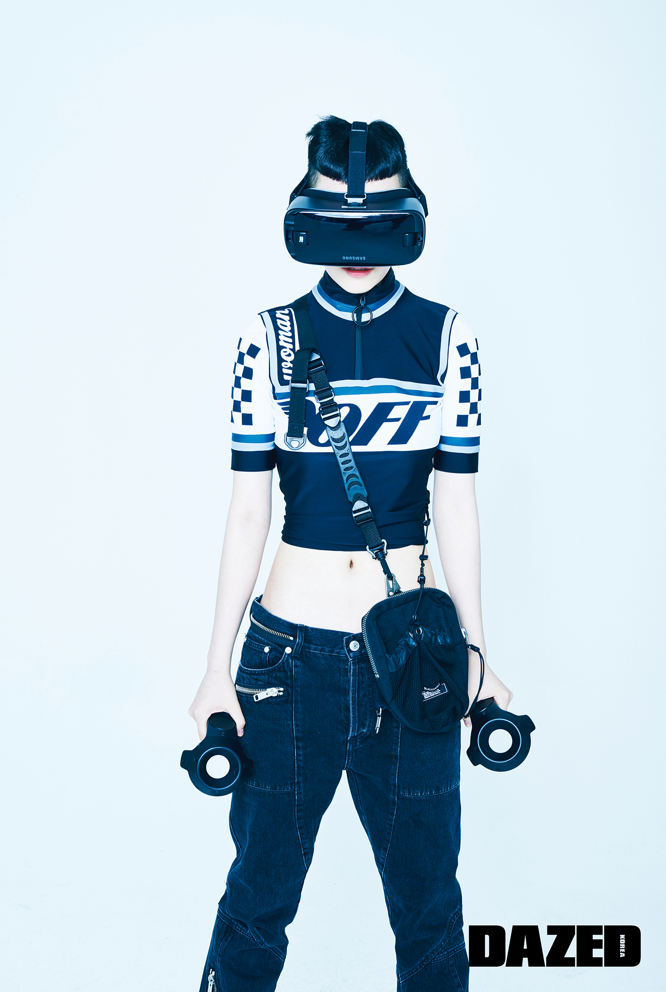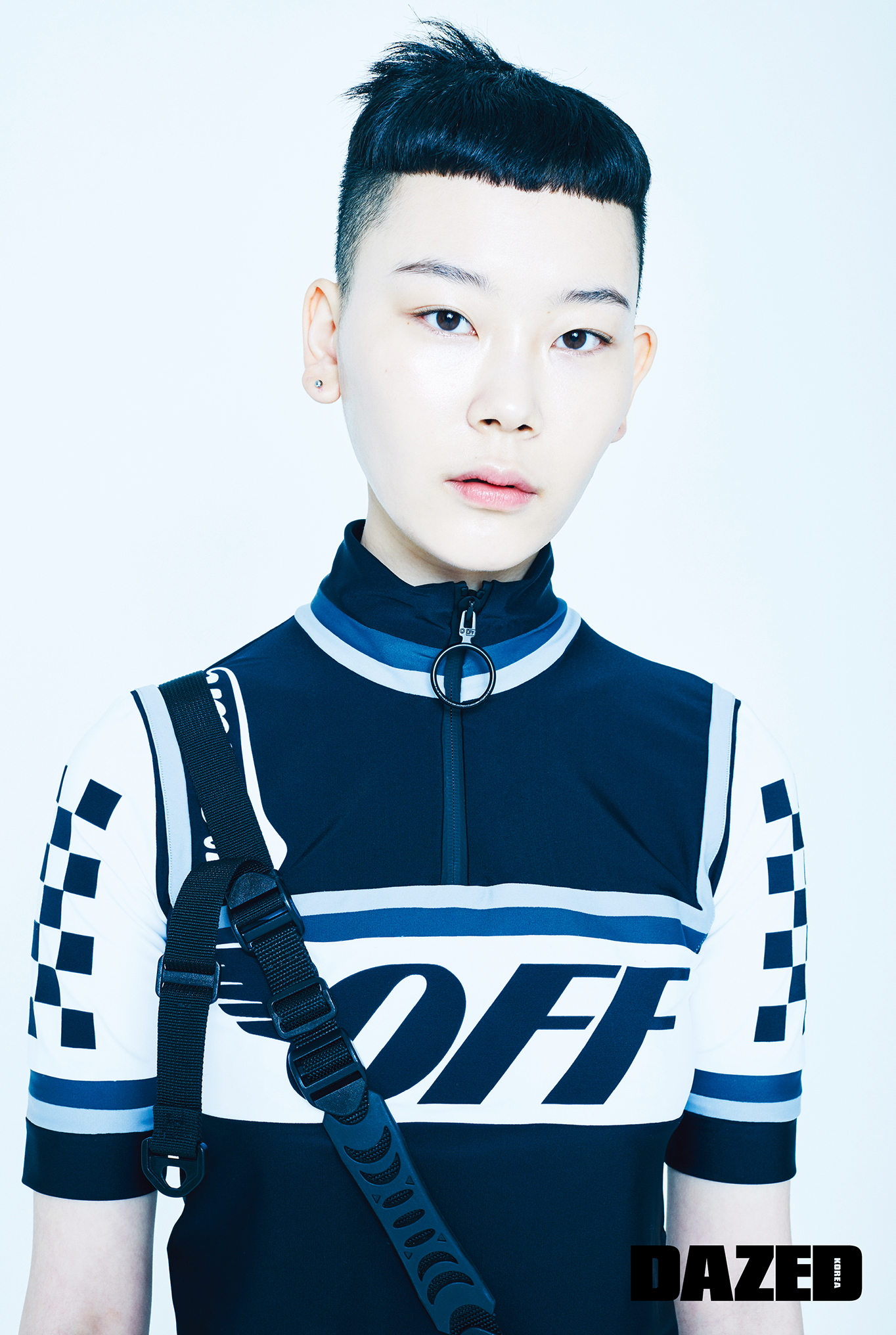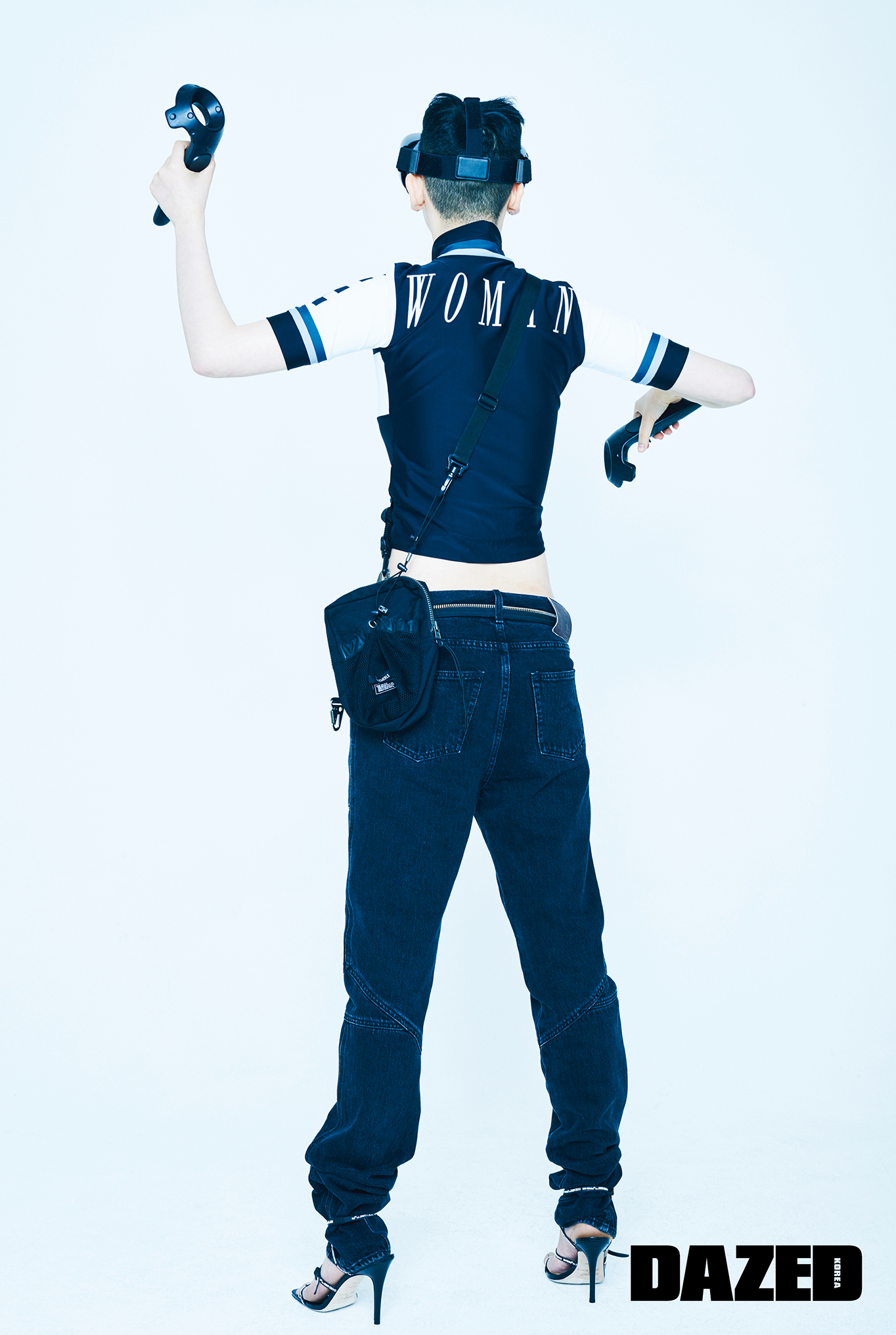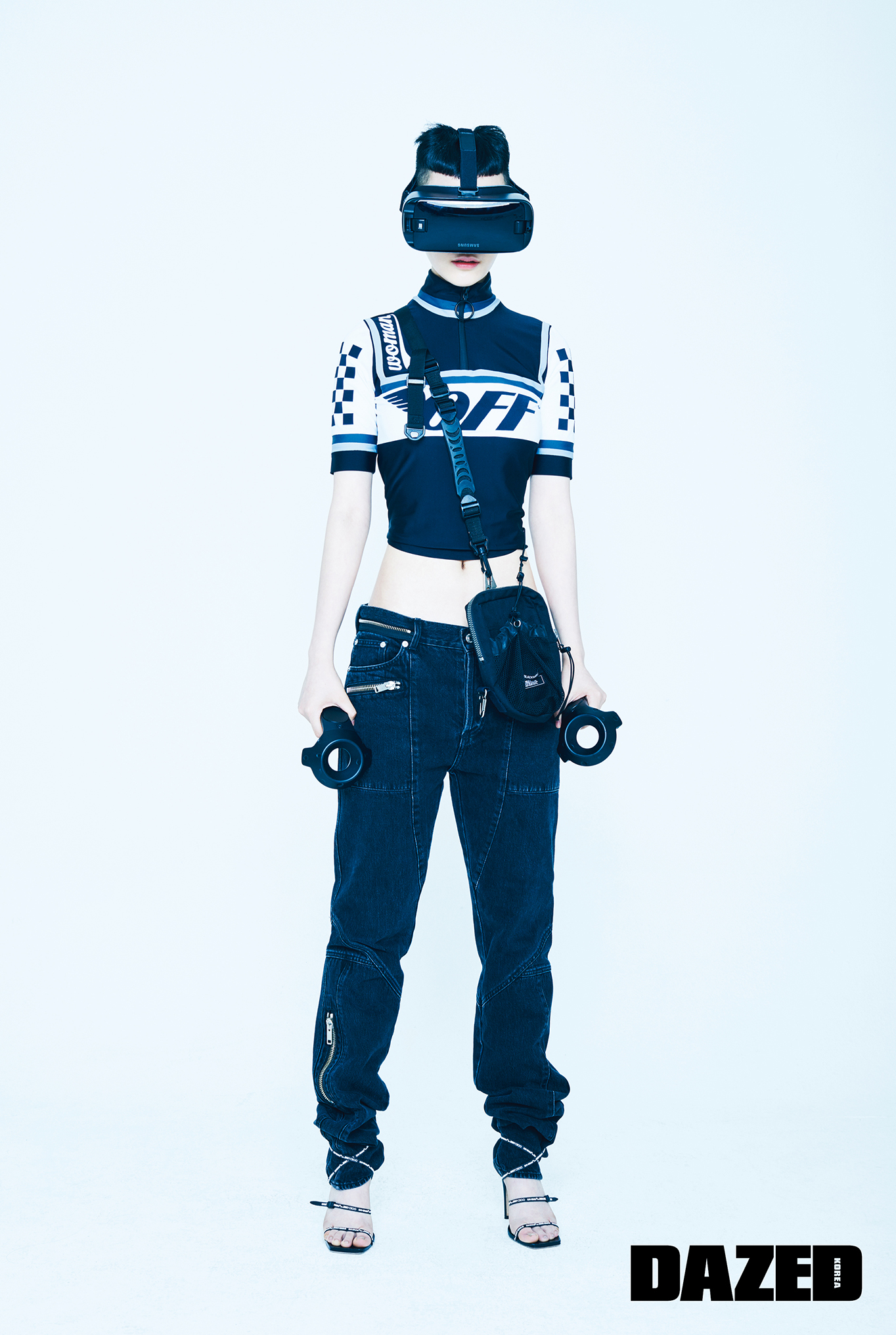 스포티한 무드의 반팔 톱은 오프화이트(Off-white), 지퍼 디테일의 데님 팬츠는 지방시(Givenchy), 로고 디테일의 스트랩 샌들은 오프화이트x지미추(Off-whitexJimmy Choo).