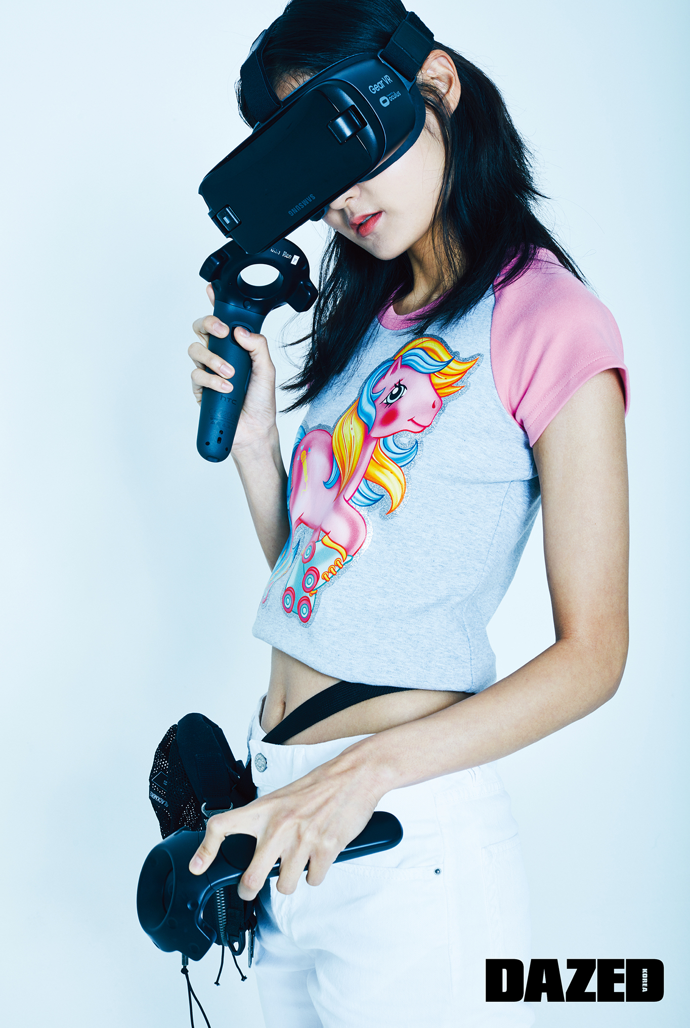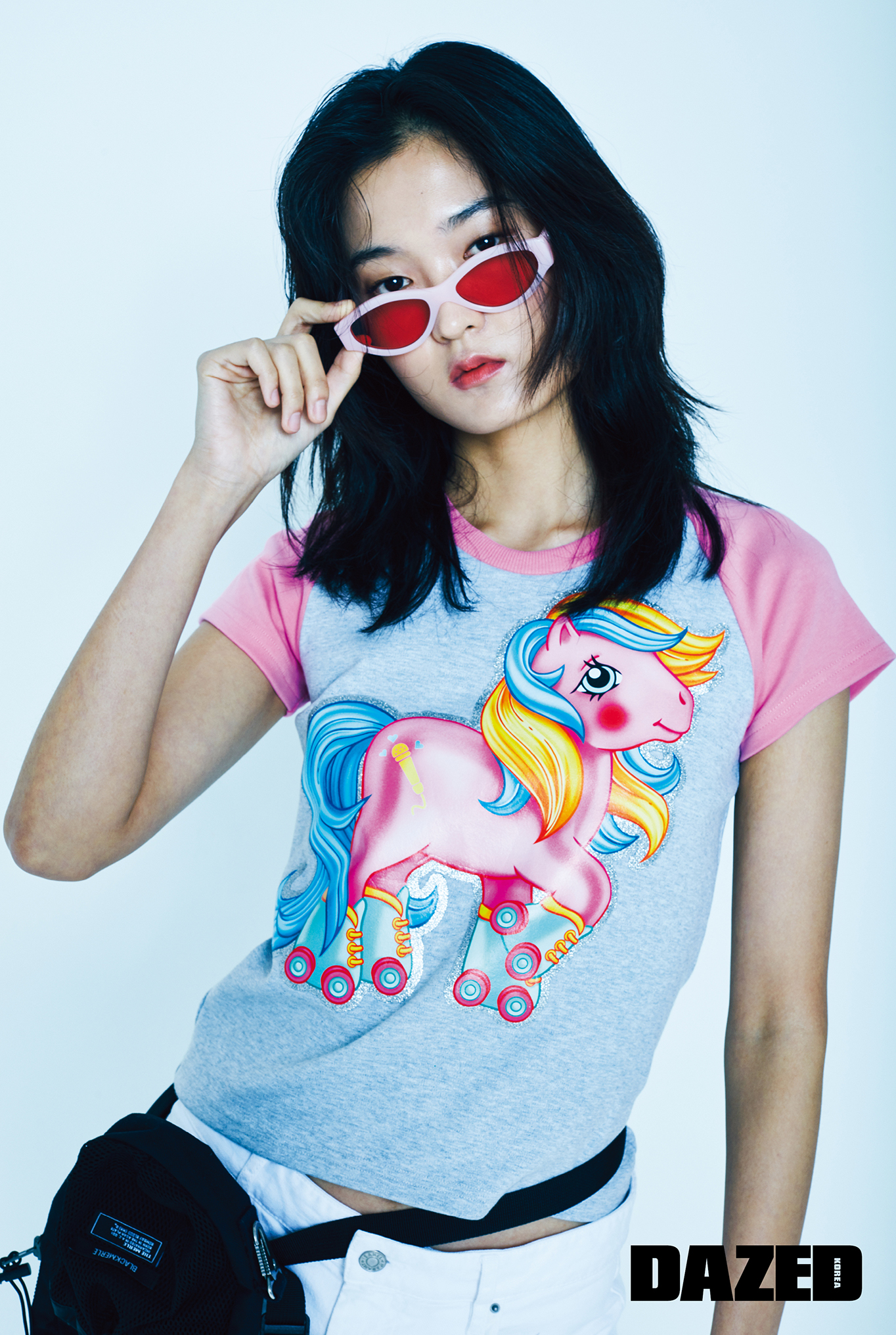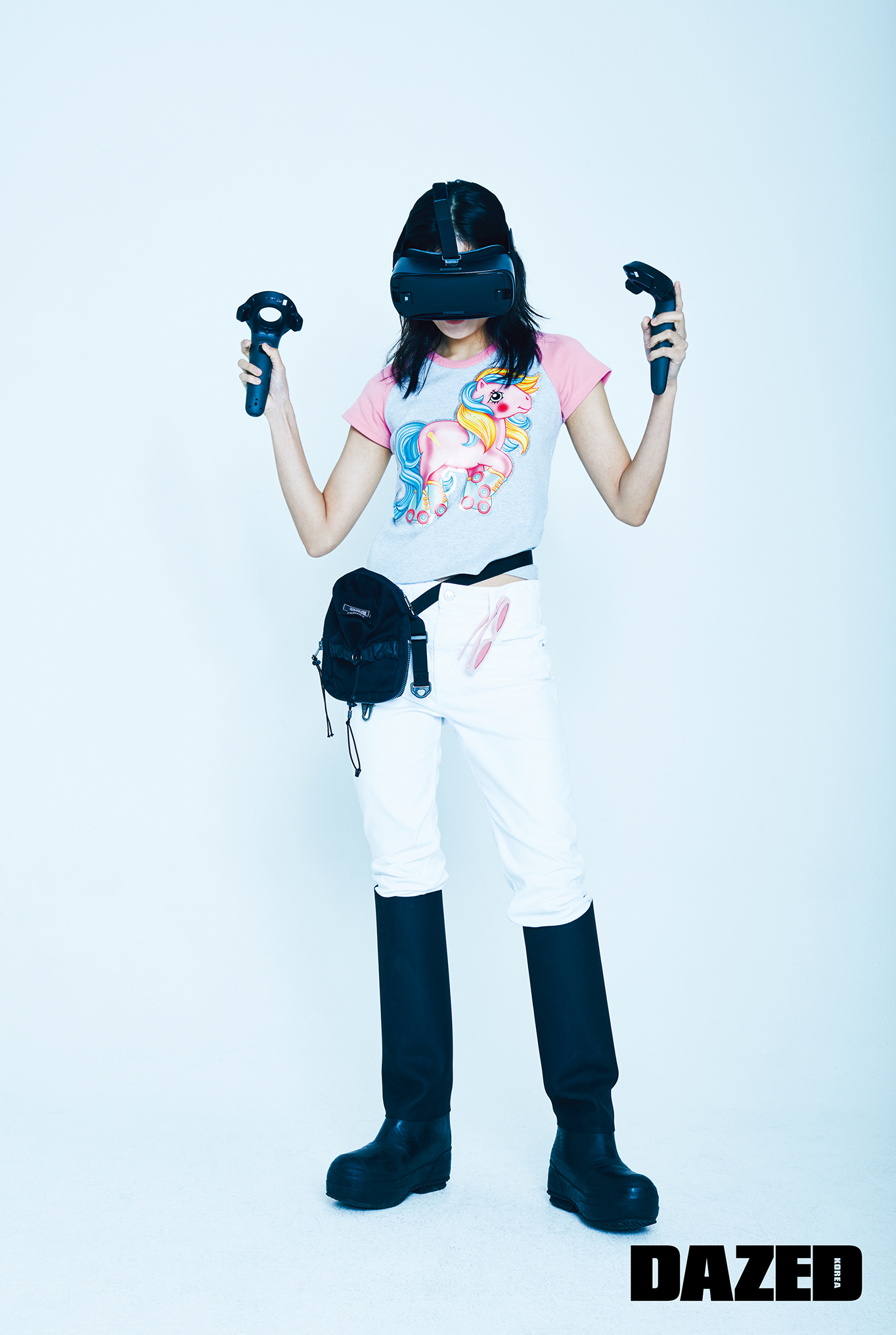 다영이 입은 유니콘 티셔츠는 모스키노(Moschino), 화이트 팬츠는 이자벨 마랑(Isabel Marant), 투박한 장화는 셀린(Celine),