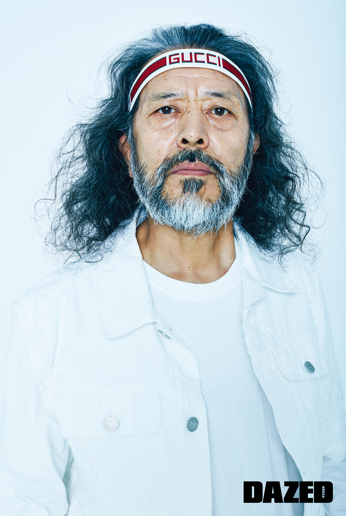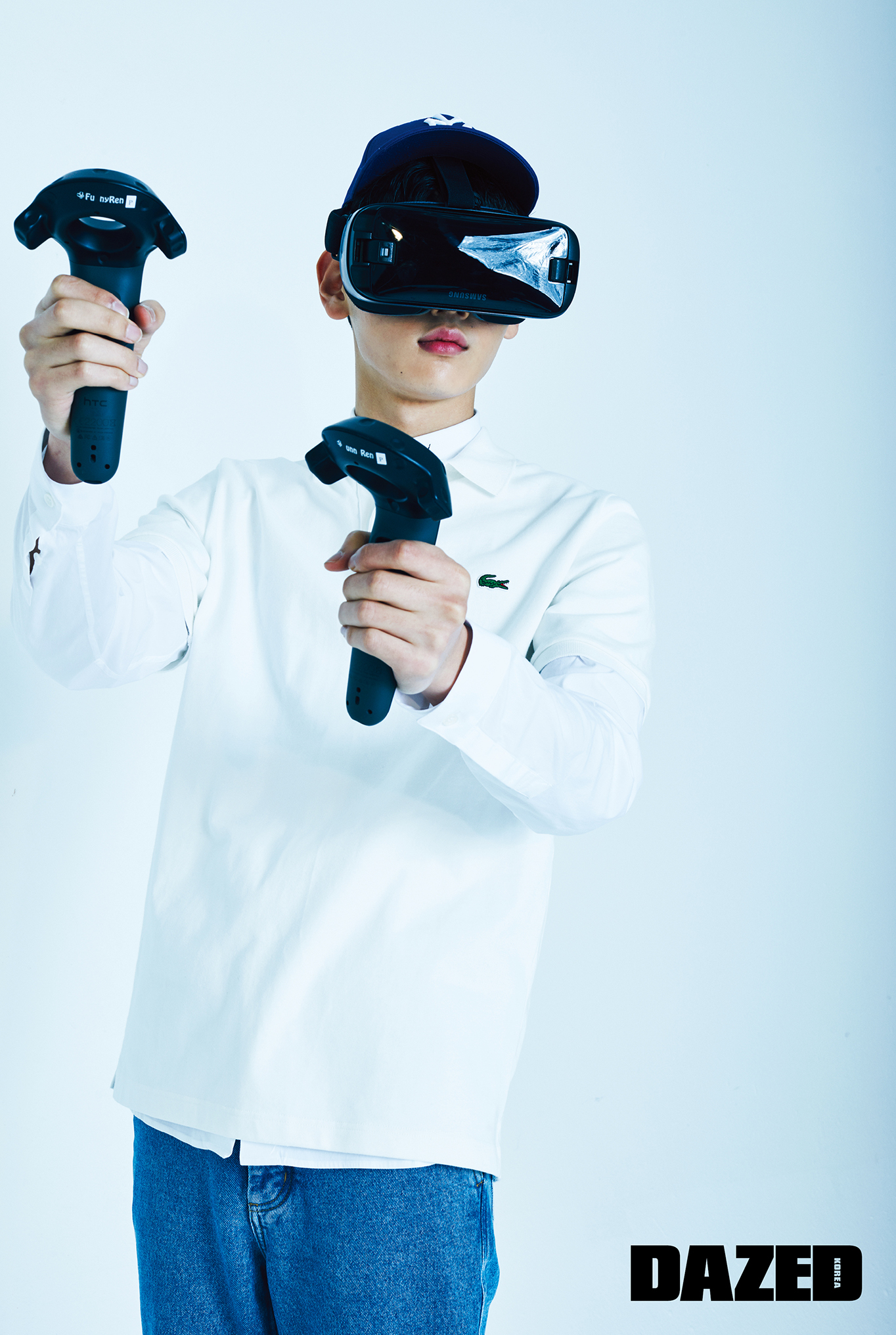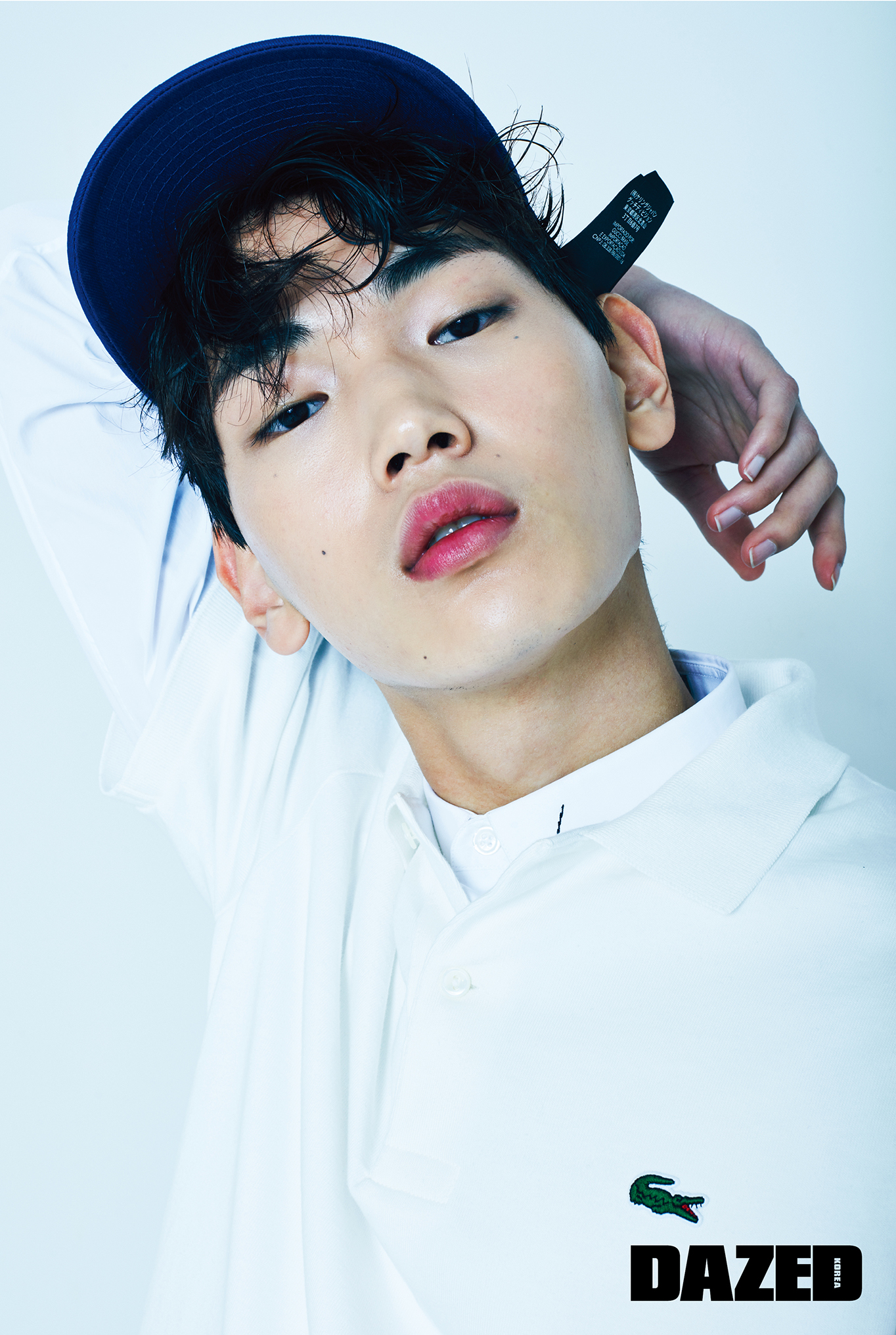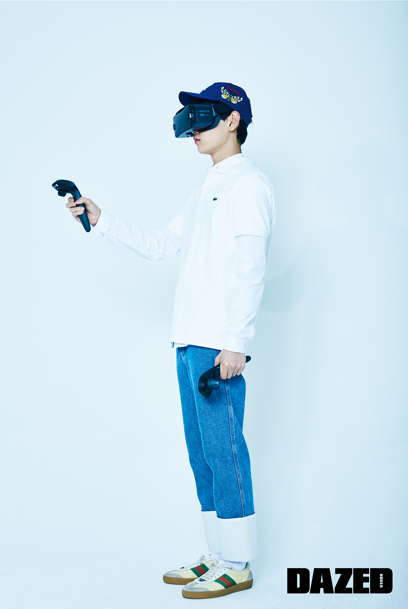 화이트 반팔 피케 셔츠는 라코스테(Lacoste), 안에 입은 화이트 셔츠는 디올 옴므(Dior Homme), 밑단을 접은 데님 팬츠는 로에베(Loewe), 스니커즈는 구찌(Gucci).