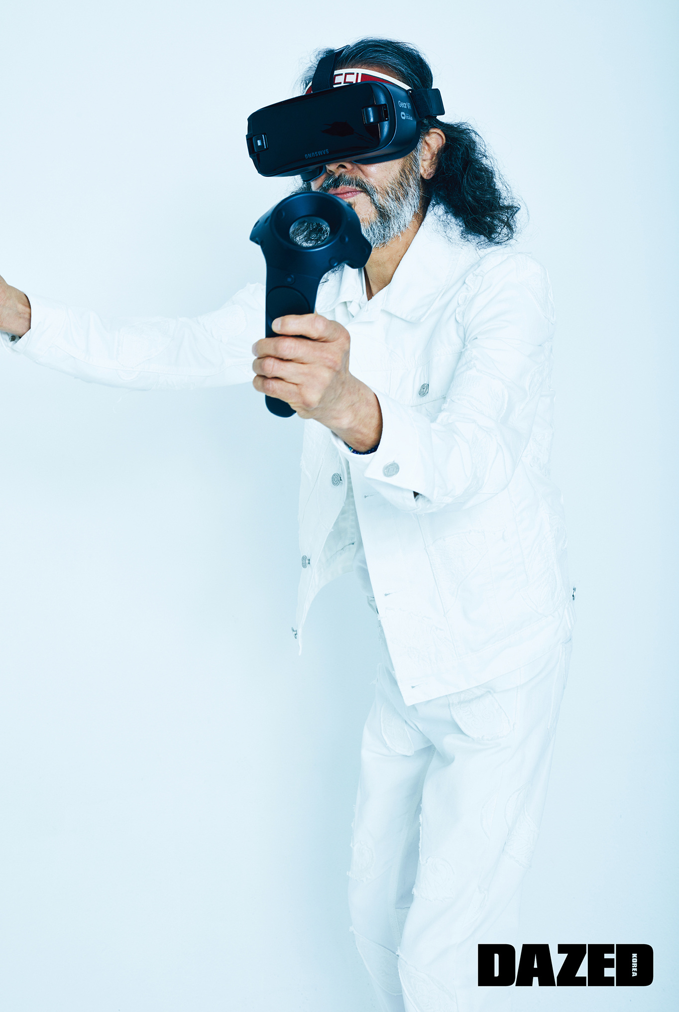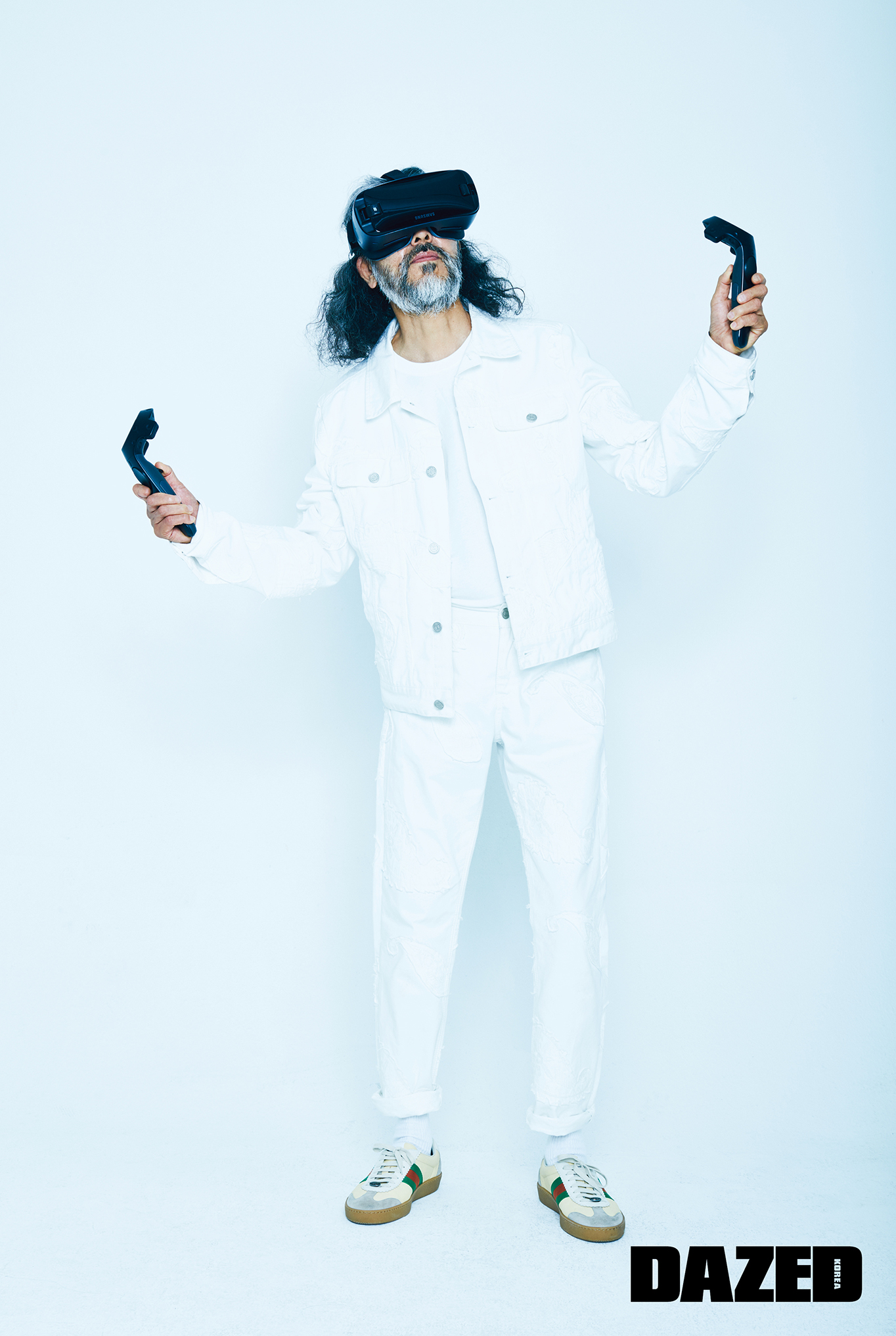 화이트 데님 재킷과 팬츠는 우영미(Woo Young Mi), 안에 입은 티셔츠는 유니클로(Uniqlo),