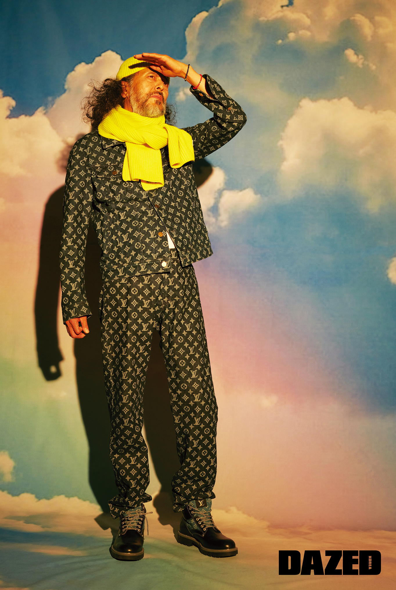 로고 플레이 데님 재킷과 팬츠, 워커, 네온 컬러 비니, 머플러는 모두 루이 비통(Louis Vuitton).