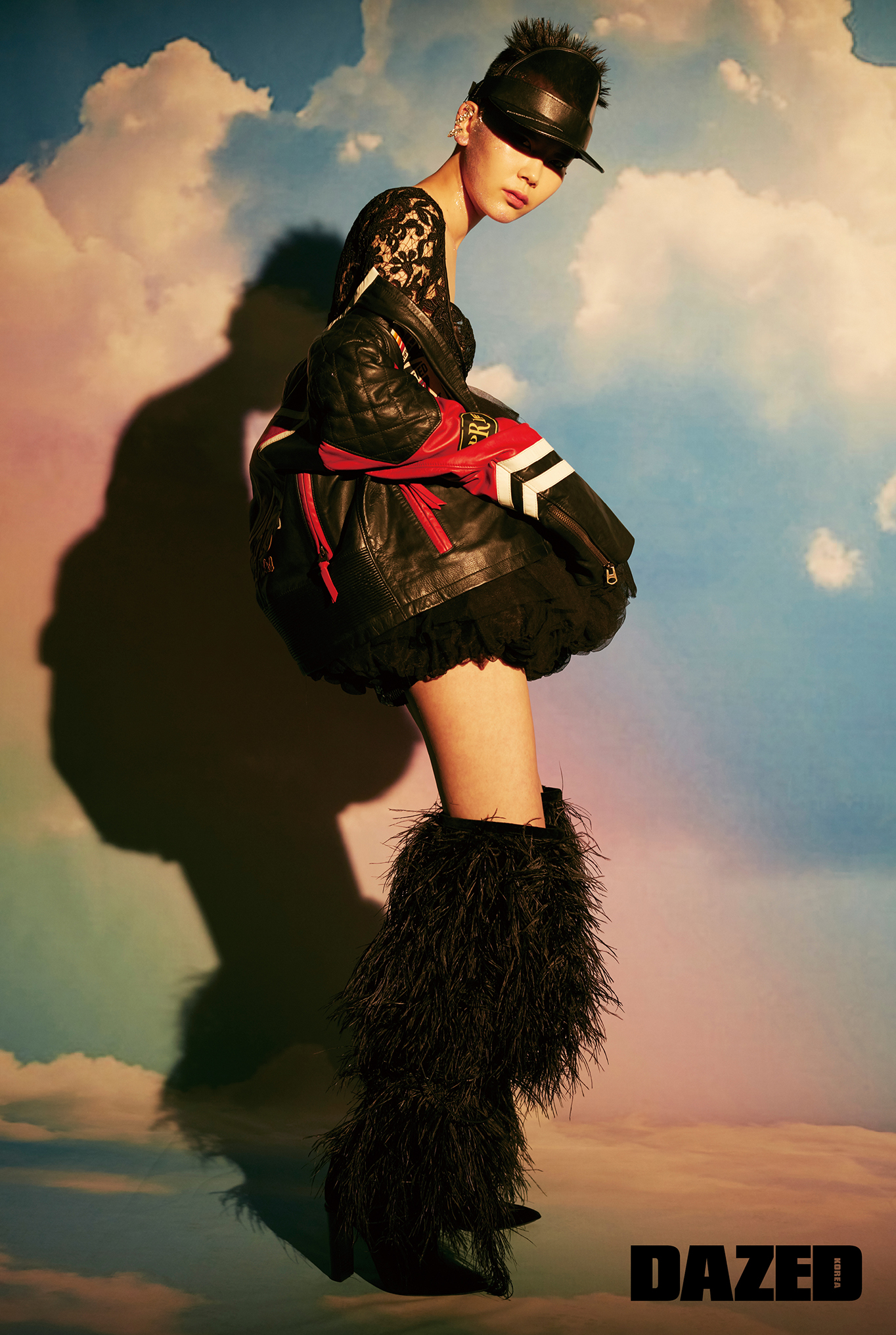 레이스 캉캉 드레스와 타조 깃털 부츠, 이어 커프는 모두 생 로랑 by 안토니 바카렐로(Saint Laurent by Anthony Vacarello), 모터사이클 라이더 재킷은 랄프 로렌(Ralph Lauren), 선바이저는 오프화이트(Off-white).