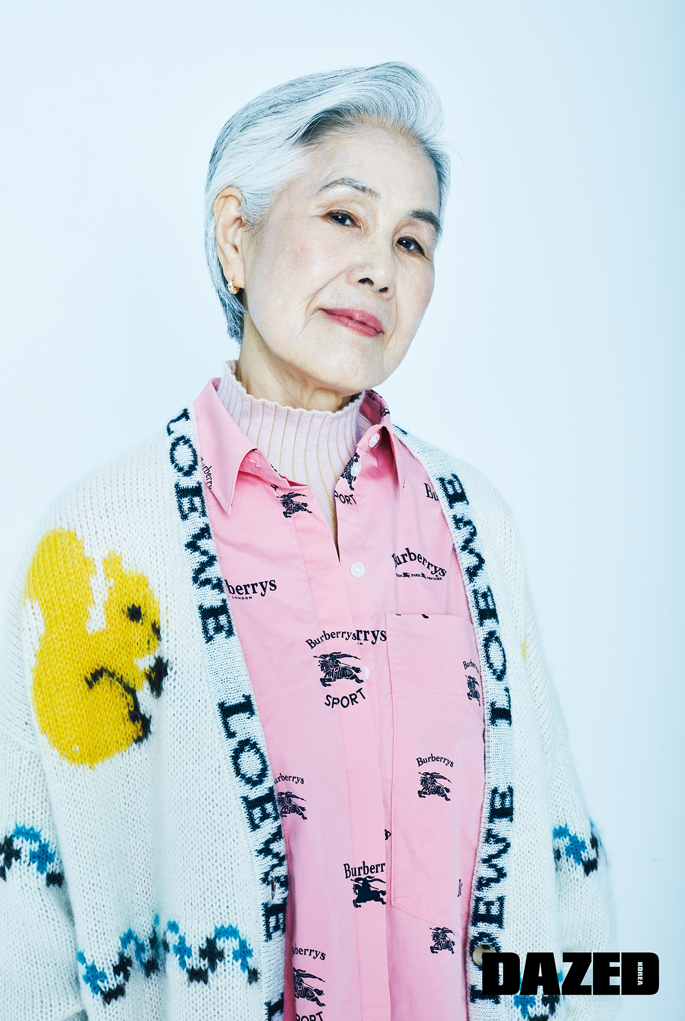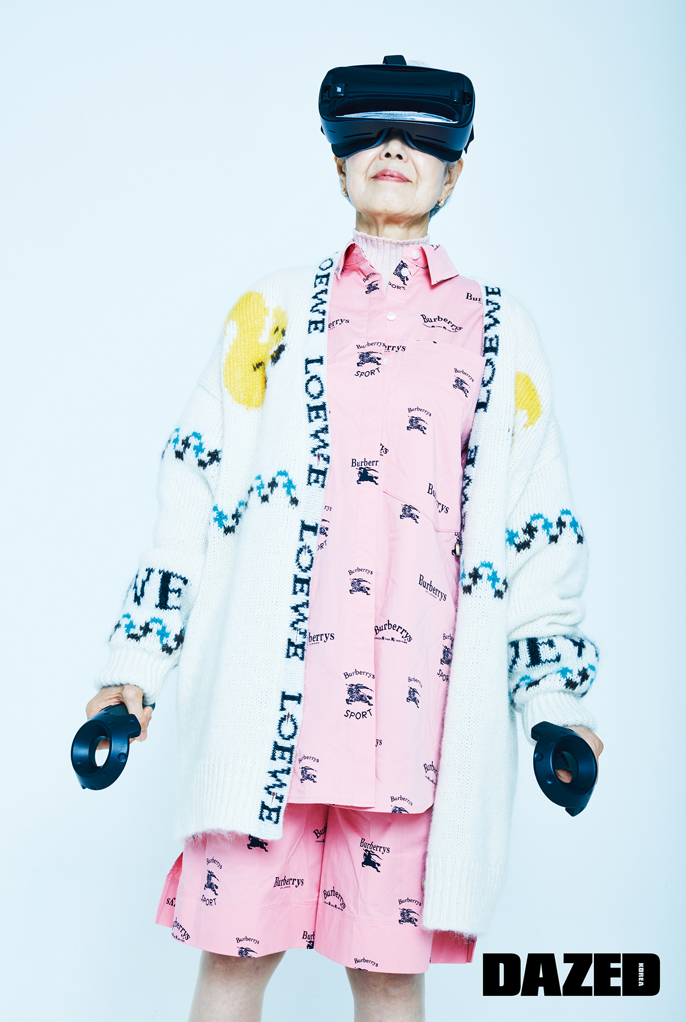 터틀넥 톱과 로고 프린트 셔츠, 팬츠는 모두 버버리(Burberry), 패턴 니트 카디건은 로에베(Loewe),