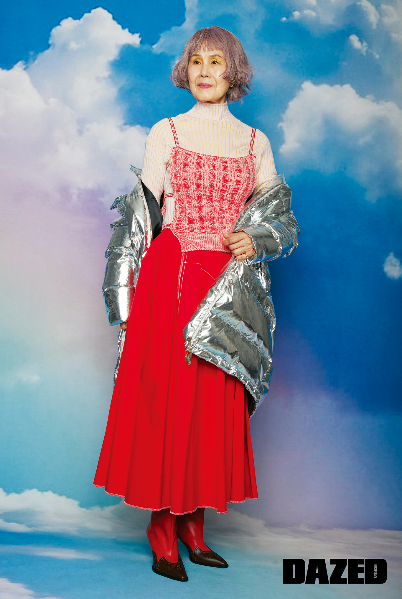 터틀넥 톱은 버버리(Burberry), 레드 니트 뷔스티에와 스커트, 웨스턴 부츠는 모두 니나 리치(Nina Ricci), 실버 푸퍼 패딩은 루이 비통(Louis Vuitton).