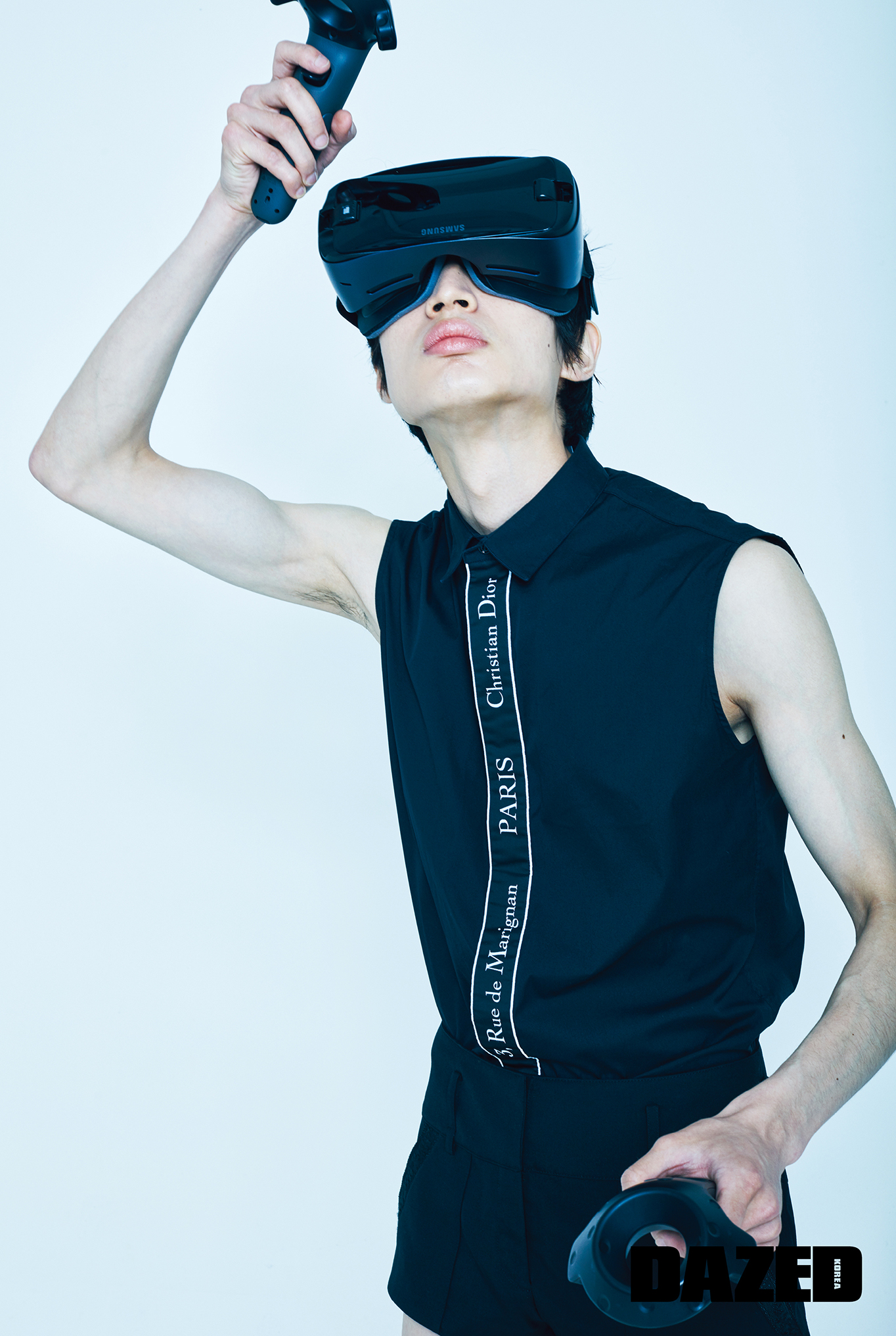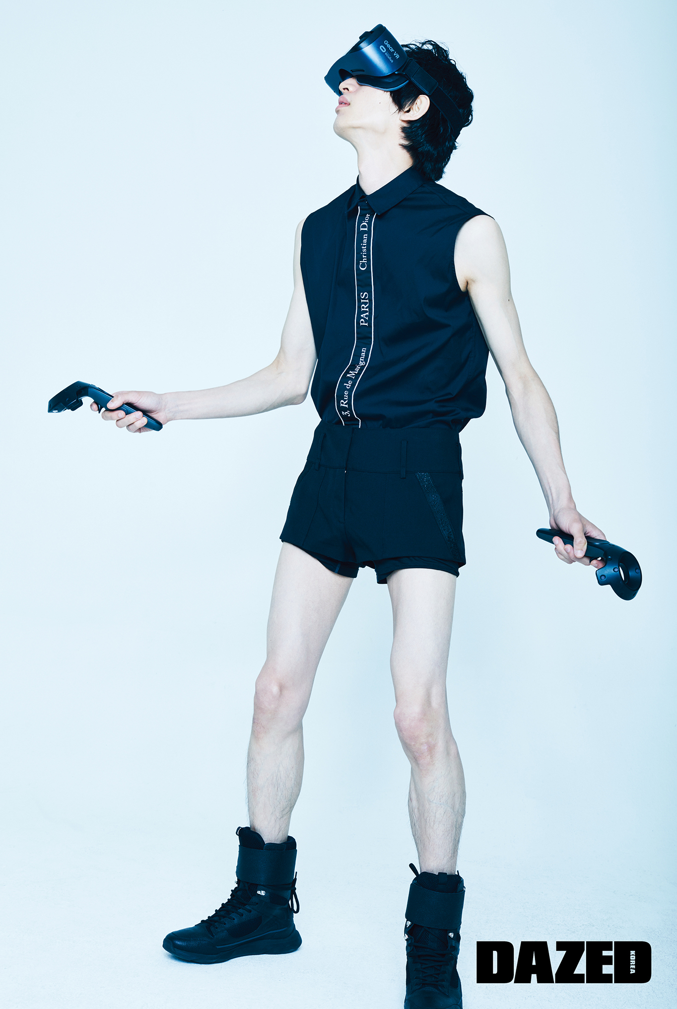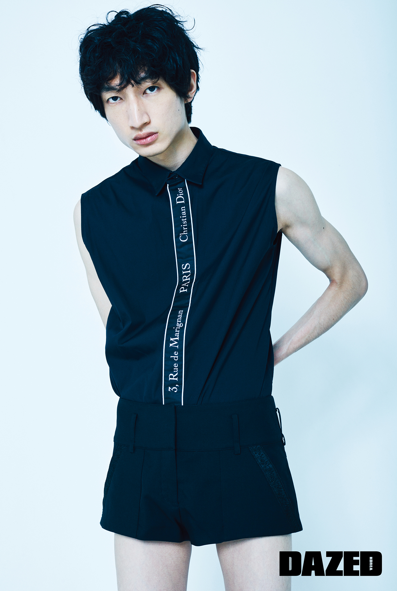 로고 디테일의 민소매 셔츠와 블랙 스니커즈는 디올 옴므(Dior Homme), 블랙 쇼츠는 생 로랑 by 안토니 바카렐로