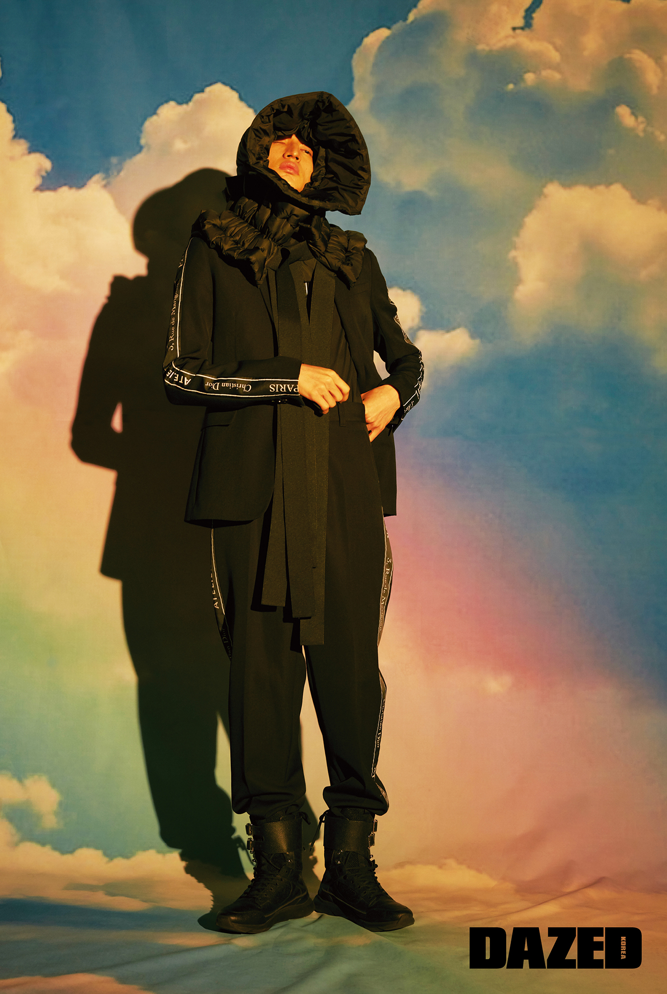 로고 파이핑이 특징인 셔츠와 재킷, 팬츠, 스니커즈는 모두 디올 옴므(Dior Homme), 패딩 후디와 머플러는 몽클레르 C(Moncler C).