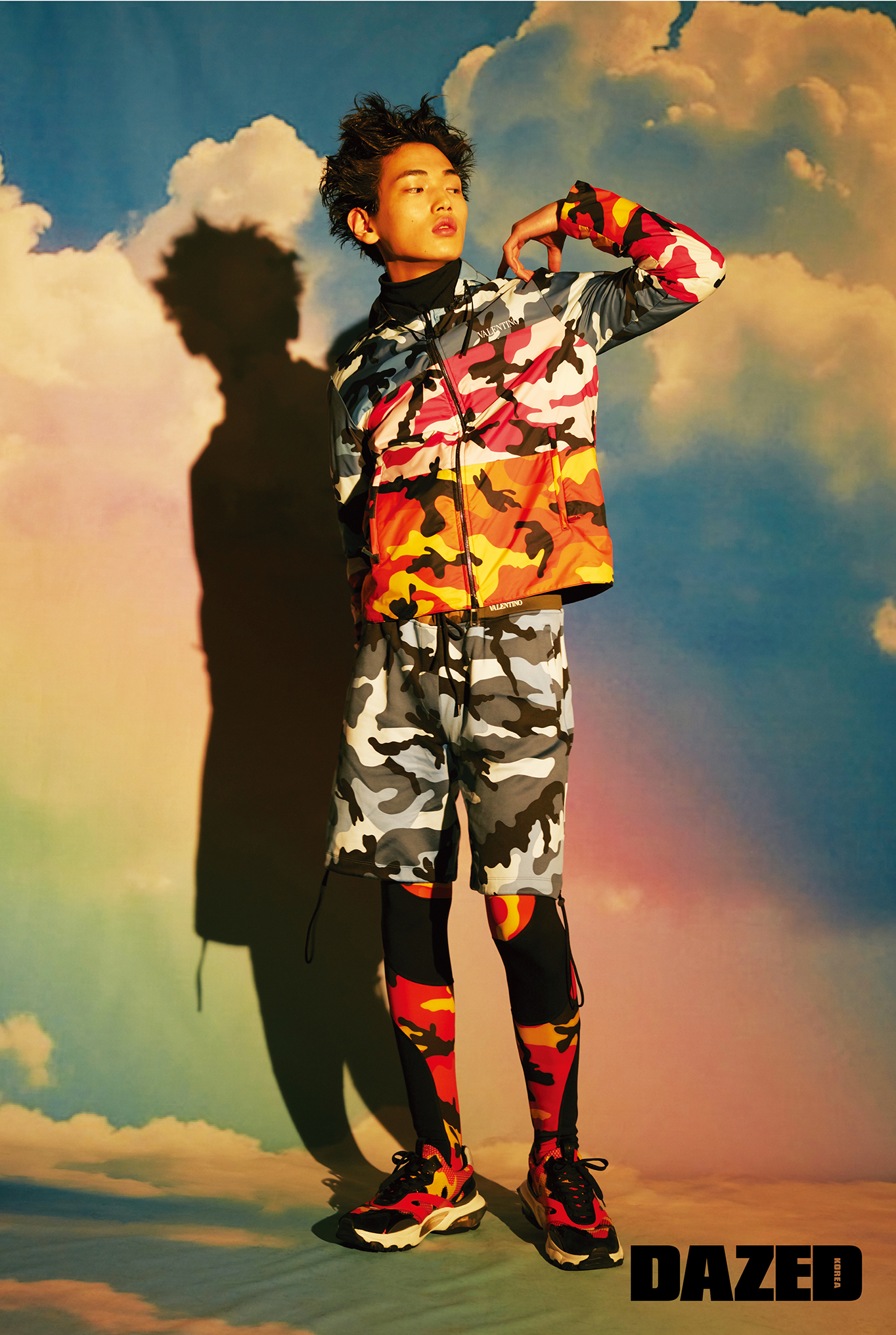 안에 입은 터틀넥 톱과 레깅스, 카무플라주 패턴 점퍼와 팬츠는 발렌티노(Valentino), 스니커즈는 발렌티노 가라바니(Valentino Garabani).