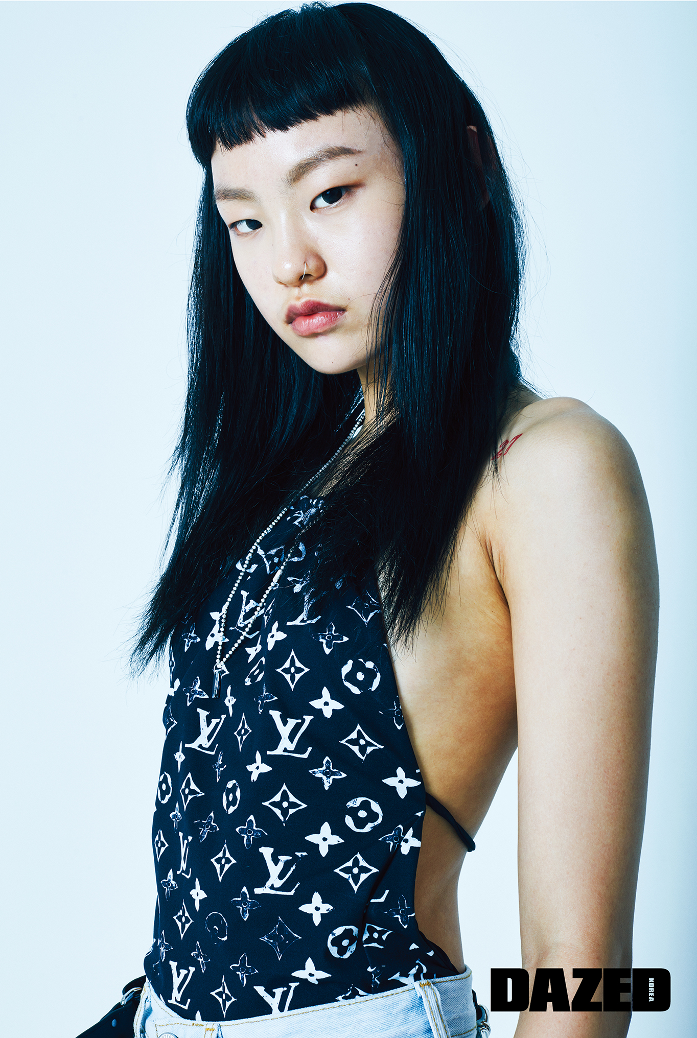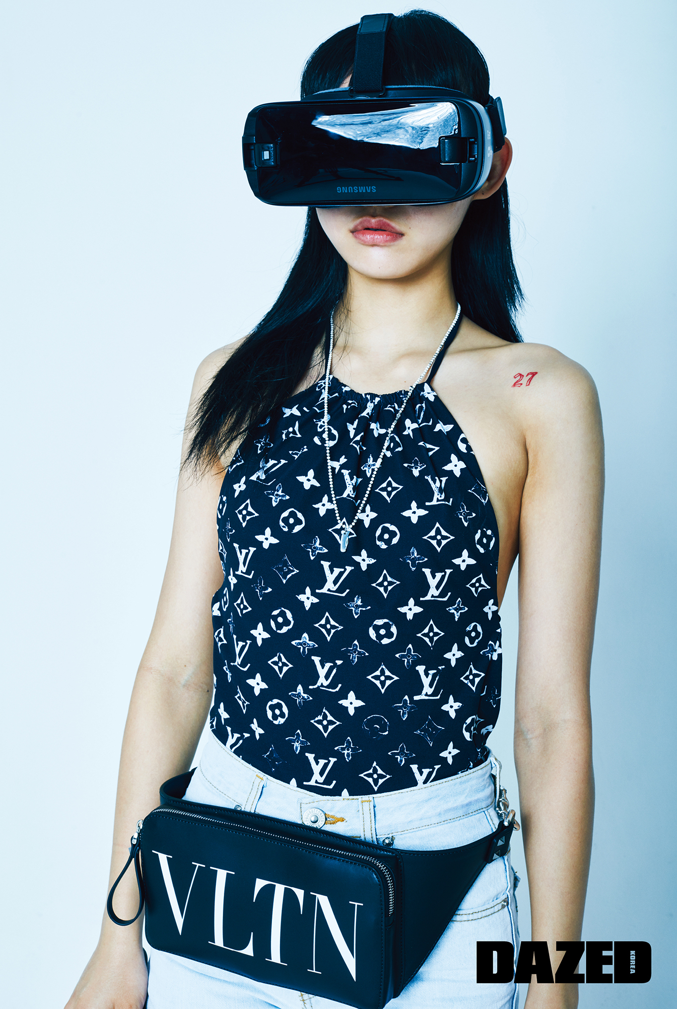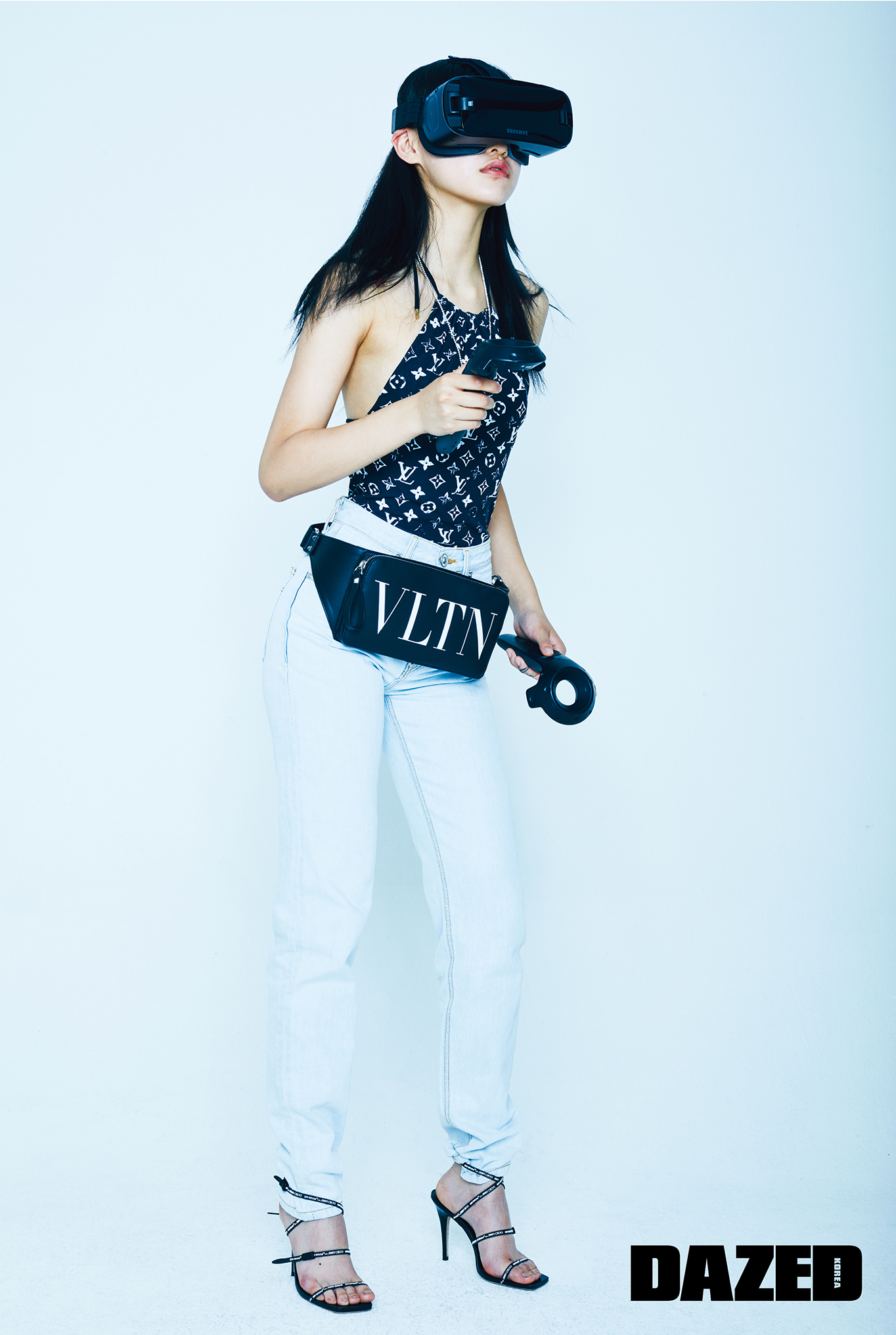 로고 스윔슈트는 루이 비통(Louis Vuitton), 데님 팬츠는 푸시 버튼(Push Button), 로고 디테일의 스트랩 샌들은 오프화이트x지미추 (Off-whitexJimmy Choo), 로고 패니 백은 발렌티노 가라바니(Valentino Garavani), 네크리스는 모델이 착용하고 온 것.