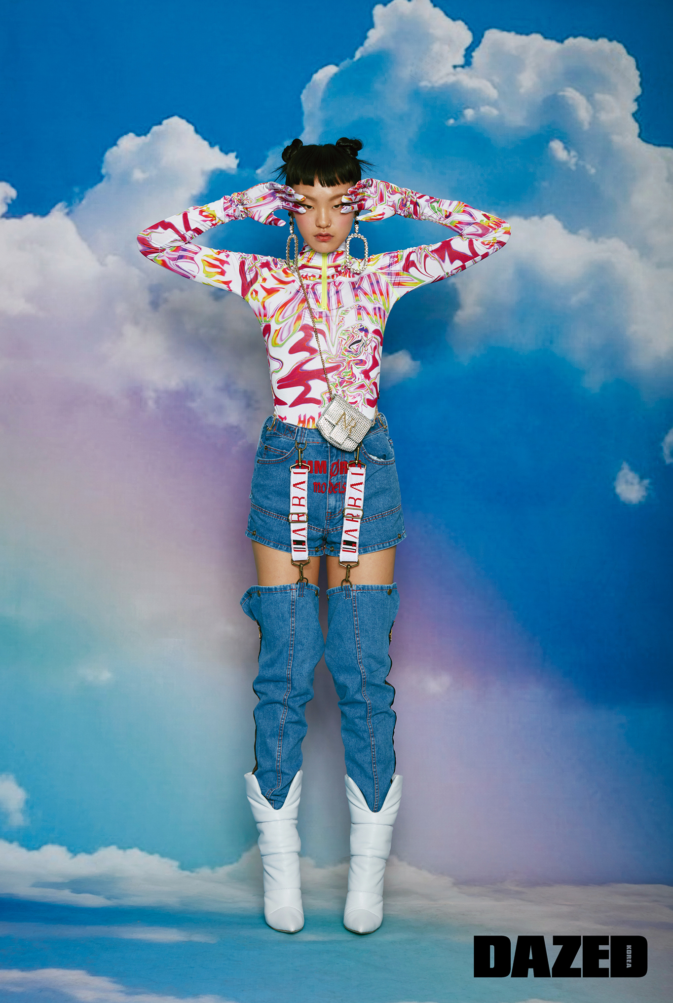 팝한 컬러감의 보디슈트와 커팅 데님 팬츠는 스쿠읏(Skoot), 화이트 패딩 부츠는 오프화이트 X 지미추 (Off-white X Jimmy Choo), 프티 사이즈의 체인 숄더백은 니나 리치(Nina Ricci), 드롭 이어링은 생 로랑 by 안토니 바카렐로(Saint Laurent by Anthony Vacarello).