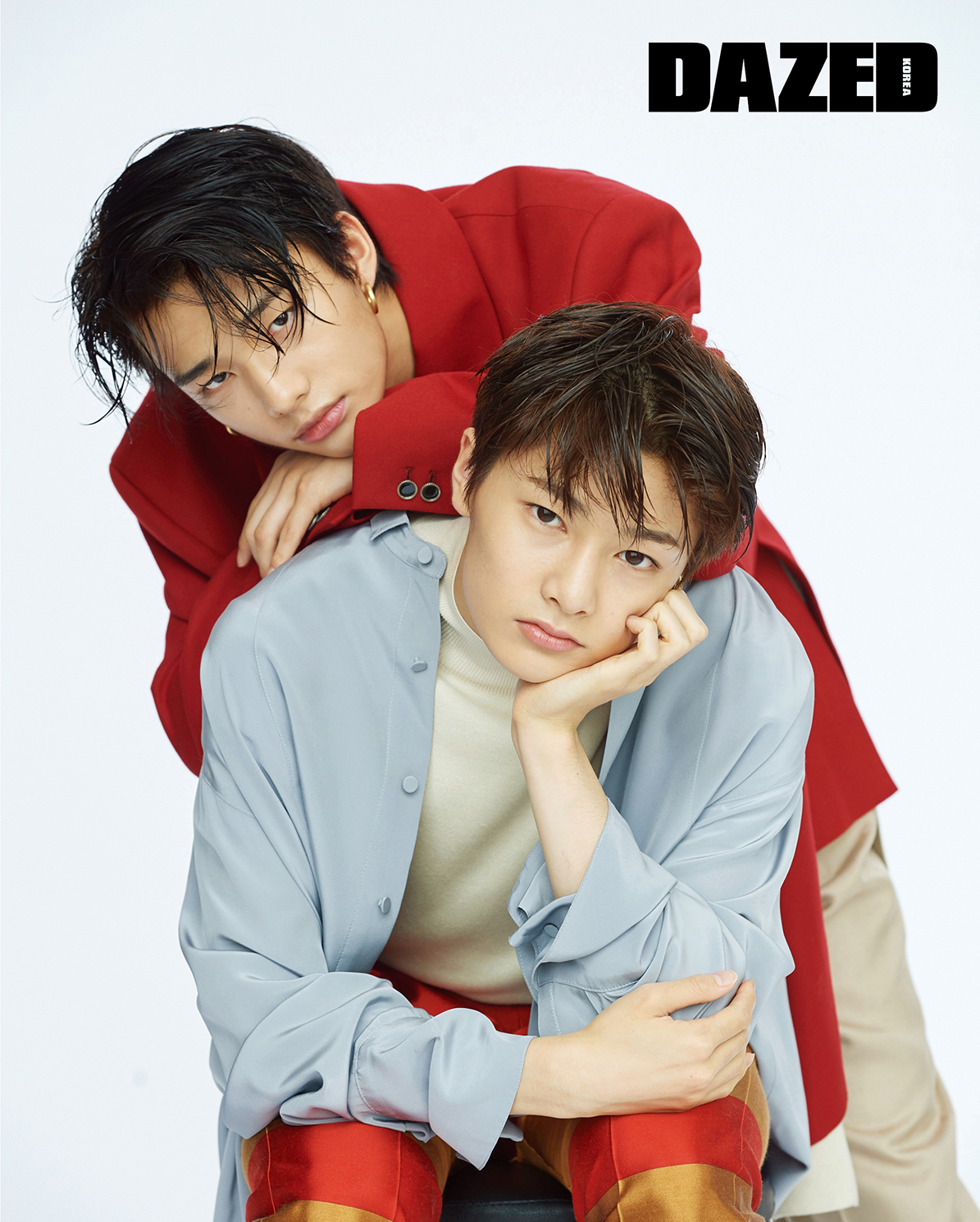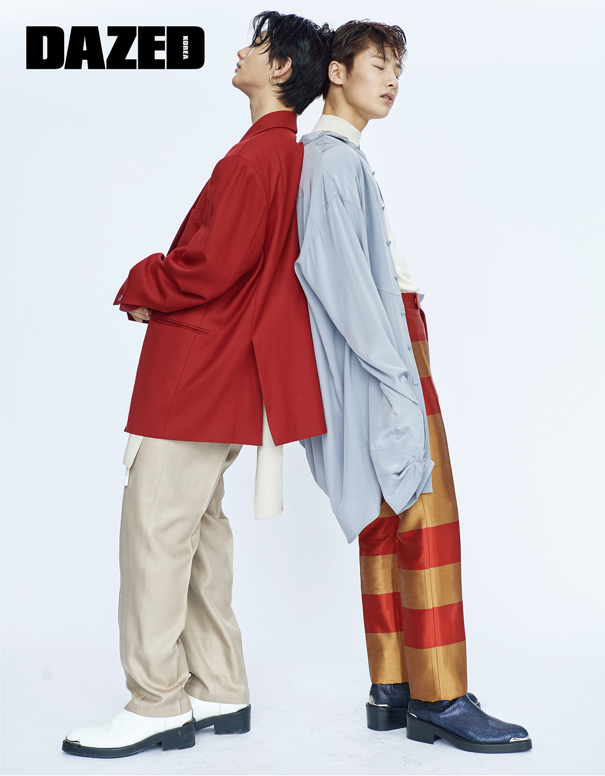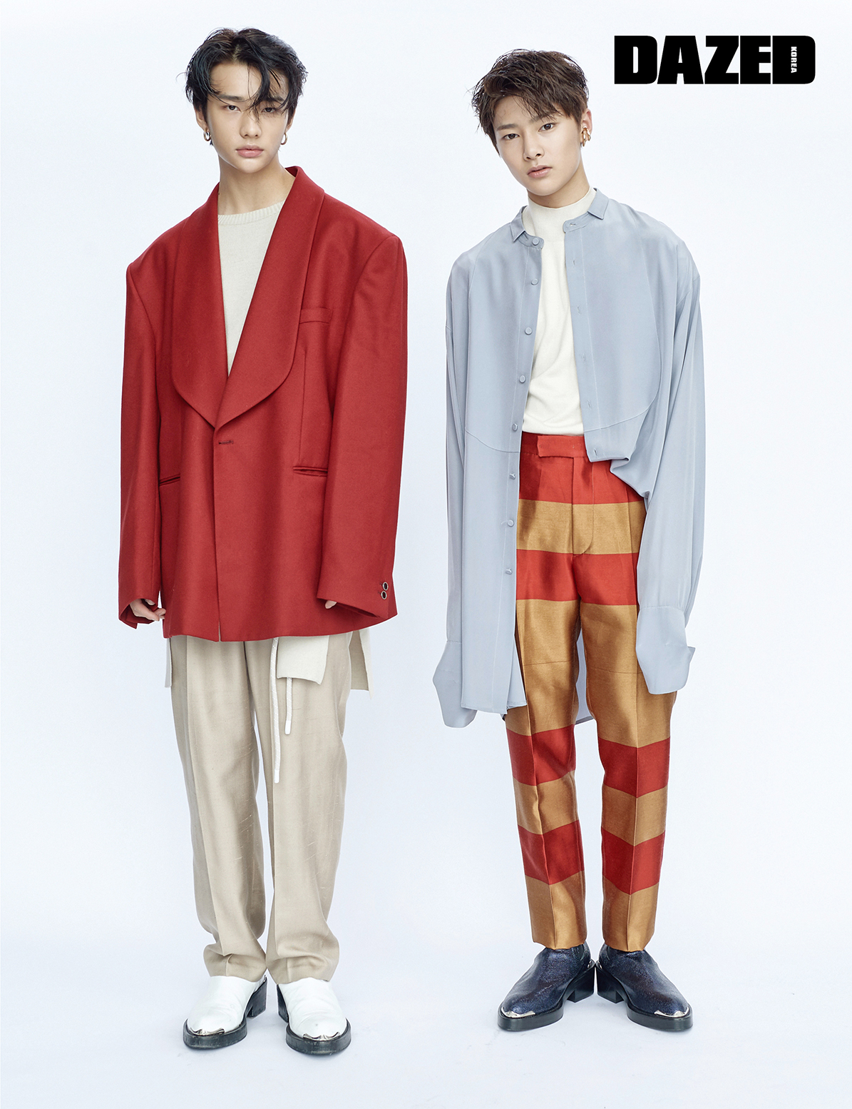 현진이 입고 신은 레드 숄칼라 재킷, 첼시 부츠는 오디너리 피플(Ordinary People), 이너로 입은 니트 베스트는 얼킨(Ul:Kin), 베이지 컬러 와이드 팬츠는 김서룡(Kimseoryong), 이어링은 포트레이트 리포트(Portrait Report), 아이엔이 입은 그레이 컬러 실크 셔츠, 스트라이프 팬츠는 김서룡(Kimseoryong), 이너로 입은 터틀넥 베스트는 코스(COS), 첼시 부츠는 오디너리 피플(Ordinary People), 이어링은 포트레이트 리포트(Portrait Report).